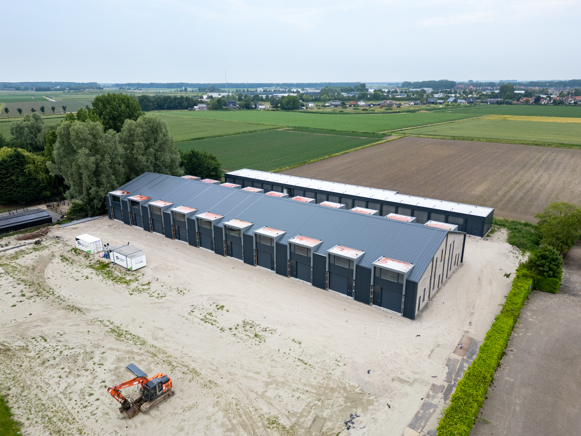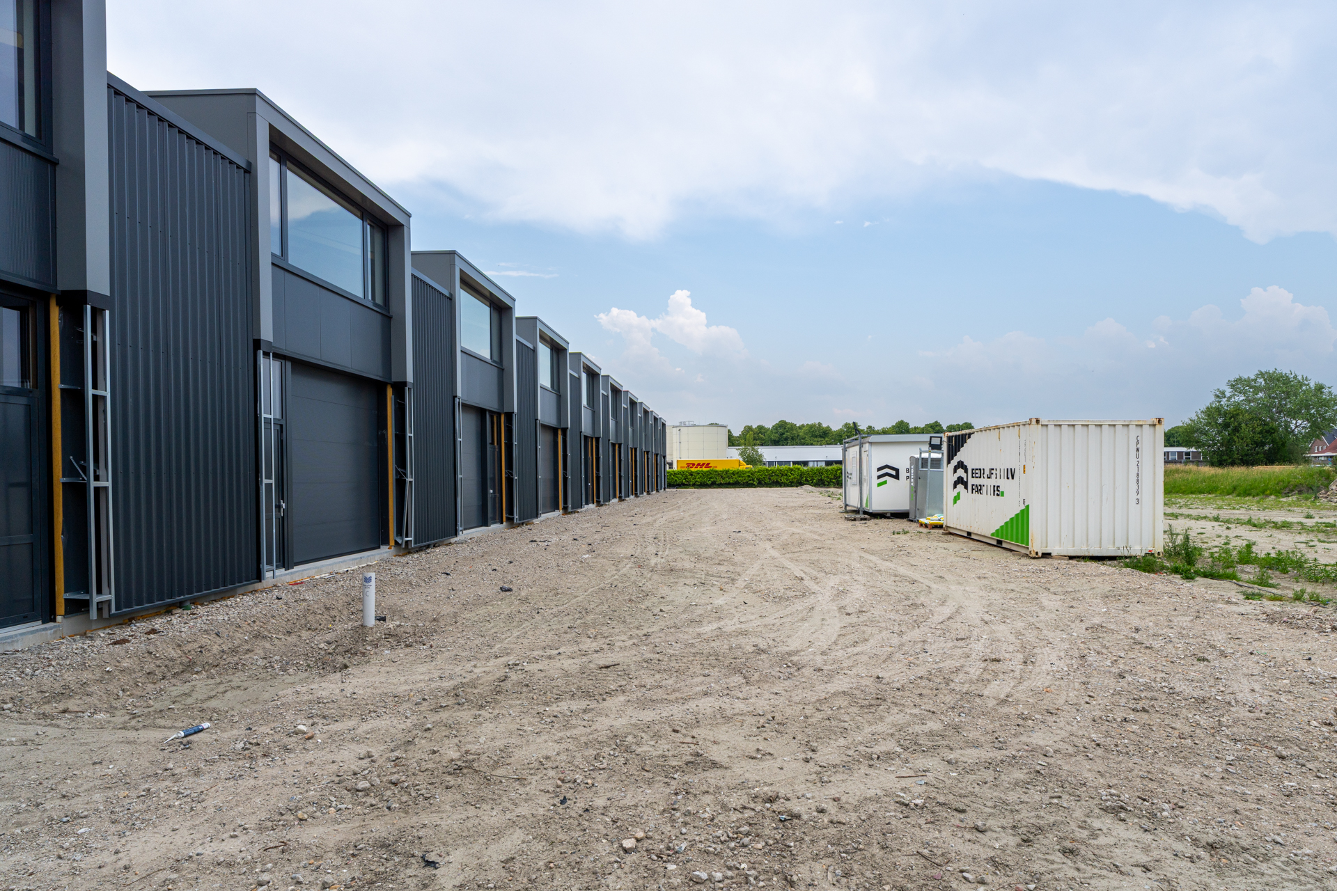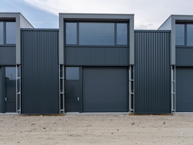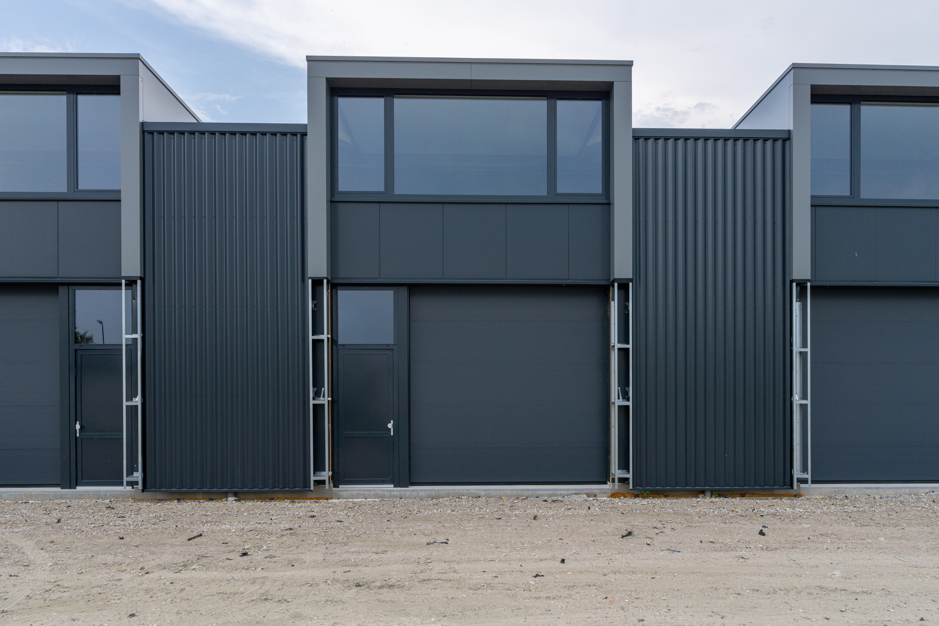 De gevels zijn voorzien van geïsoleerde sandwichpanelen met een moderne industriële uitstraling. De aluminium gevelelementen zijn standaard uitgevoerd met HR++ beglazing en zijn gemonteerd in wit gegronde houten stelkozijnen. Elke unit beschikt over een handbediende overheaddeur met geïntegreerde loopdeur.