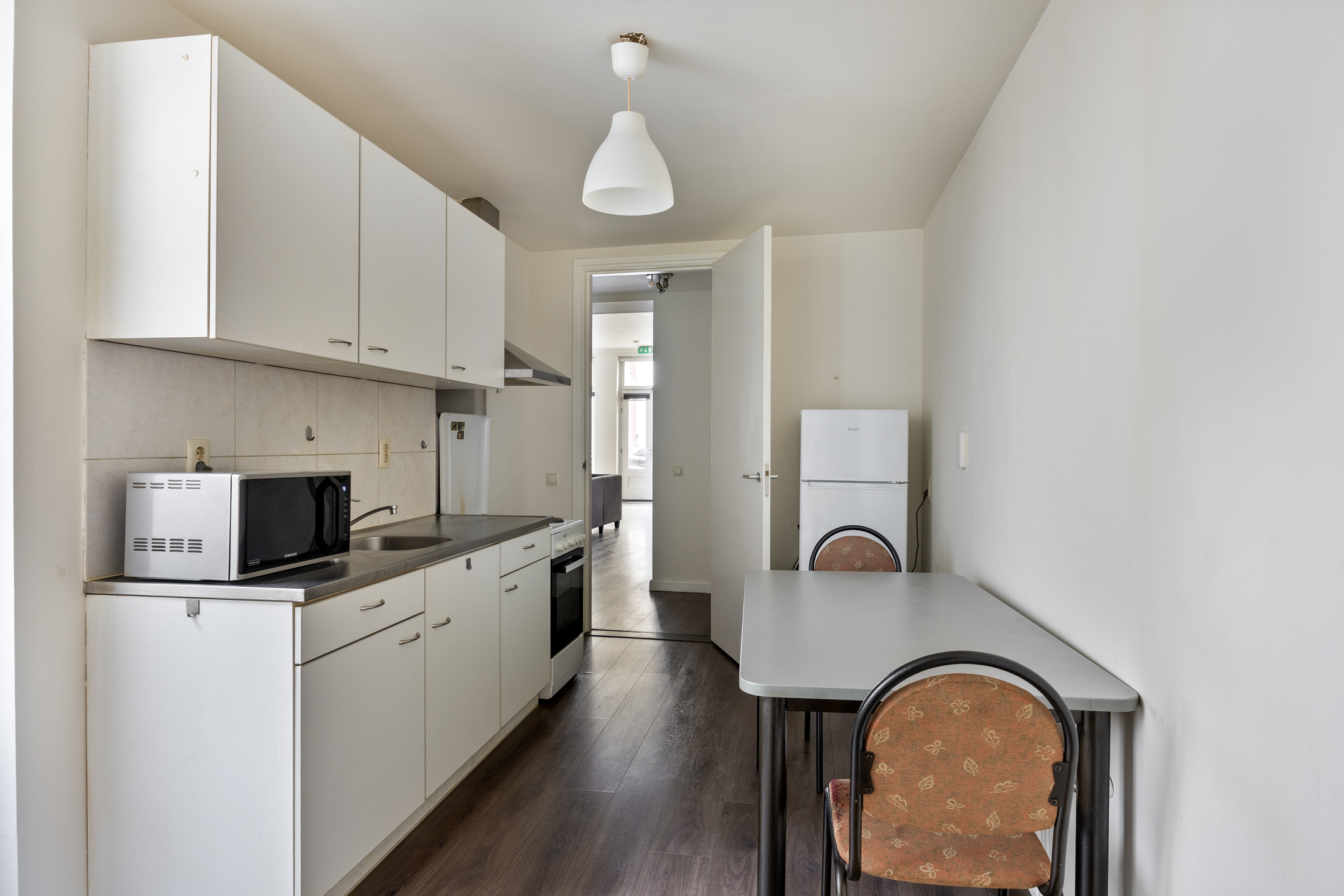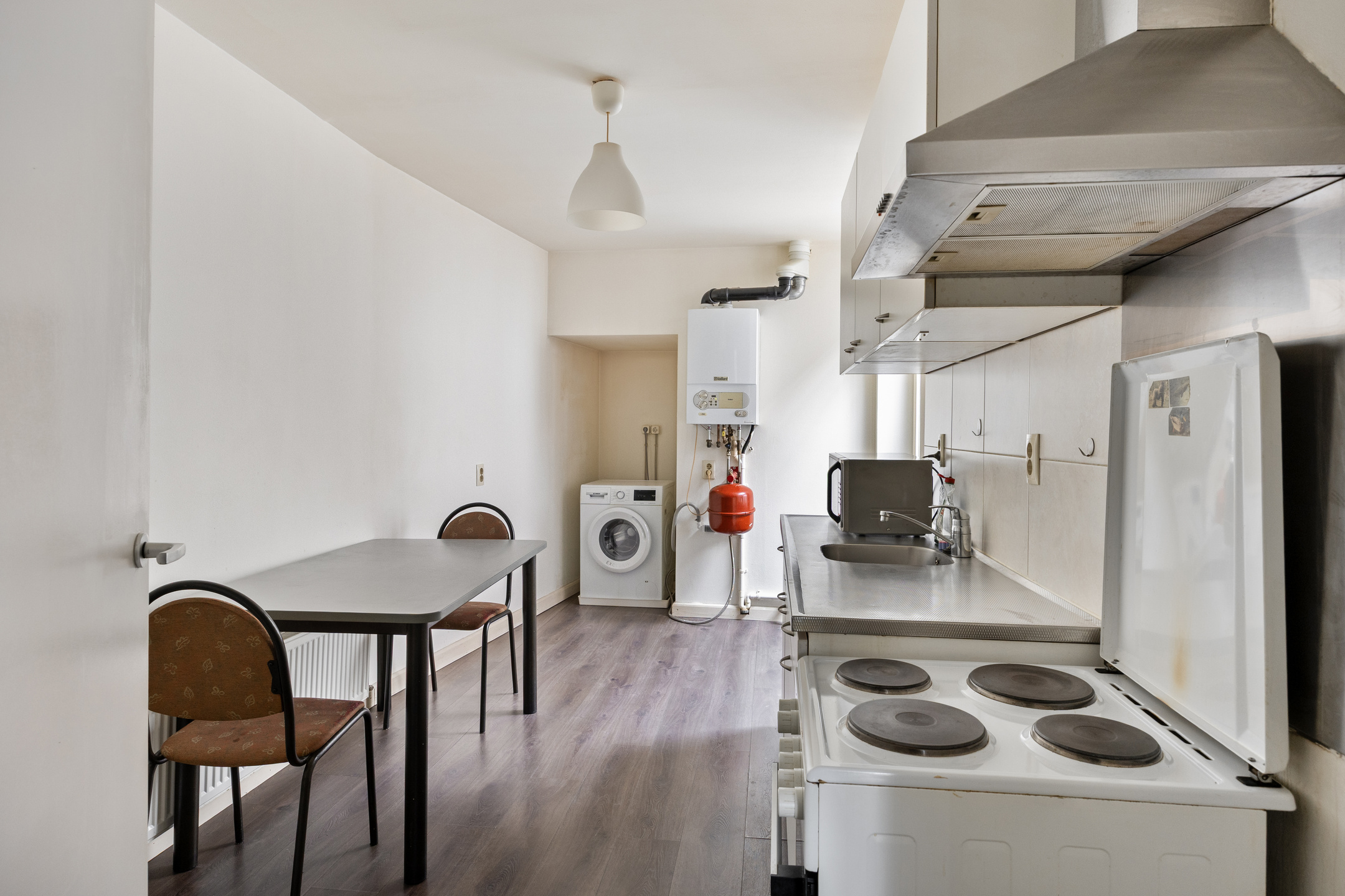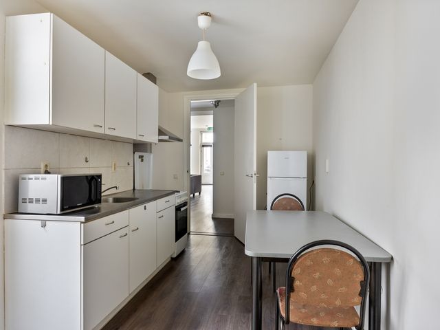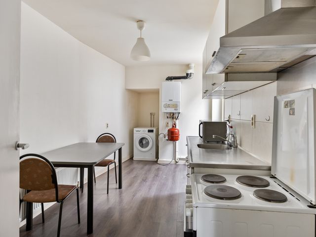 Vanuit de leefruimte bereik je een kleine tussengang met toegang tot de gesloten keuken. De keuken is uitgevoerd in een basis keukenopstelling en bestaat uit een keukenblok met spoelbak, laden en kastruimte. Verder zijn er een losse oven, een 4-pits gasfornuis met afzuigkap, een magnetron en een koelkast aanwezig. Ook bevinden zich hier de aansluitingen voor de wasmachine en de cv-installatie.