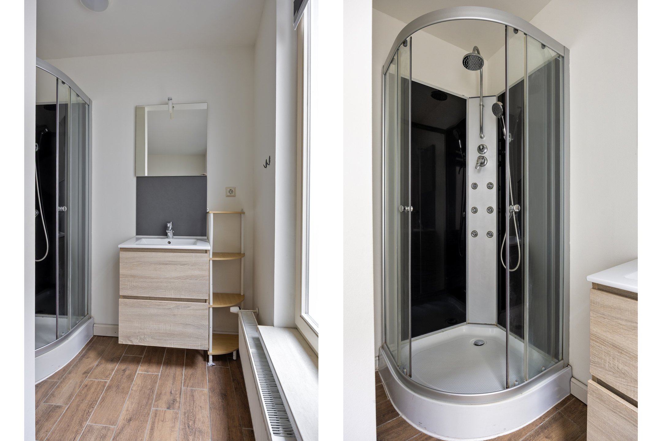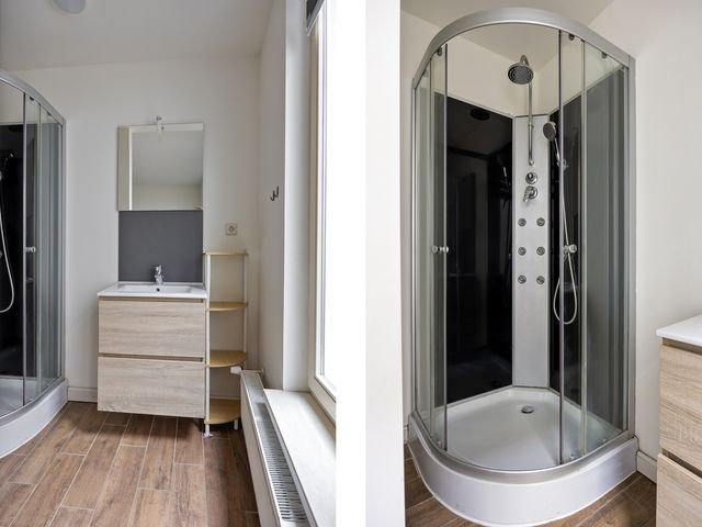 Aan de achterzijde van de woning ligt de slaapkamer. Deze slaapkamer beschikt over een doucheruimte en suite, voorzien van een douchecabine en een wastafelmeubel.