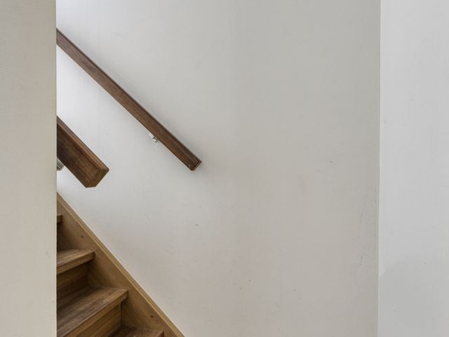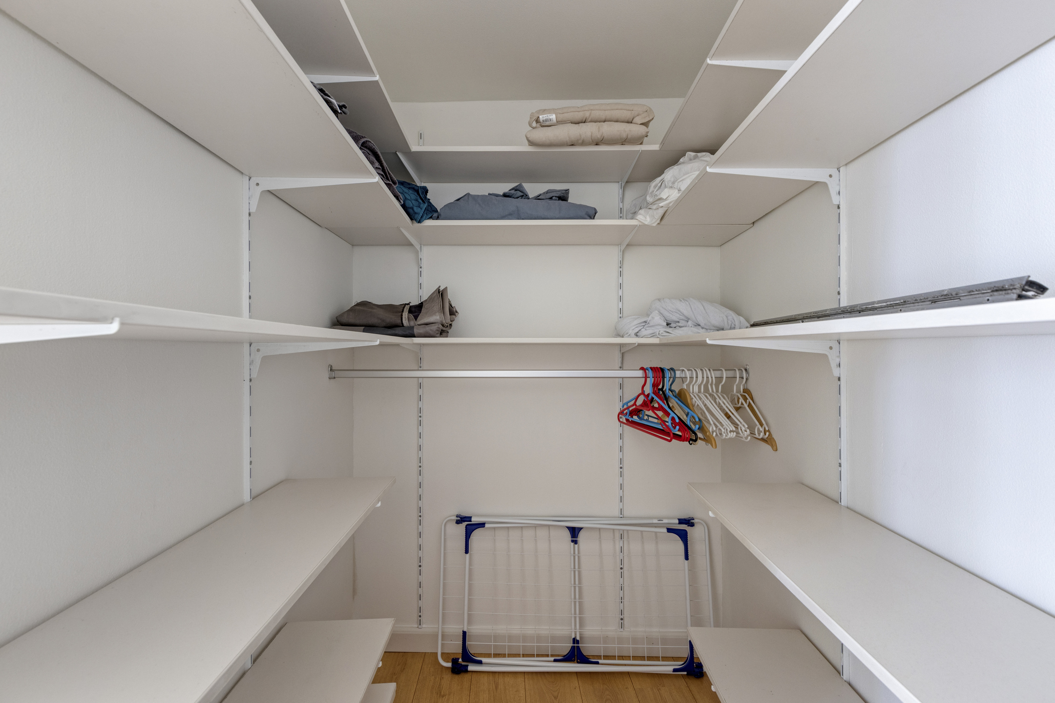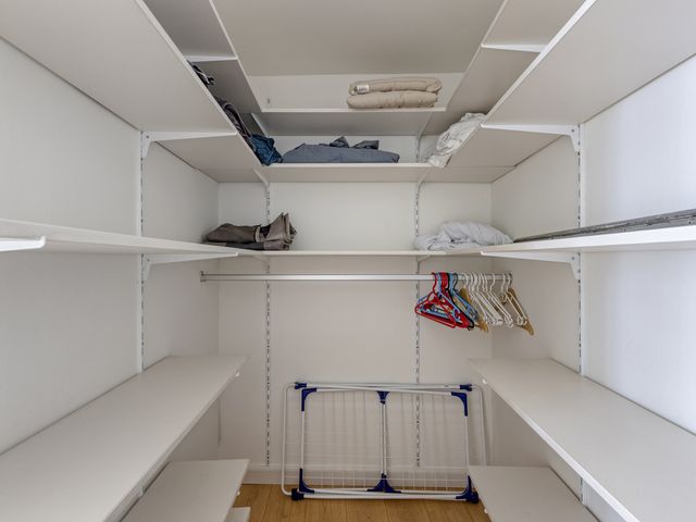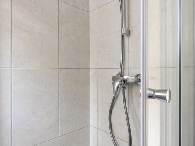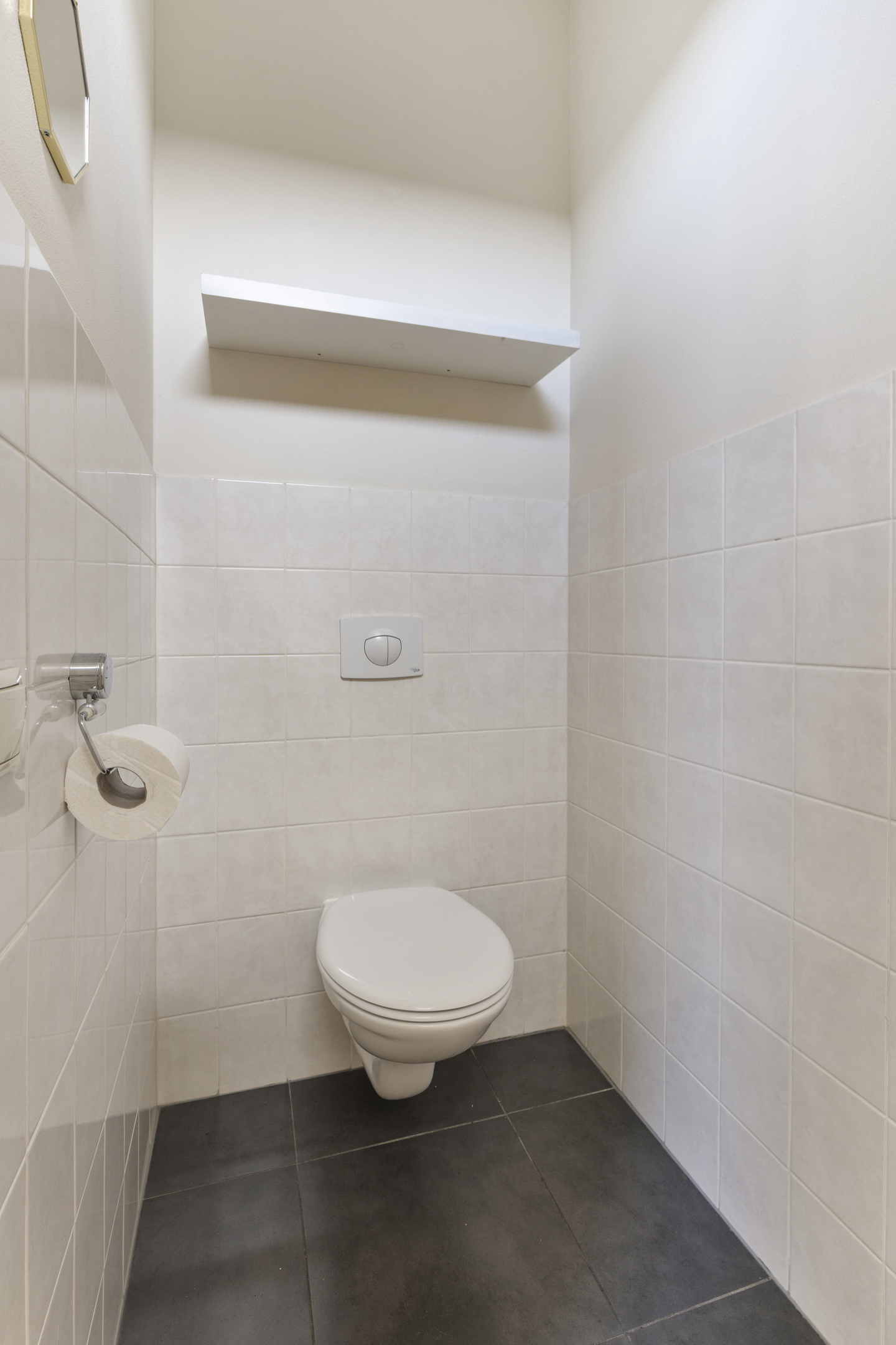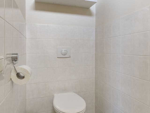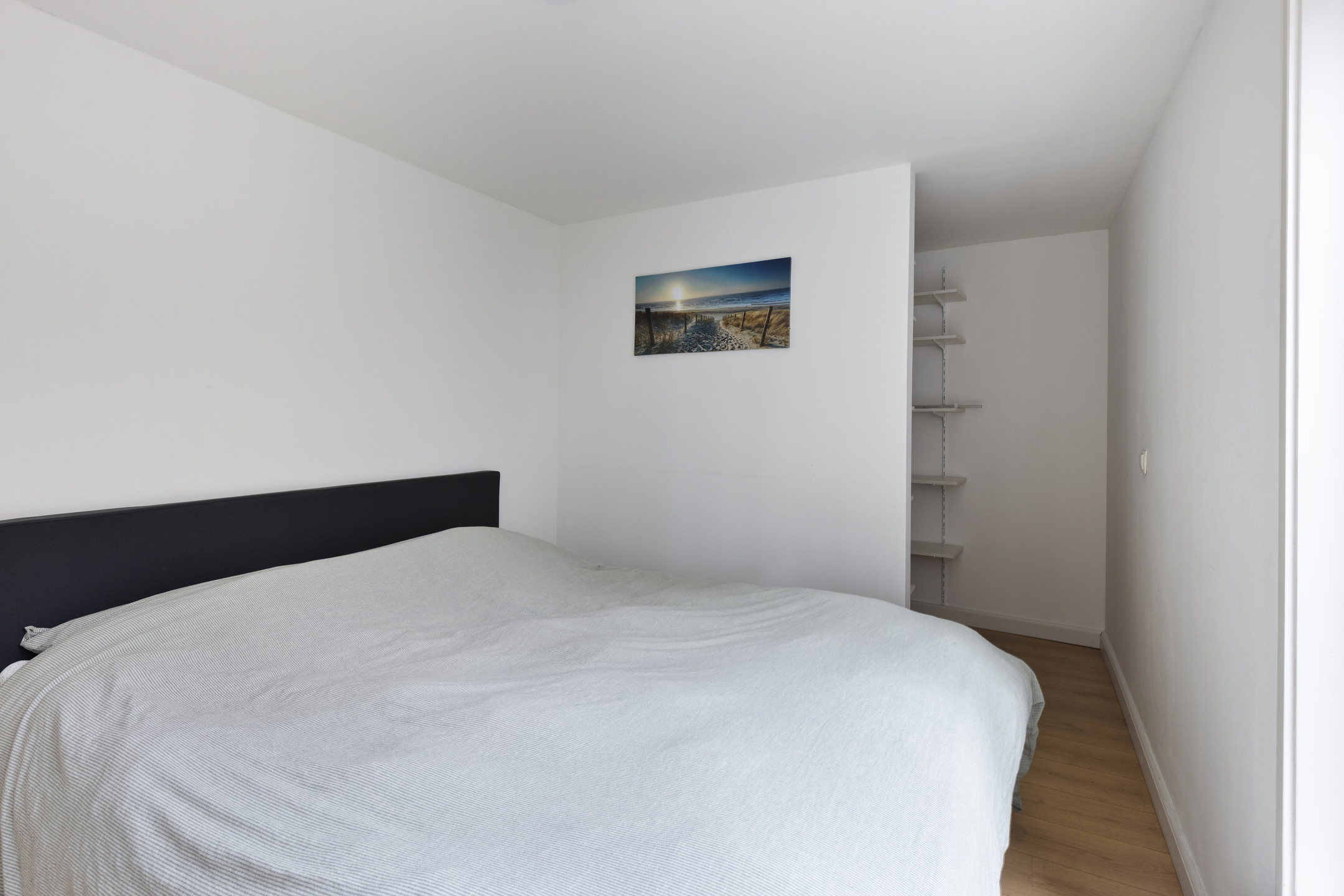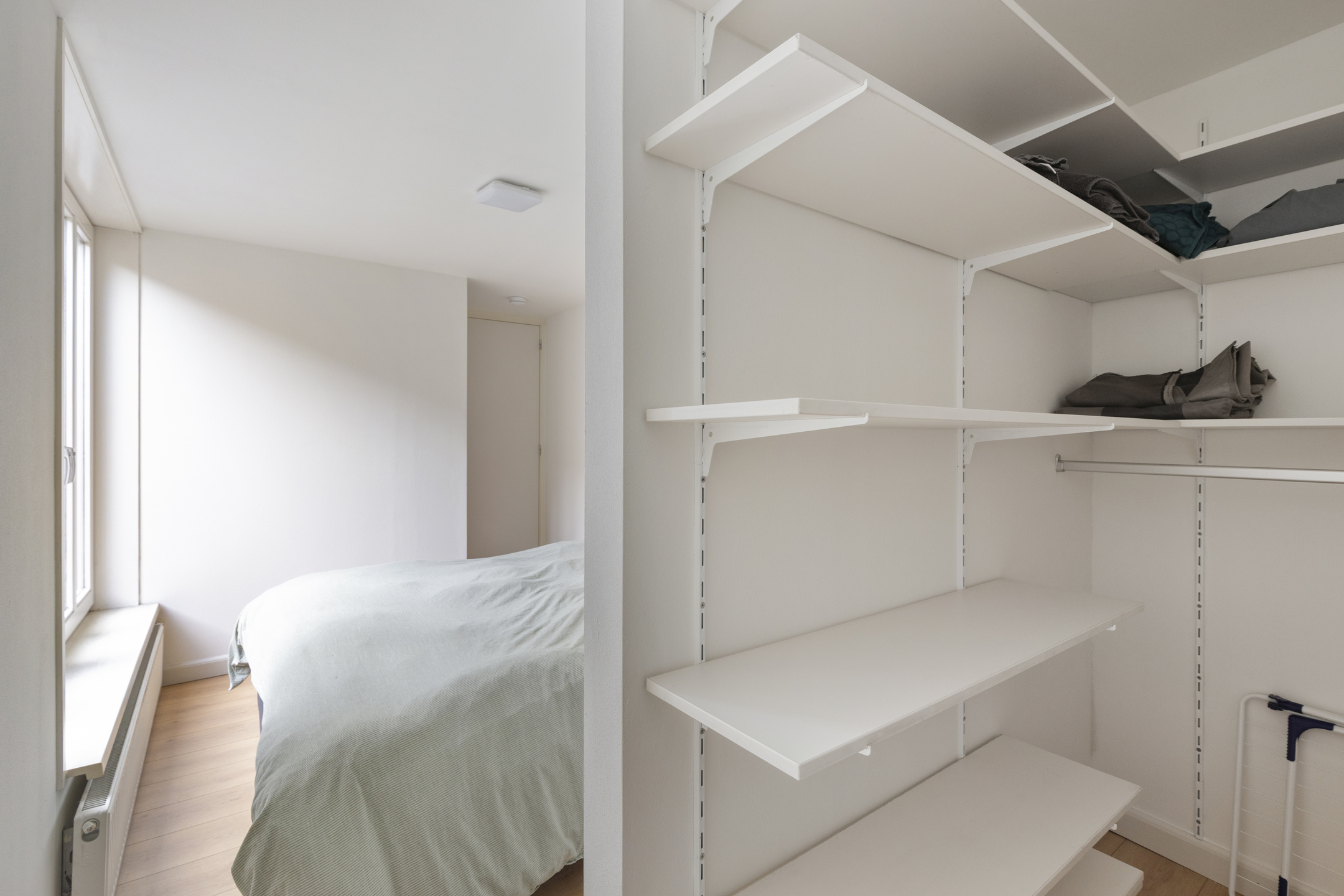 Aan de achterzijde van de woning ligt de slaapkamer. Deze slaapkamer beschikt over een walking closet en een doucheruimte en suite. De badkamer is voorzien van een douchecabine en een wastafelmeubel, wat zorgt voor extra comfort en een praktische indeling.