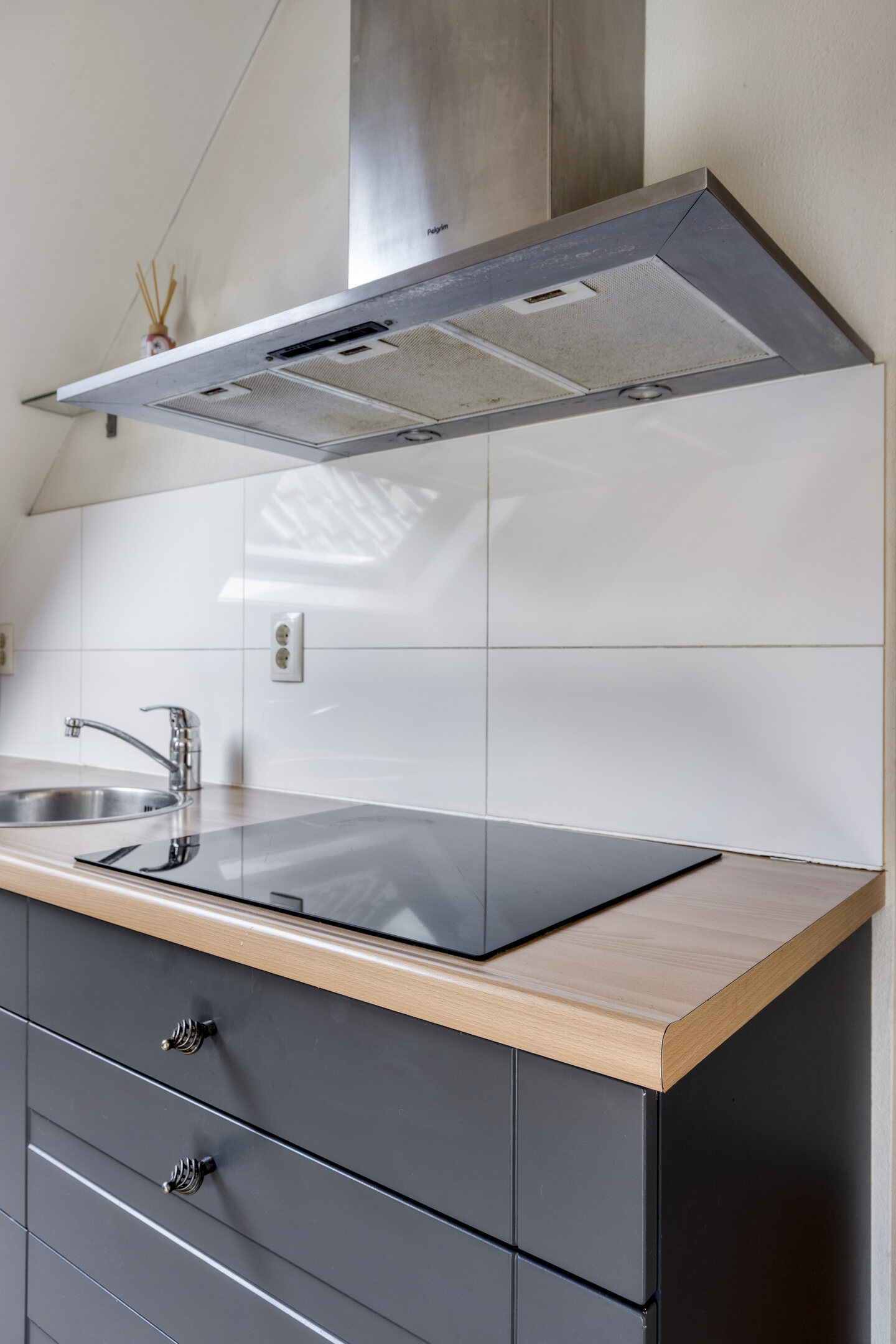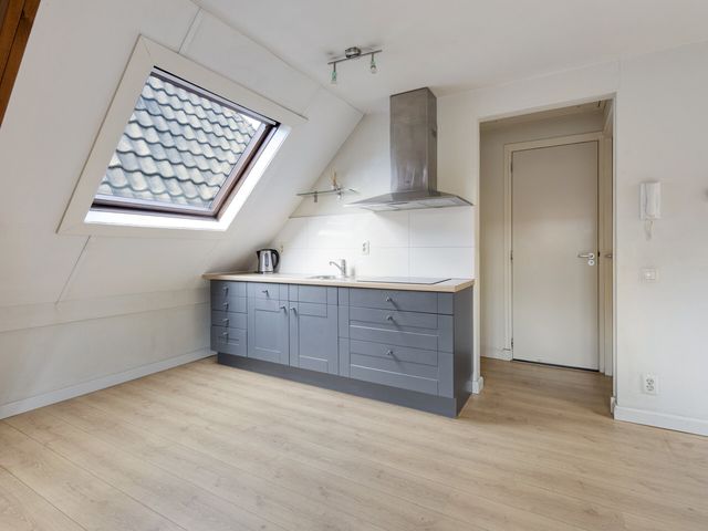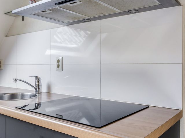 In de leefruimte bevindt zich de open keuken. De keuken is uitgevoerd in een basis keukenopstelling en bestaat uit een keukenblok met spoelbak, kraan, laden en kastruimte. Daarnaast is de keuken voorzien van een inductiekookplaat.