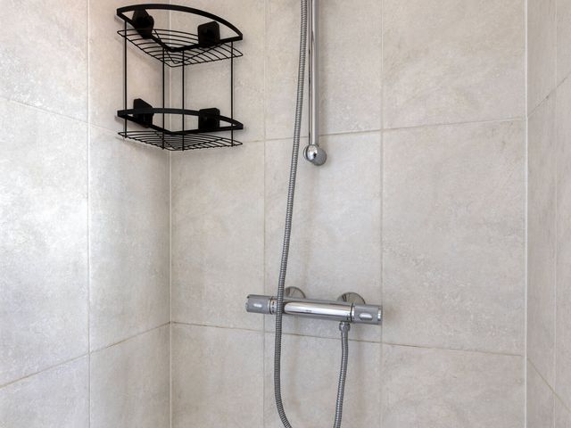 De badkamer is separaat van de slaapkamer en voorzien van een douchecabine en een wastafelmeubel, wat zorgt voor een praktische en functionele indeling.