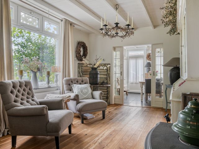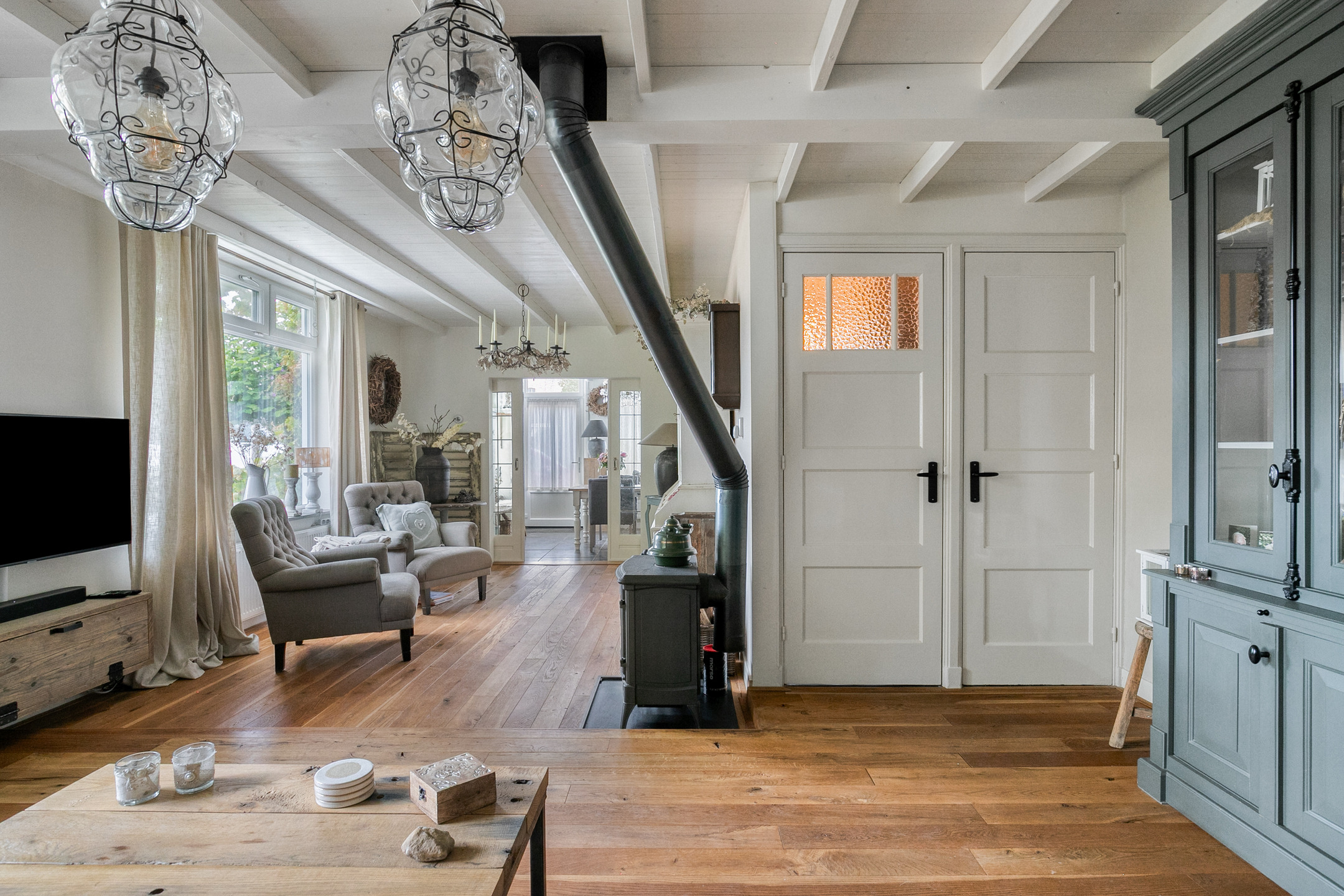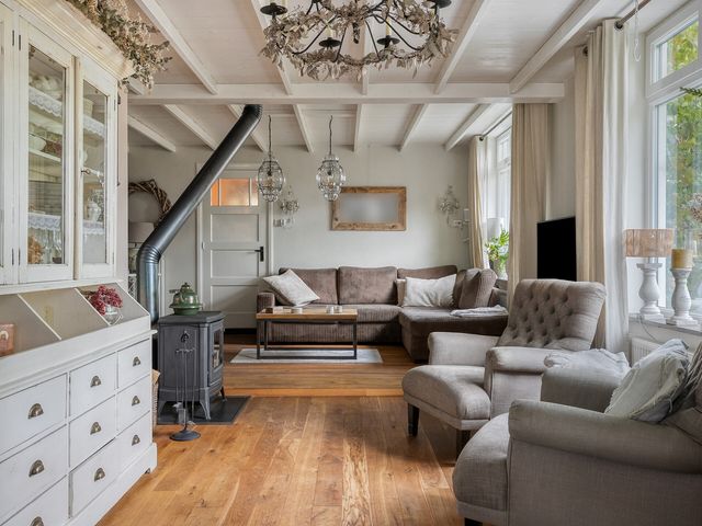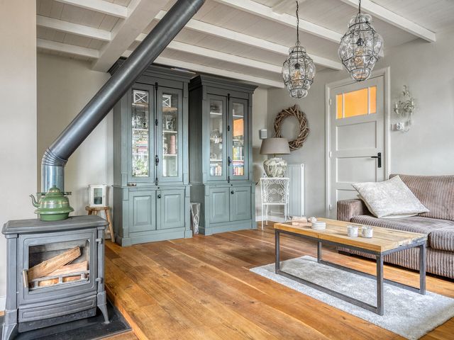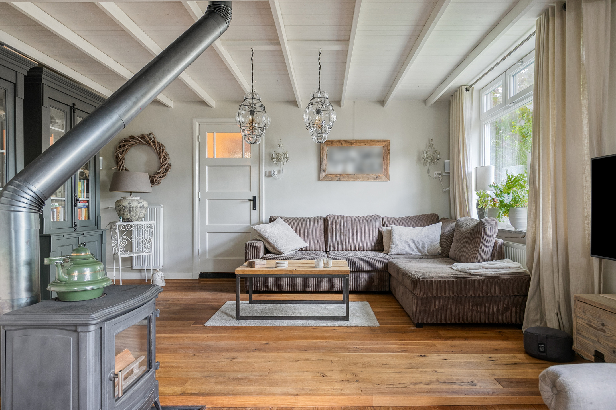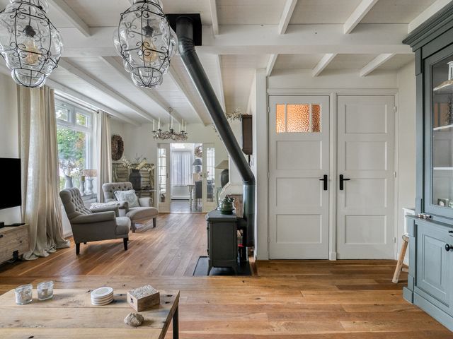De woonkamer voelt direct warm en uitnodigend aan. Het karakter van de jaren ’30 komt hier prachtig tot uiting dankzij de houten vloer, het balkenplafond en de houtkachel die zorgt voor een knusse sfeer tijdens de koudere dagen. De ruimte is royaal en biedt volop mogelijkheden om meerdere zithoeken te creëren, bijvoorbeeld een gezellige tv-hoek en een apart gedeelte om rustig te lezen of te borrelen. Grote raampartijen zorgen daarnaast voor veel daglicht, waardoor de kamer licht en luchtig aanvoelt.