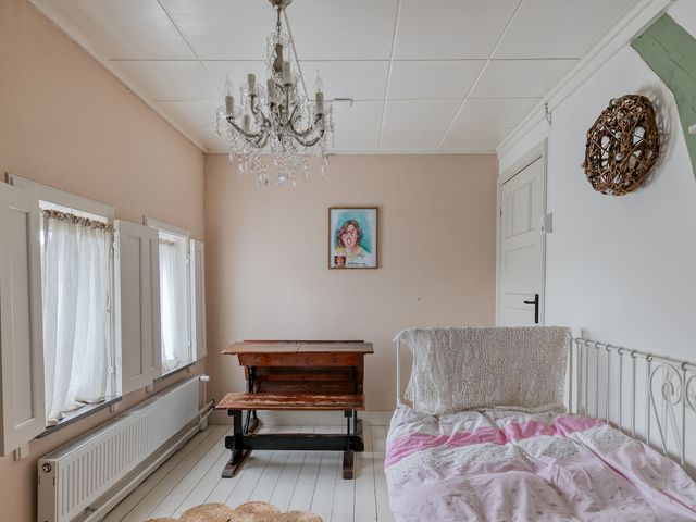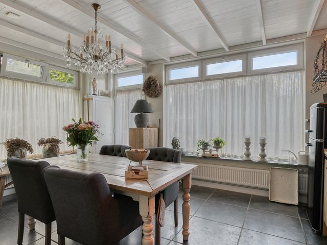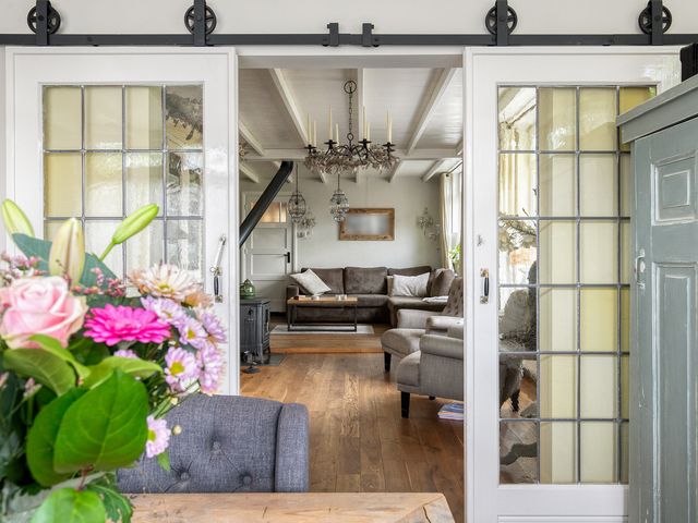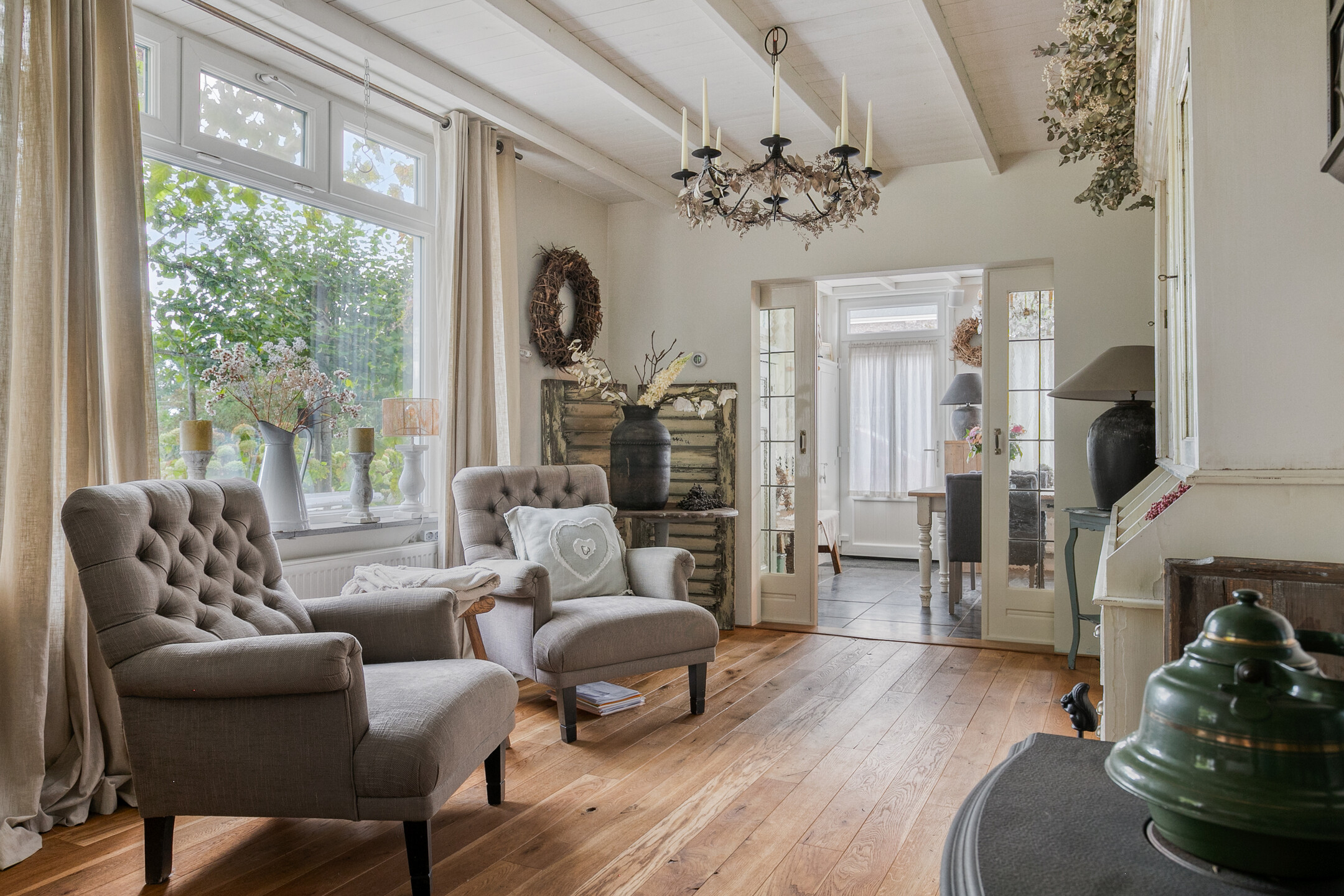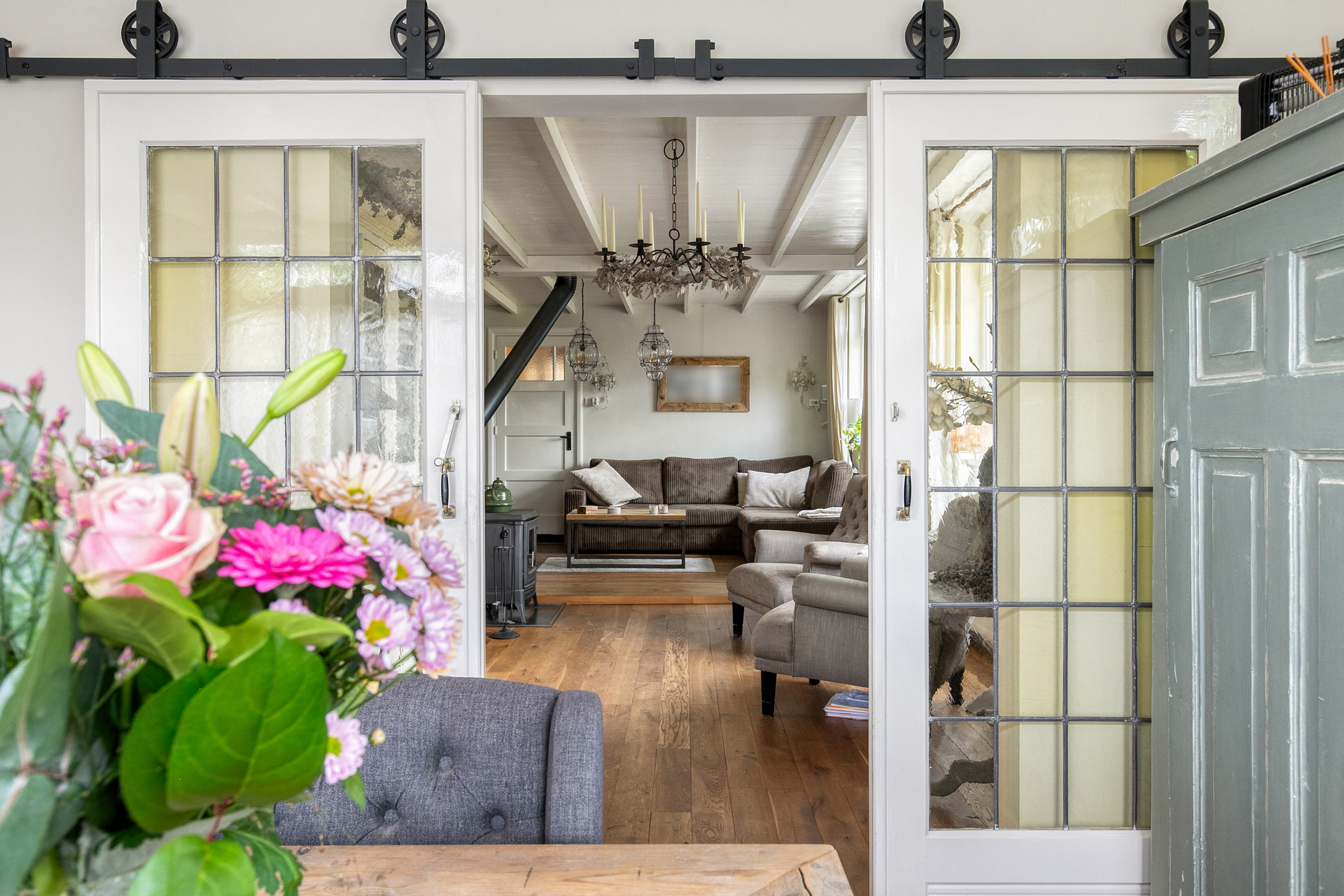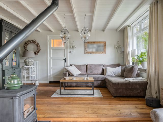 De woonkamer voelt direct warm en uitnodigend aan. Het karakter van de jaren ’30 komt hier prachtig tot uiting dankzij de houten vloer, het balkenplafond en de houtkachel die zorgt voor een knusse sfeer tijdens de koudere dagen. De ruimte is royaal en biedt volop mogelijkheden om meerdere zithoeken te creëren, bijvoorbeeld een gezellige tv-hoek en een apart gedeelte om rustig te lezen of te borrelen. Grote raampartijen zorgen daarnaast voor veel daglicht, waardoor de kamer licht en luchtig aanvoelt.