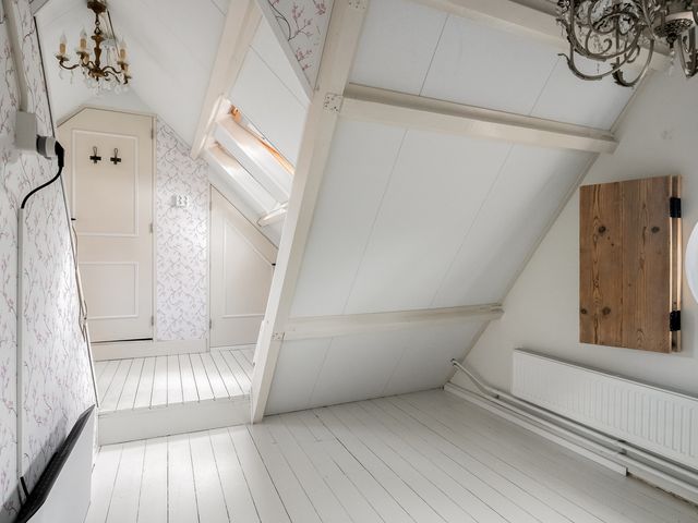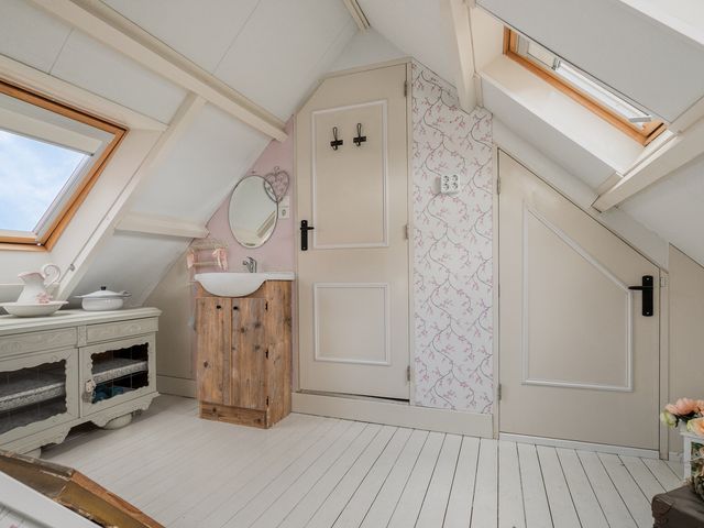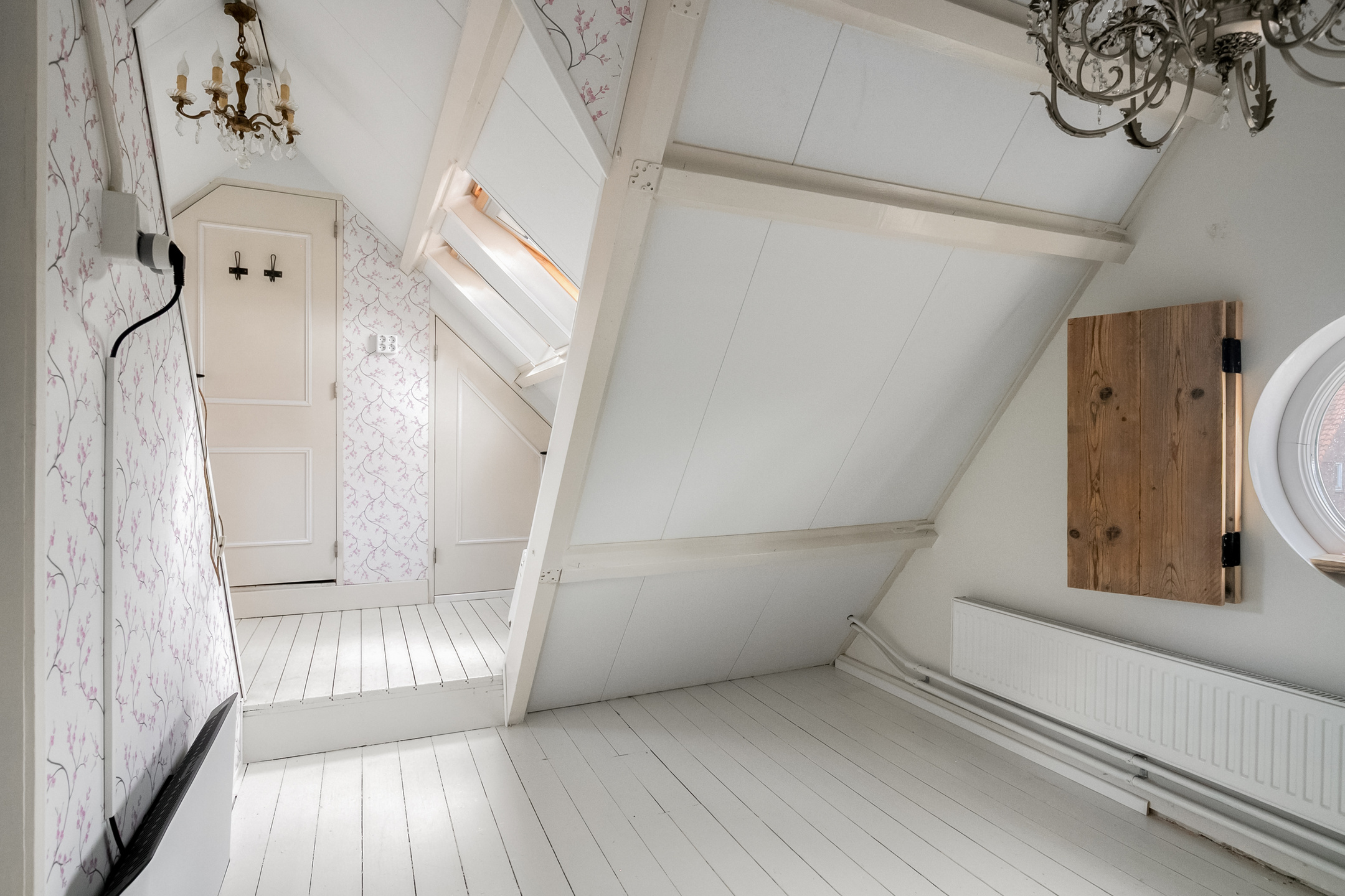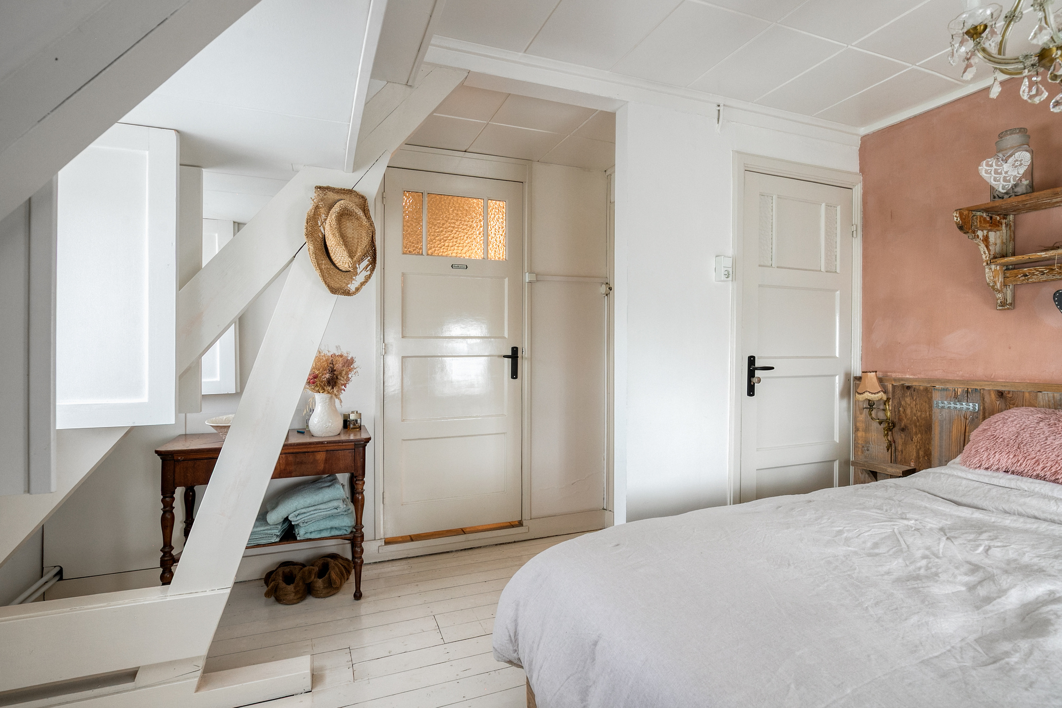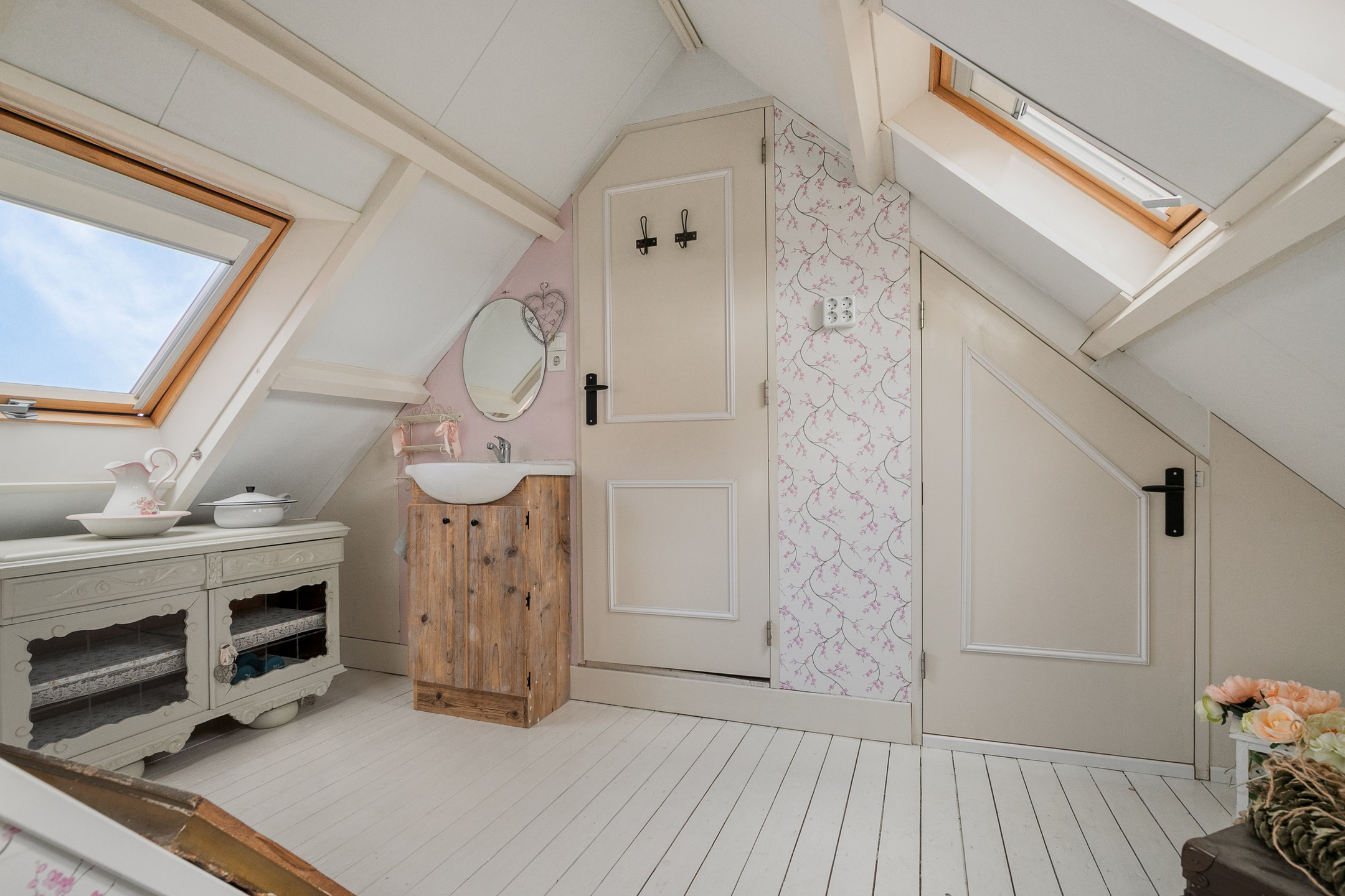Via de overloop bereik je de bovenste verdieping, waar een derde slaapkamer is gerealiseerd. Deze kamer voelt dankzij de ligging op zolder bijzonder sfeervol en intiem aan. Het schuine dak geeft de ruimte karakter, terwijl er voldoende plek is voor een bed, bureau of extra kastruimte. Ook hier is gedacht aan comfort: de kamer heeft een eigen badkamer, zodat je over volledige privacy beschikt. Daarmee is deze verdieping ideaal als tienerkamer, gastenverblijf of zelfs als rustige werkplek waar je je volledig kunt terugtrekken.