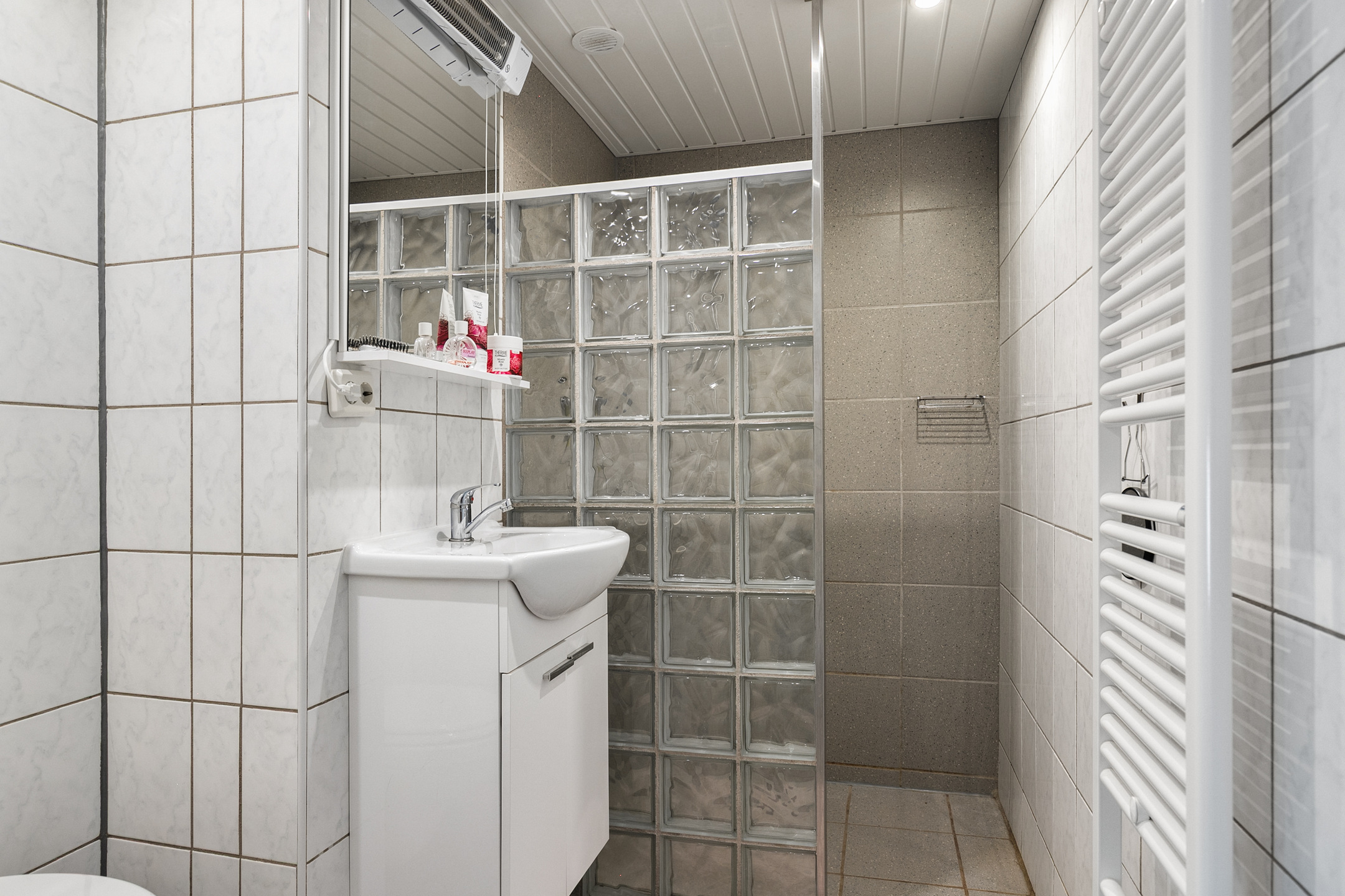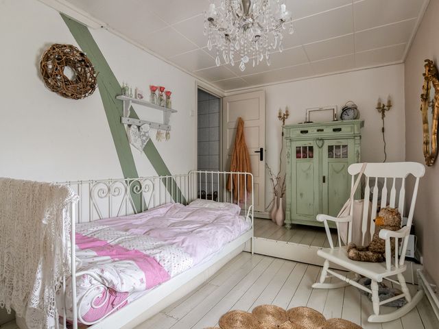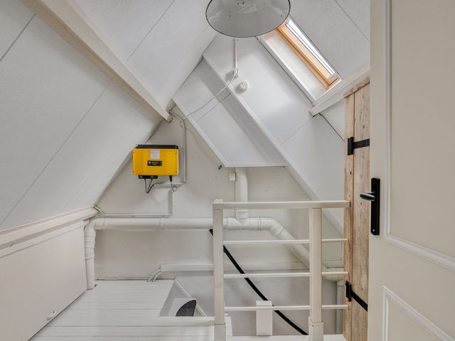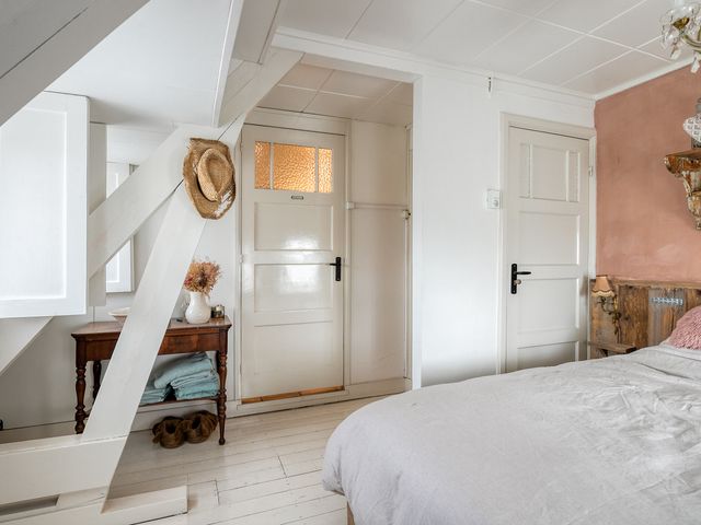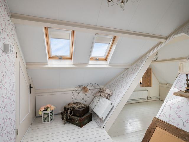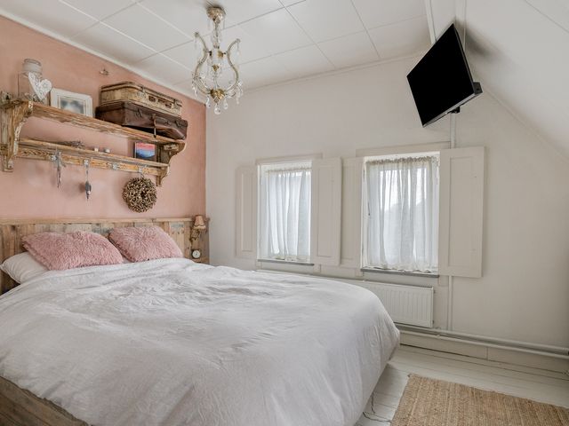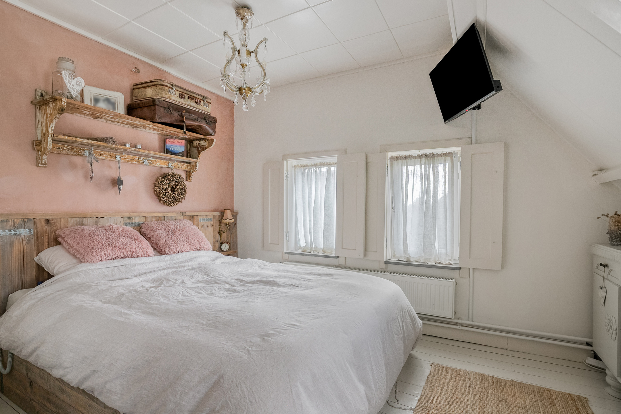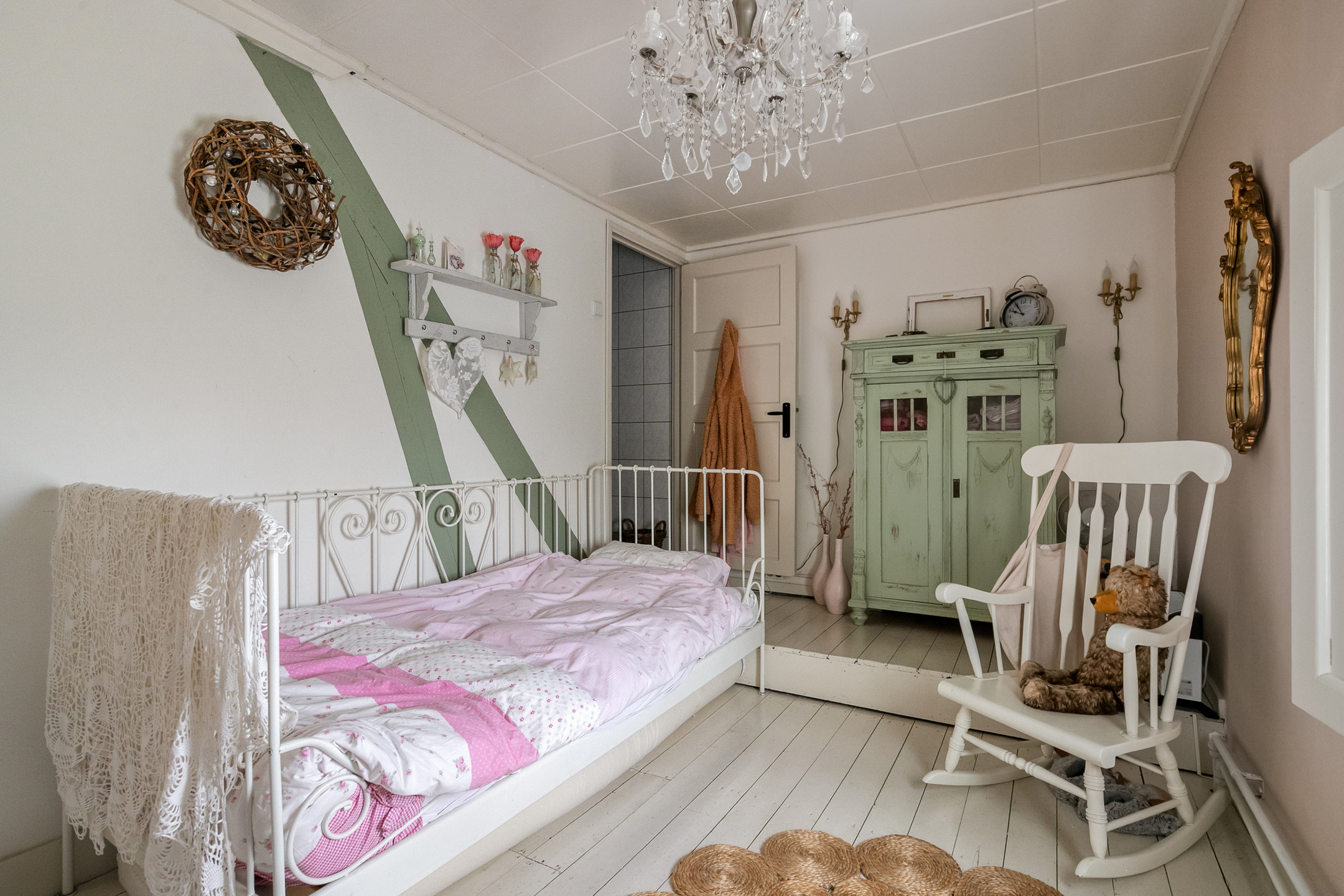 Via de overloop bereik je de bovenste verdieping, waar een derde slaapkamer is gerealiseerd. Deze kamer voelt dankzij de ligging op zolder bijzonder sfeervol en intiem aan. Het schuine dak geeft de ruimte karakter, terwijl er voldoende plek is voor een bed, bureau of extra kastruimte. Ook hier is gedacht aan comfort: de kamer heeft een eigen badkamer, zodat je over volledige privacy beschikt. Daarmee is deze verdieping ideaal als tienerkamer, gastenverblijf of zelfs als rustige werkplek waar je je volledig kunt terugtrekken.