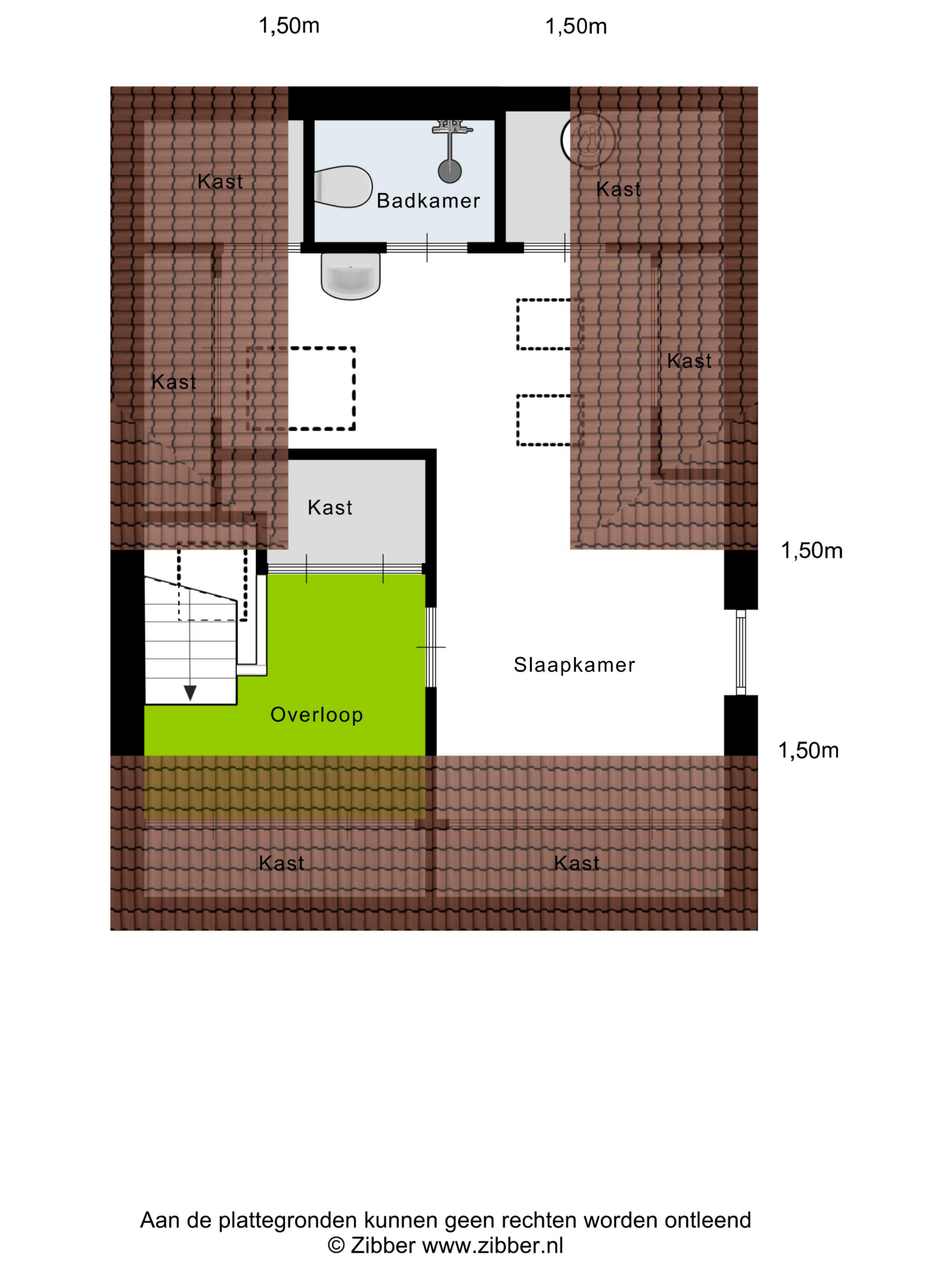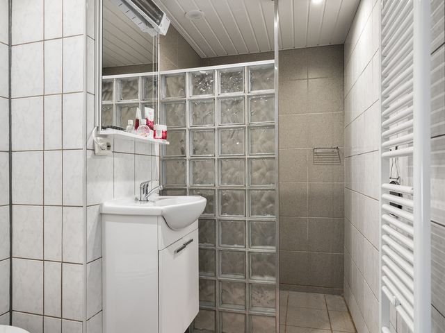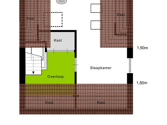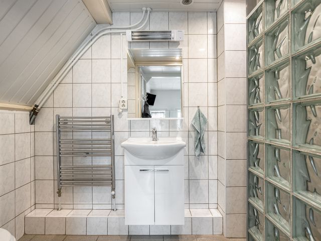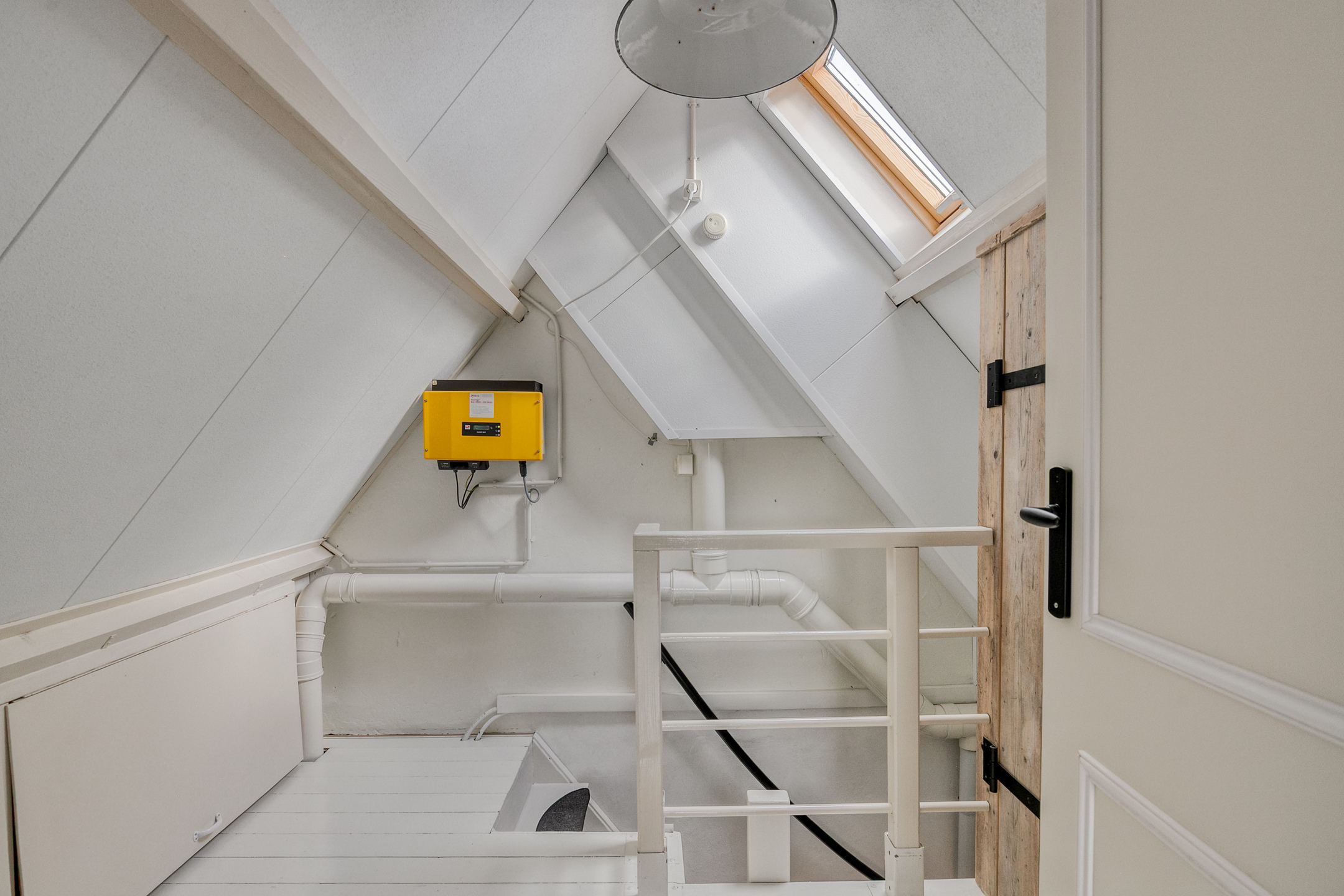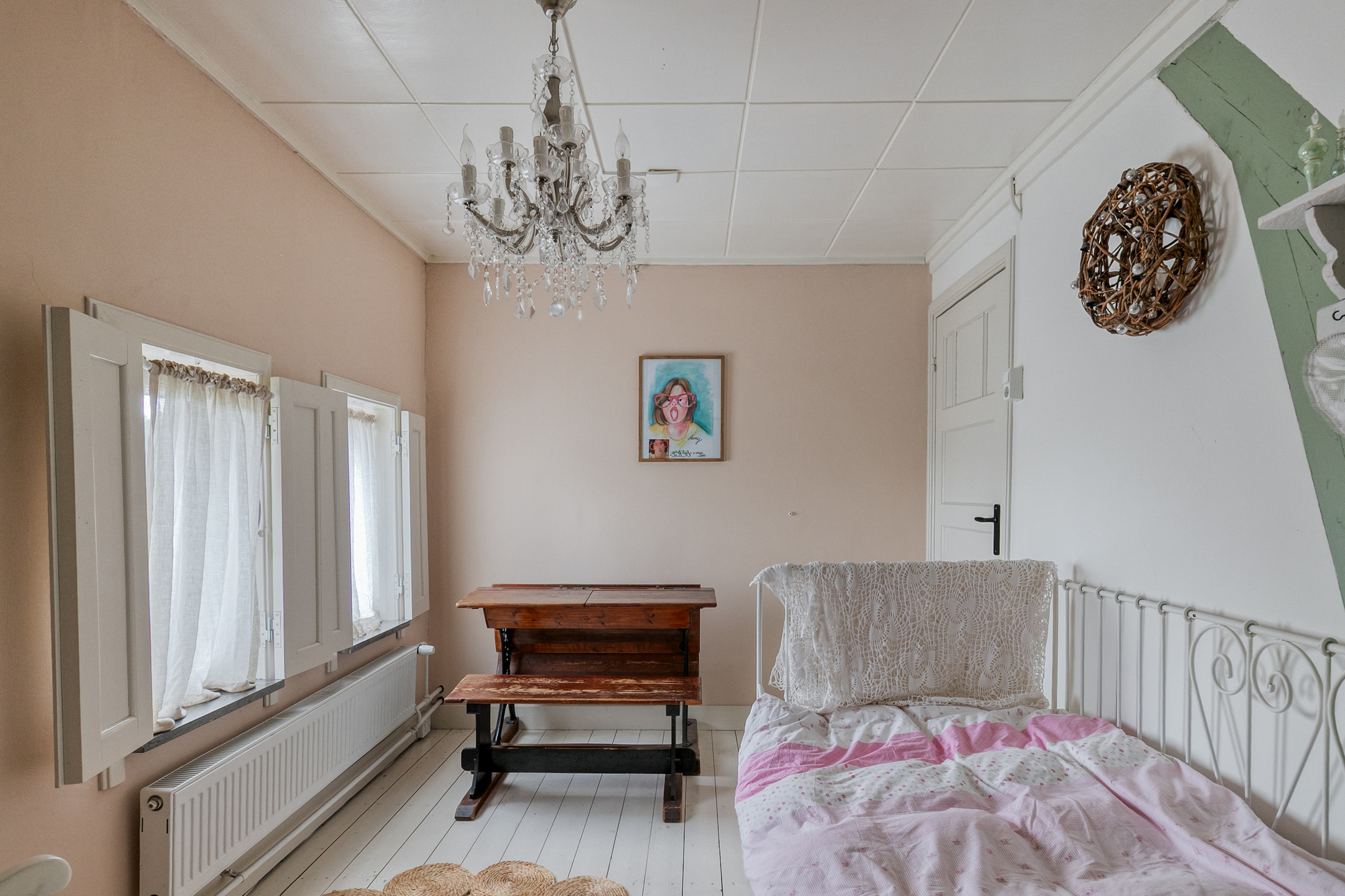 Via de overloop bereik je de bovenste verdieping, waar een derde slaapkamer is gerealiseerd. Deze kamer voelt dankzij de ligging op zolder bijzonder sfeervol en intiem aan. Het schuine dak geeft de ruimte karakter, terwijl er voldoende plek is voor een bed, bureau of extra kastruimte. Ook hier is gedacht aan comfort: de kamer heeft een eigen badkamer, zodat je over volledige privacy beschikt. Daarmee is deze verdieping ideaal als tienerkamer, gastenverblijf of zelfs als rustige werkplek waar je je volledig kunt terugtrekken.