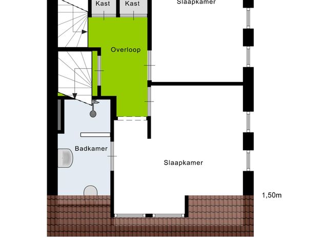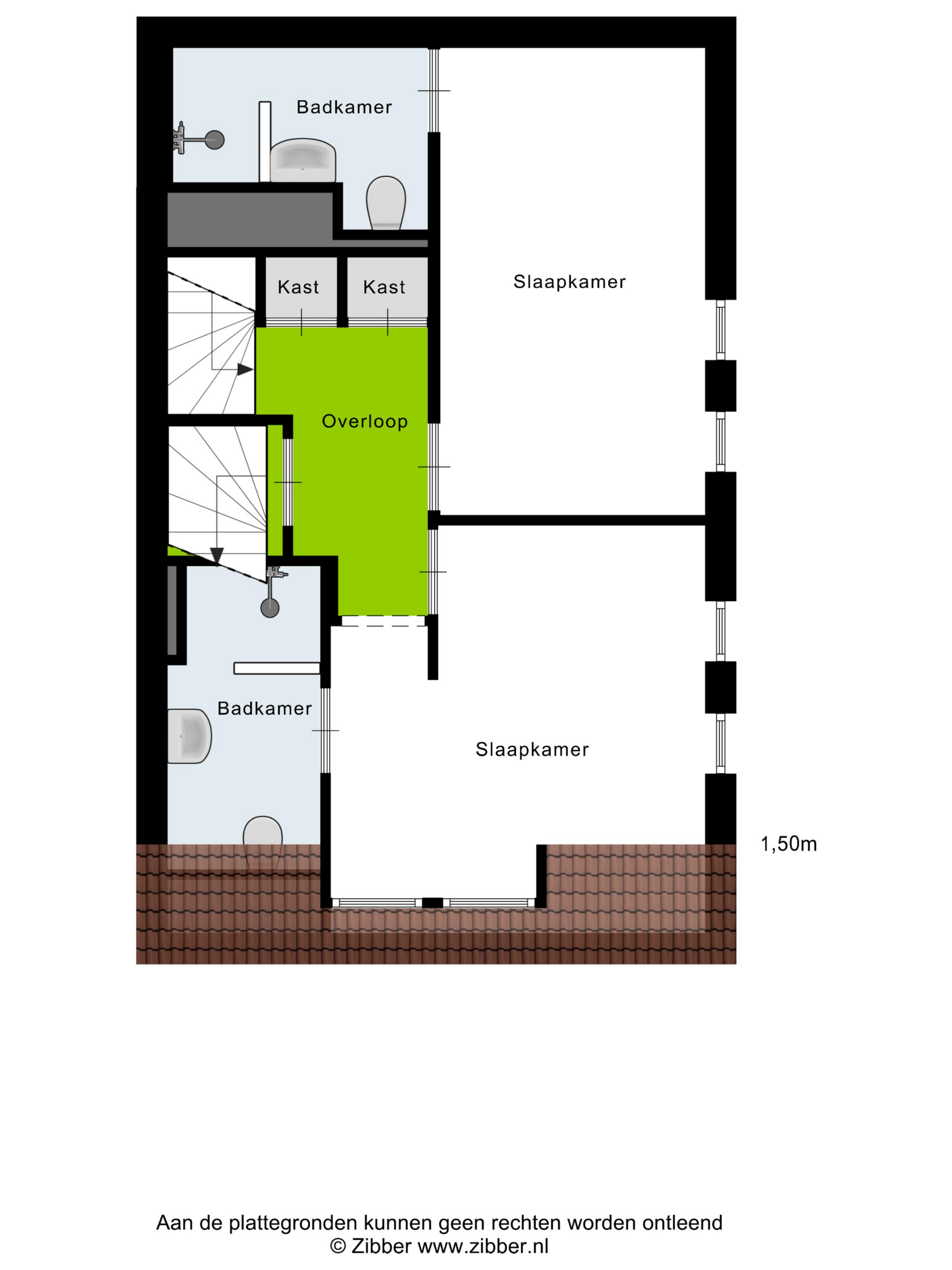 Op de eerste verdieping vind je twee comfortabele slaapkamers die elk hun eigen sfeer en mogelijkheden hebben. De master bedroom is ruim opgezet en biedt genoeg plek voor een groot kingsize bed, een kledingkast en extra meubilair zoals een bureau of een zitje. De tweede slaapkamer is wat compacter, maar daardoor juist knus en uitstekend geschikt als kinder- of logeerkamer, of eventueel als thuiskantoor. Een groot pluspunt van deze verdieping is dat beide slaapkamers beschikken over een eigen badkamer, voorzien van douche, wastafel en toilet. Dit maakt de verdieping niet alleen praktisch, maar ook luxueus en comfortabel voor het hele gezin of voor gasten.