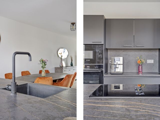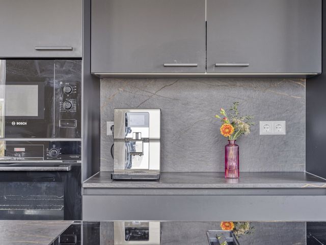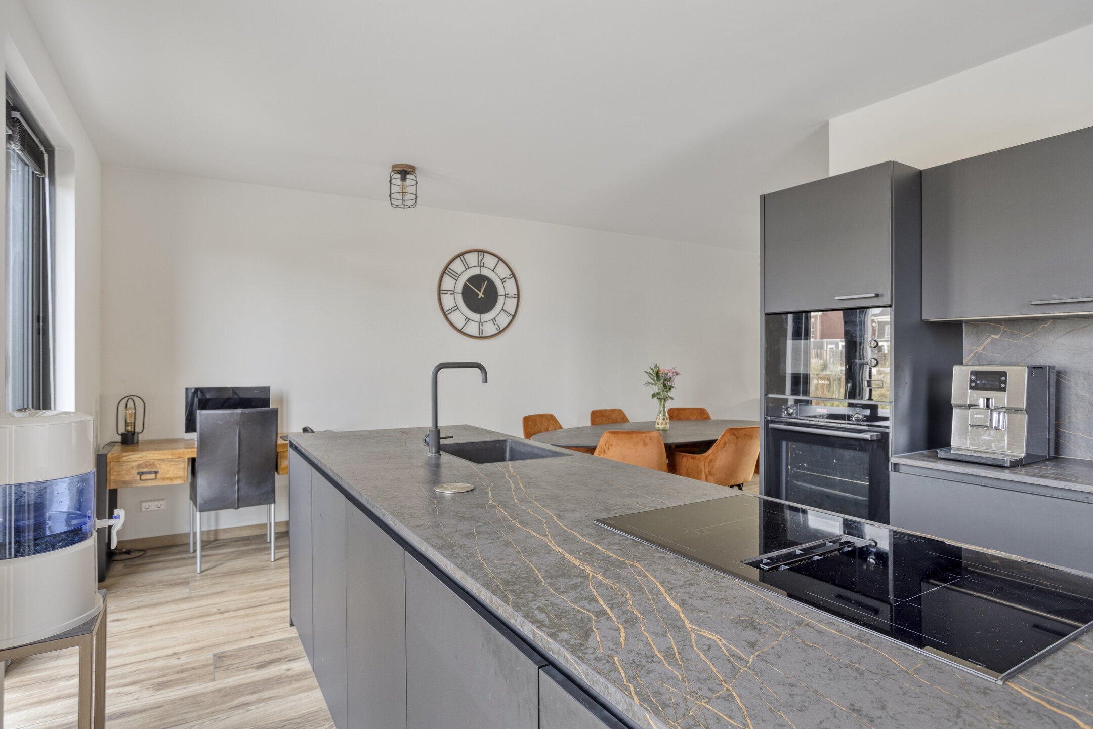 De open keuken is een schitterend, modern hart van de woning en is gelegen aan de voorzijde van de woning. Het kookeiland nodigt uit tot koken en samenzijn, met een inductiekookplaat met geïntegreerd afzuigsysteem en een ruime werkruimte rondom de spoelbak. Het eiland biedt ook extra opbergruimte en plek om samen te genieten van een ontbijt of een diner. Het vaste keukendeel is voorzien van hoogwaardige inbouwapparatuur (Bosch)– alles van topkwaliteit en volledig nieuw. De keuken is voorzien van dekton werkbladen.