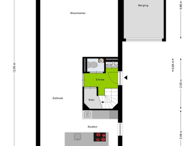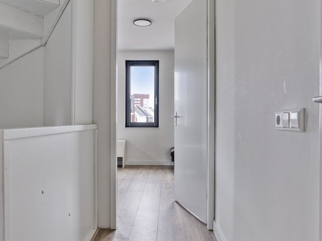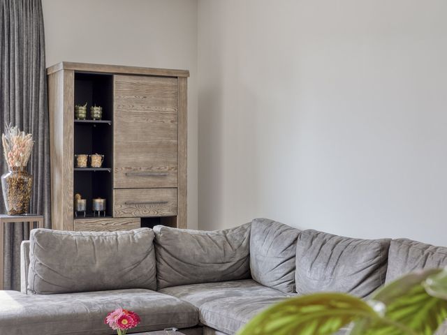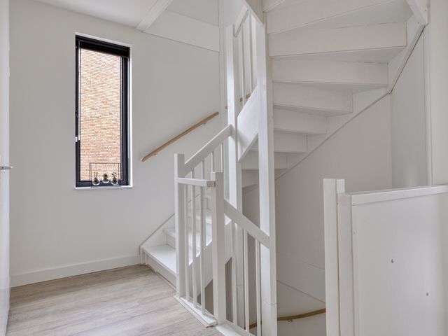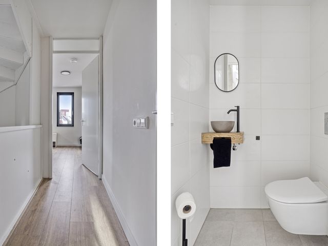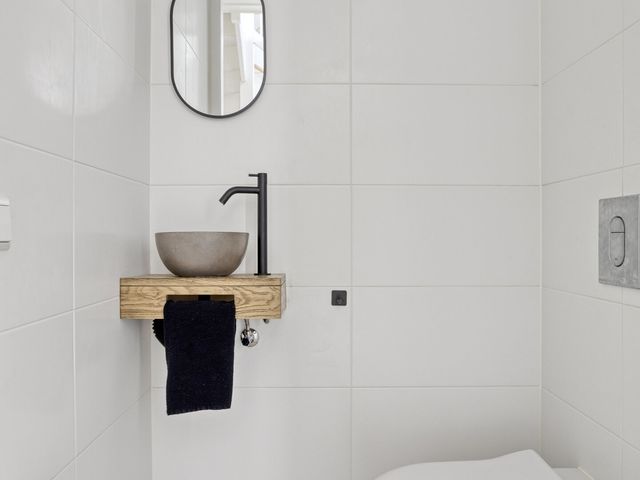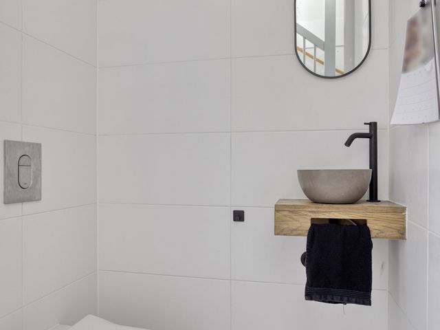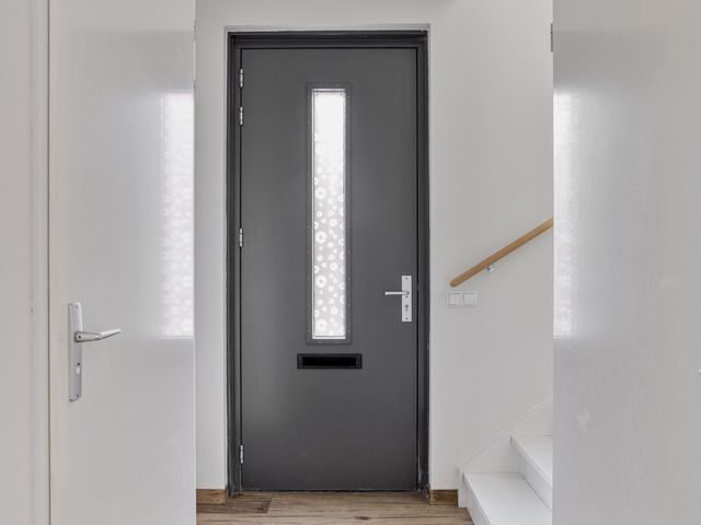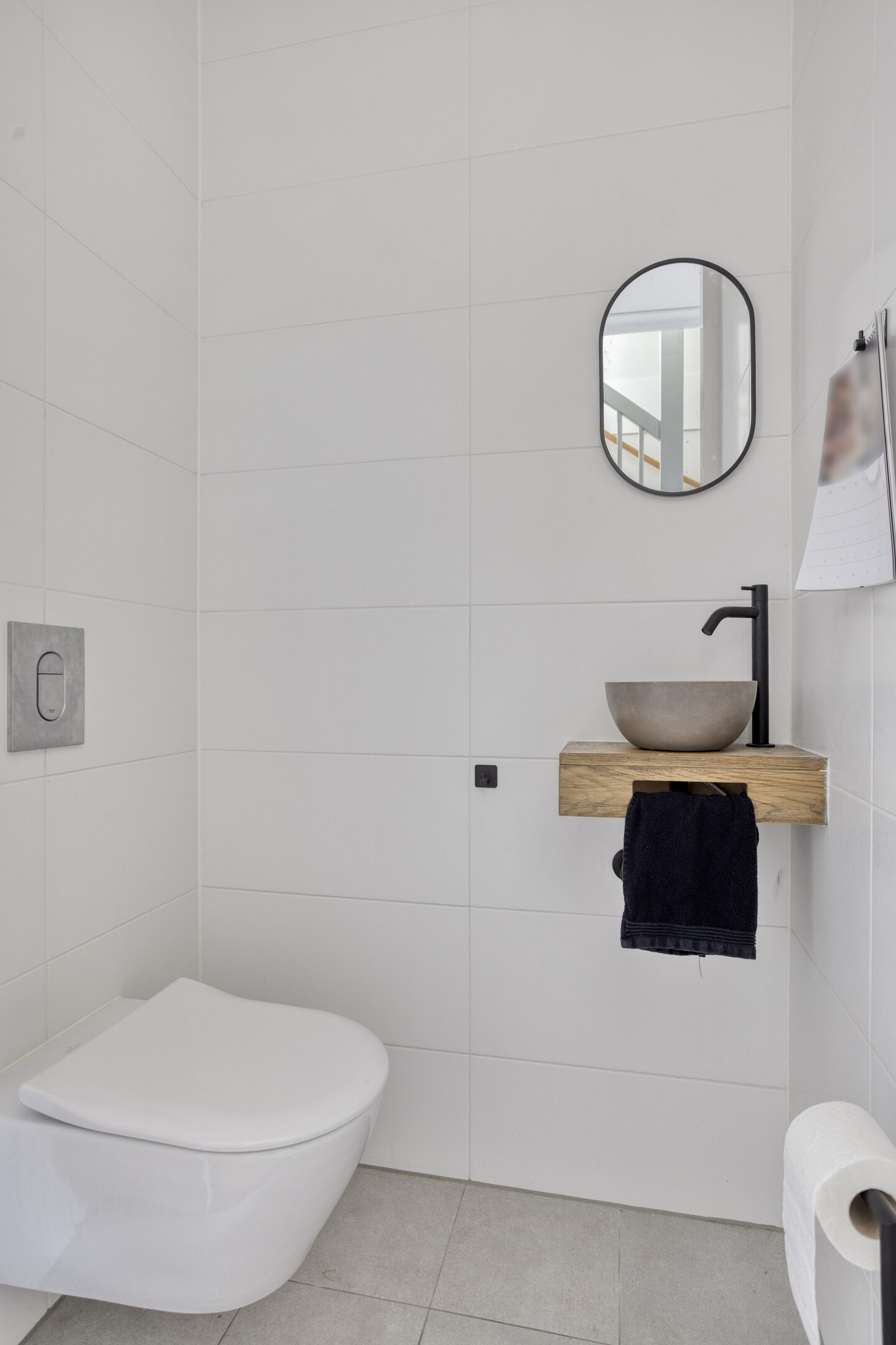 Via je eigen oprit bereik je de voordeur (aan de zijkant van de woning), welke toegang geeft tot een lichte hal met trapopgang, modern toilet en doorgang naar de woonkamer. Een elegante zwarte deur leidt je naar de woonkamer.