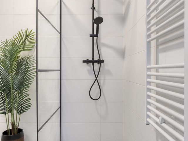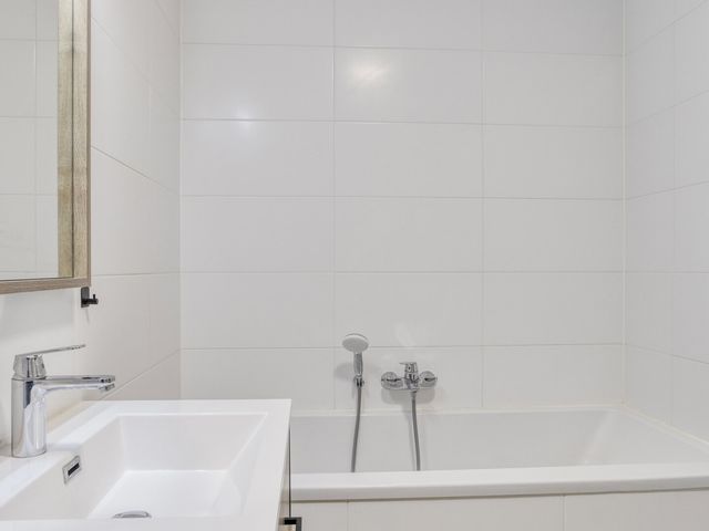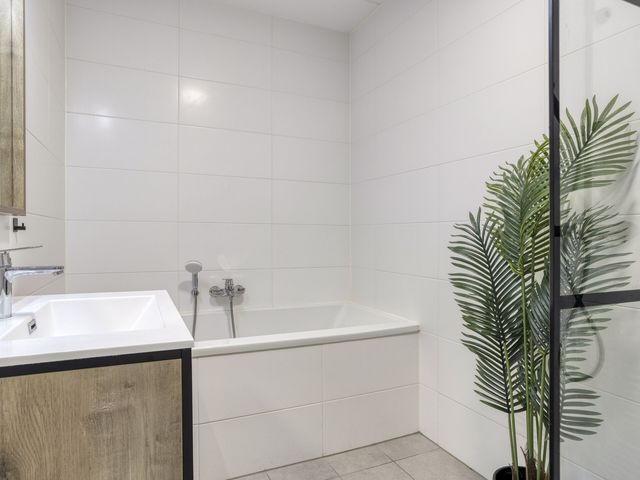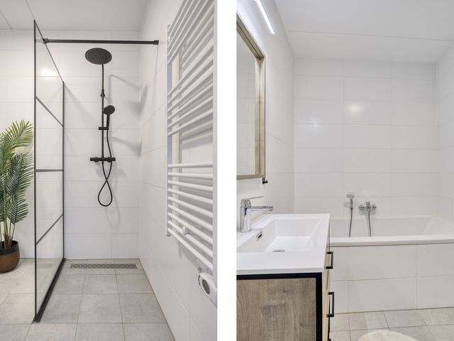 De badkamer straalt rust en luxe uit, met een ligbad, inloopdouche, wastafel met meubel, handdoekenradiator en vloerverwarming. Hier geniet je elke dag van een wellness-gevoel thuis.