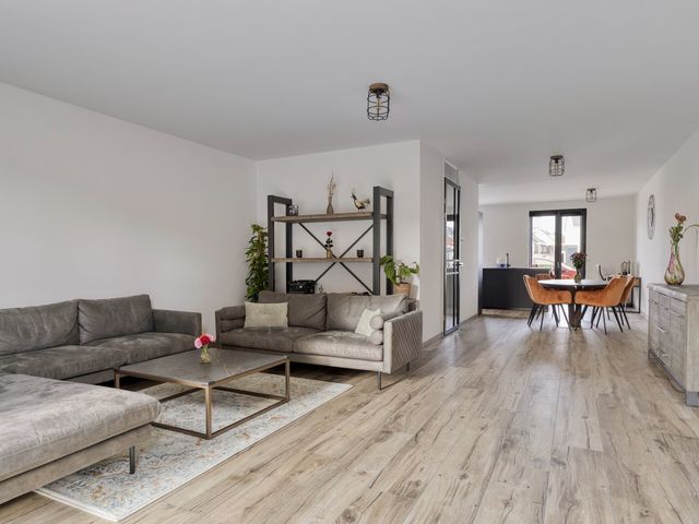Stap binnen in de riante woonkamer, waar ruimte en licht meteen opvallen. De warme houtkleurige tegelvloer loopt door het hele vertrek en geeft een gevoel van elegantie en gezelligheid. Dankzij de grote glazen pui met loopdeur valt er volop daglicht naar binnen en wordt het contact met de achtertuin prachtig geïntegreerd, waardoor binnen en buiten als het ware één worden. De woonkamer biedt voldoende plek voor een royale zithoek, comfortabele fauteuils en stijlvolle accenten, zodat je een echte leefruimte kunt creëren waarin zowel ontspanning als samenzijn centraal staat.