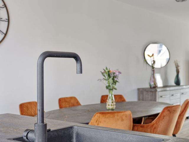 De keuken wordt omringd door grote raampartijen, waardoor er de hele dag door natuurlijk licht binnenvalt en je uitzicht hebt op de voortuin en het water. Dankzij de open verbinding met de woonkamer en het eetgedeelte ontstaat een lichte, sociale leefruimte waarin koken, eten en ontspannen naadloos samenkomen.