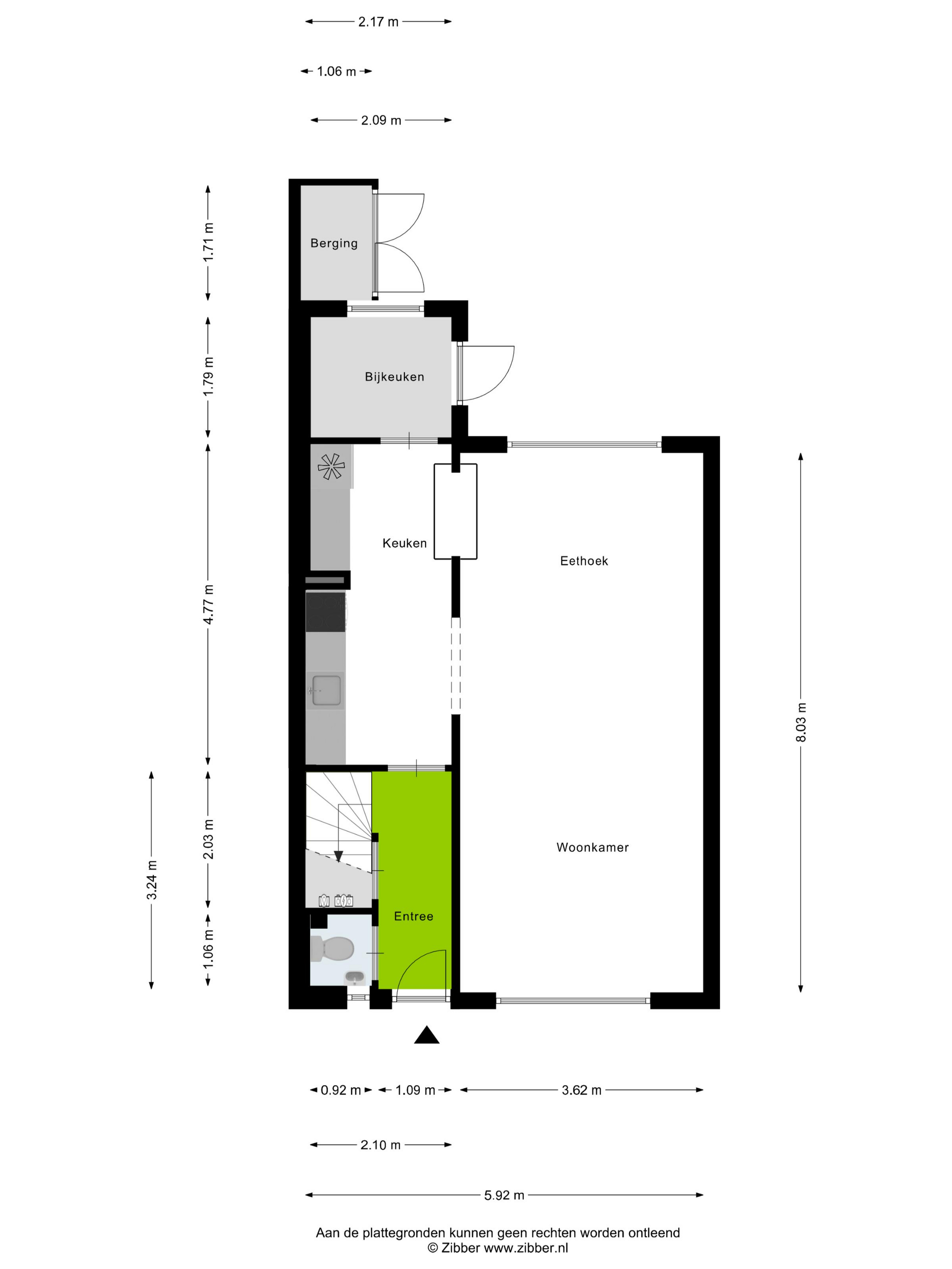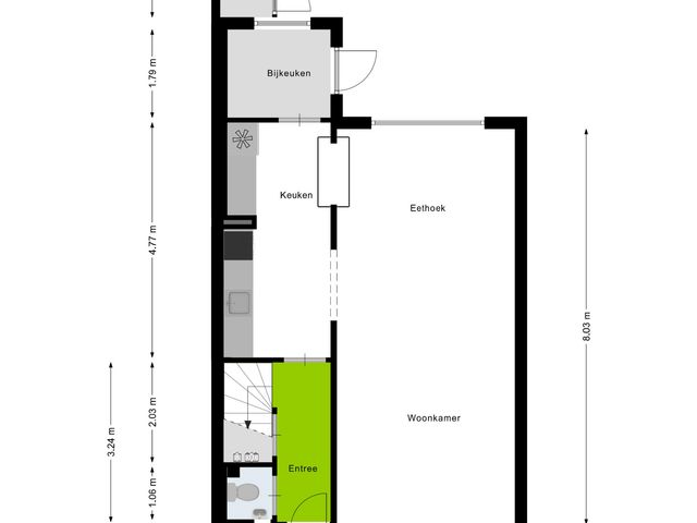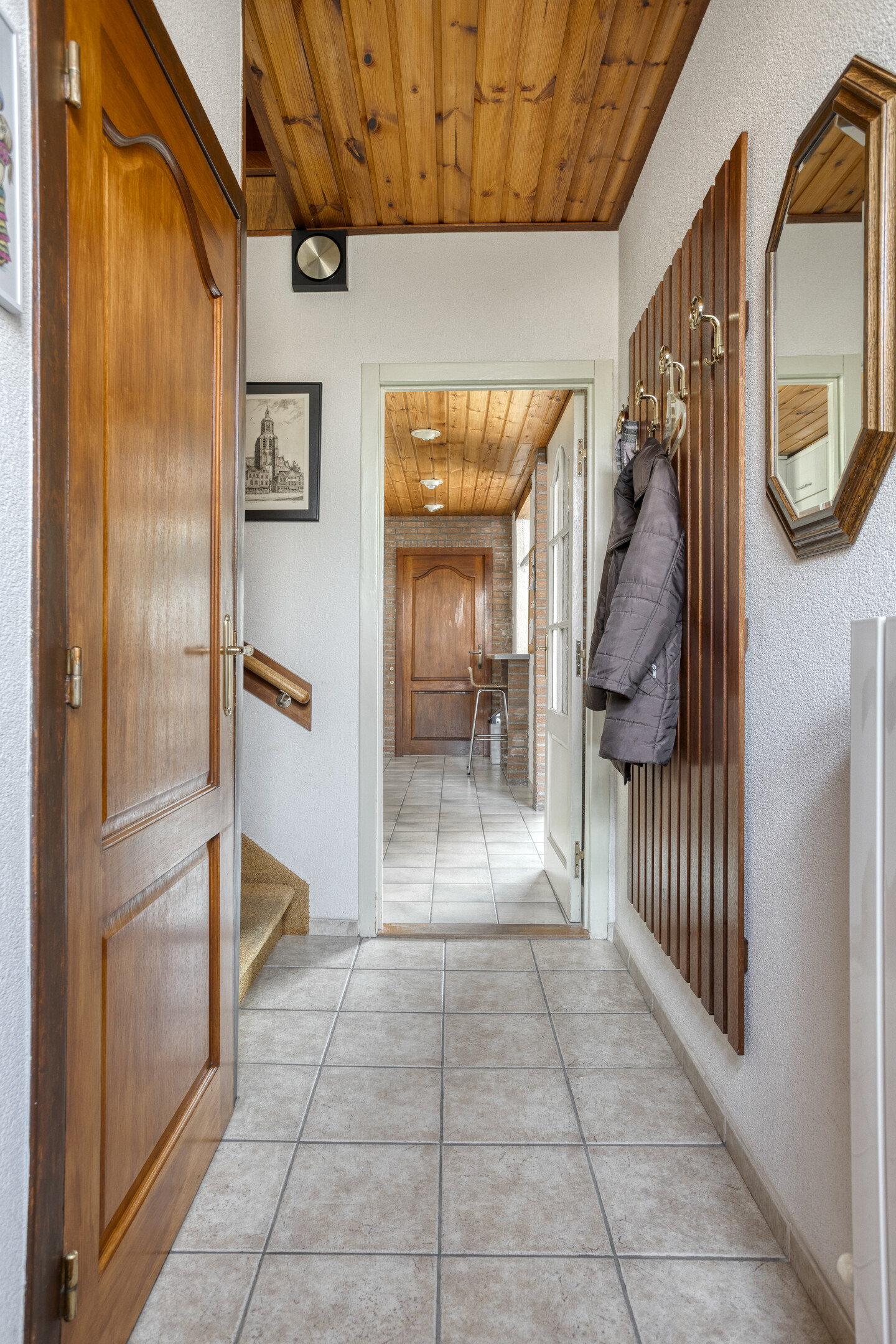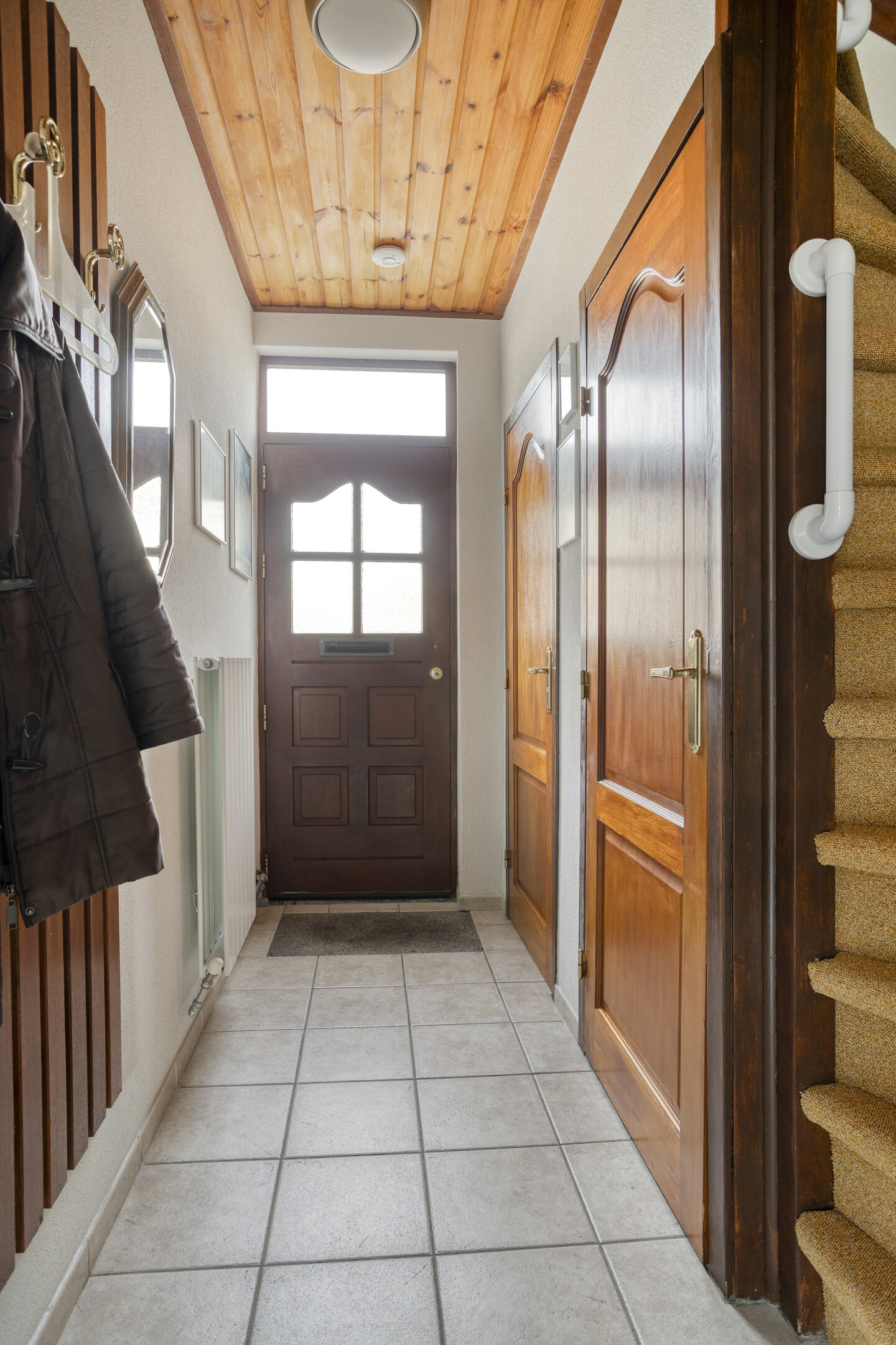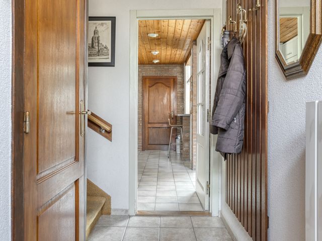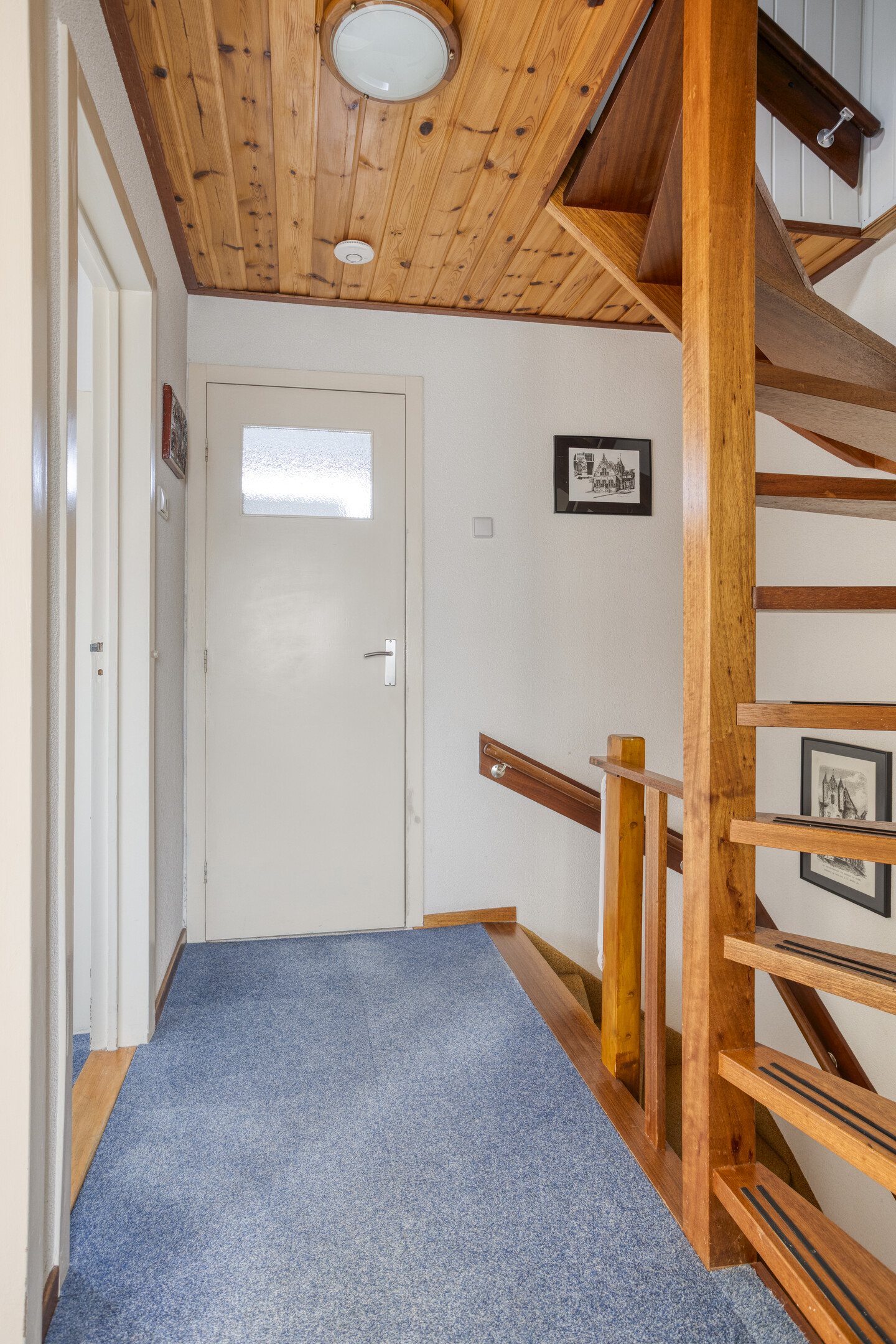 Bij binnenkomst tref je de hal met toegang tot het toilet, een trapkast, de trap naar de eerste verdieping en de keuken. De lichte tegelvloer zorgt voor een frisse uitstraling.