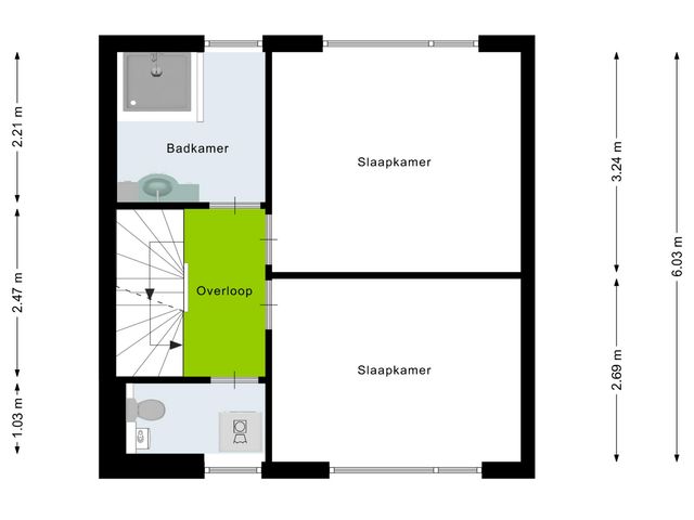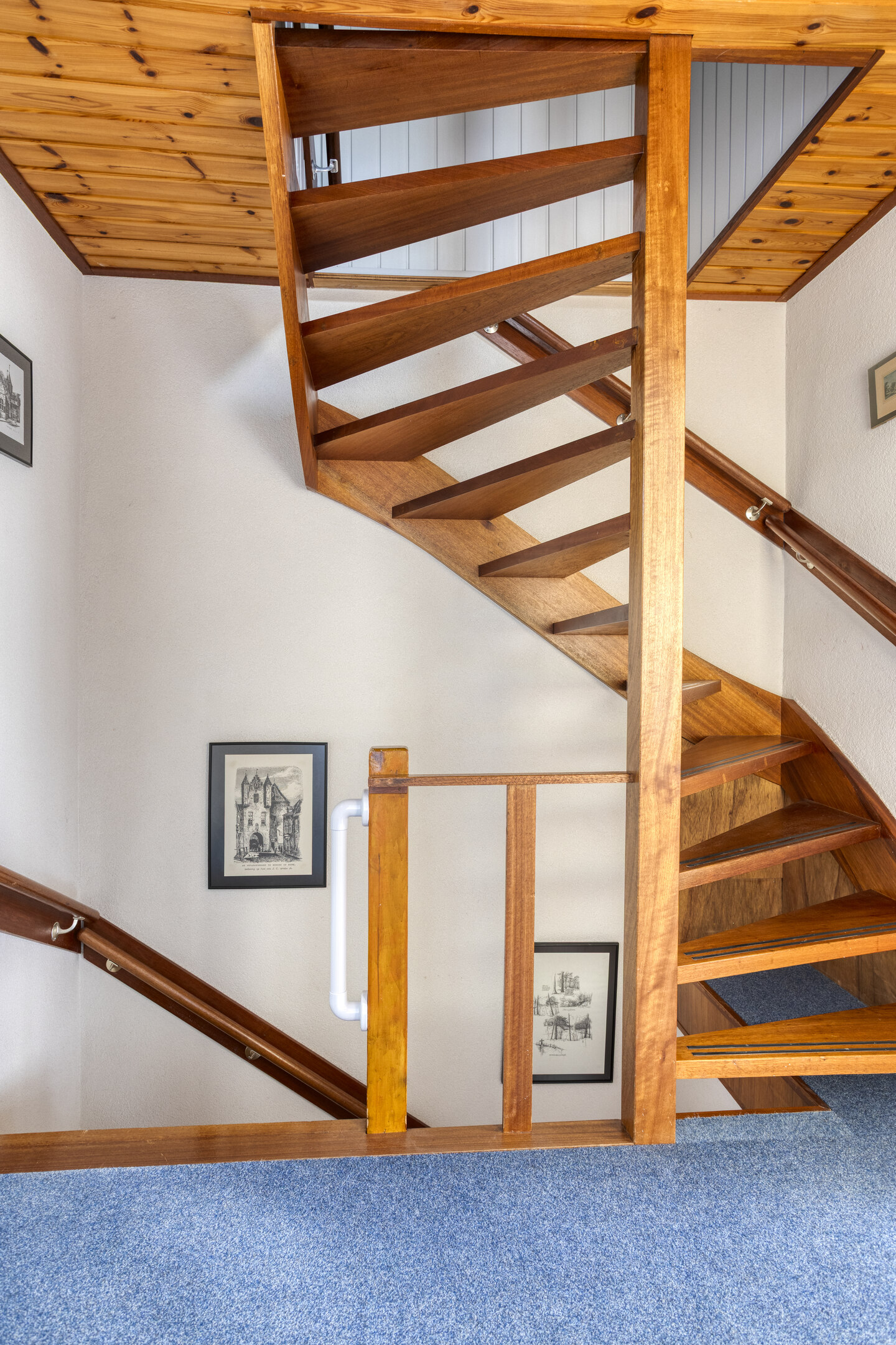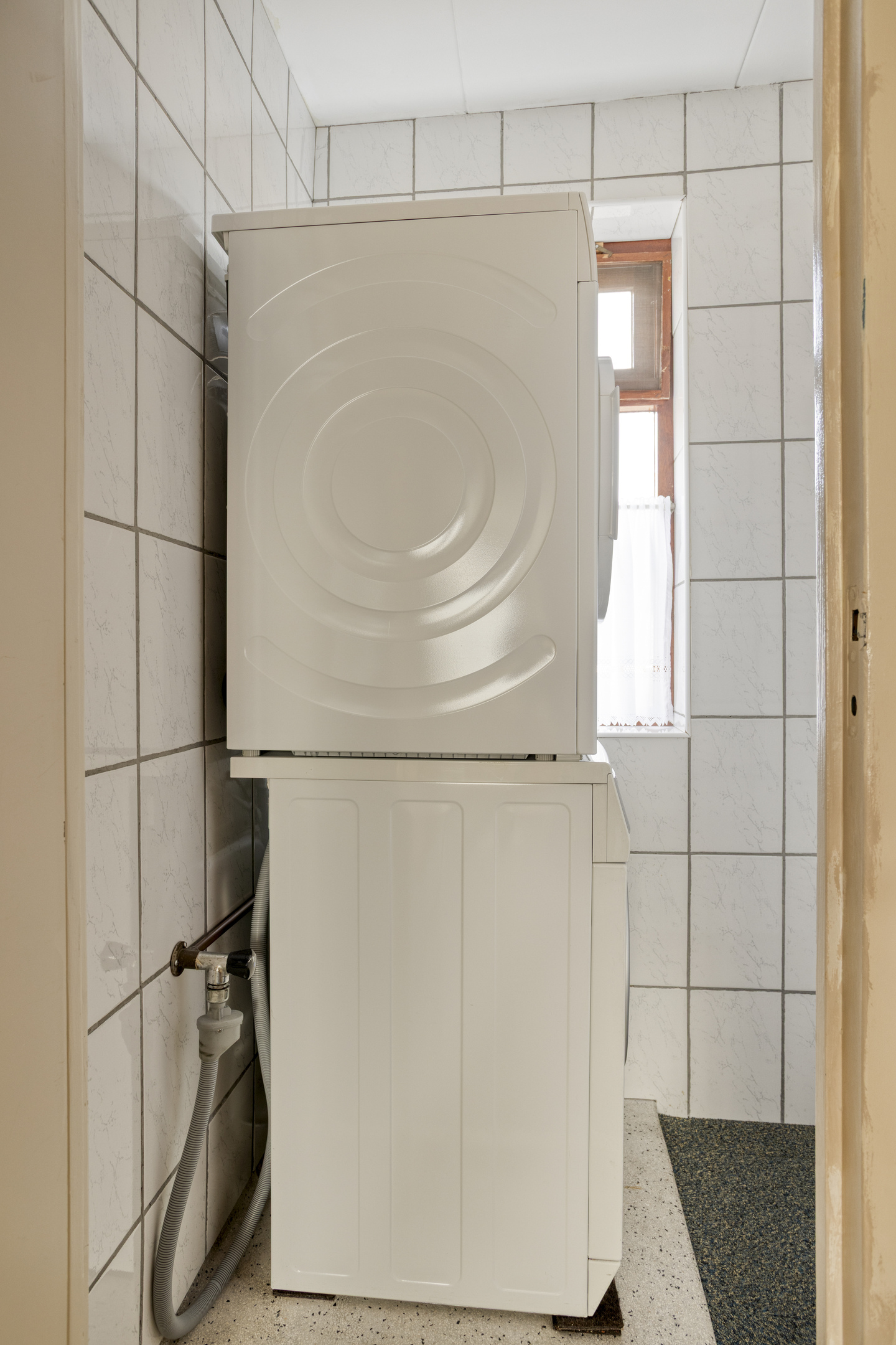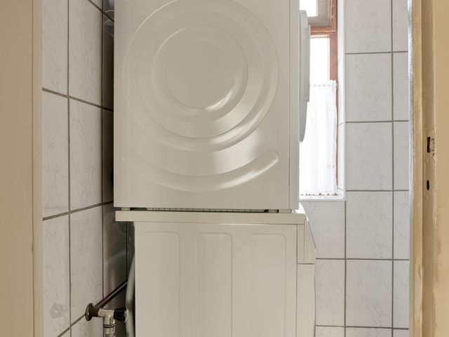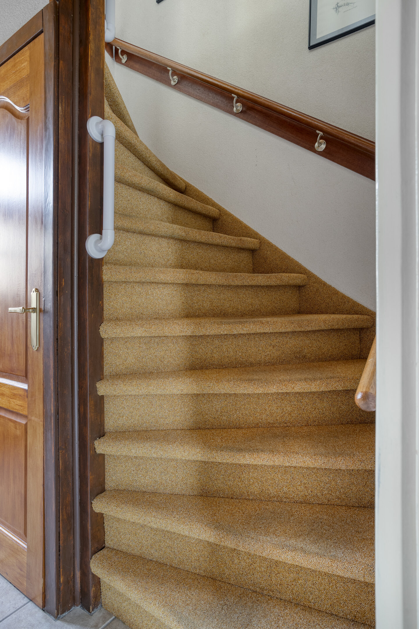 Via de trap kom je op de overloop van de eerste verdieping die toegang geeft tot twee slaapkamers, de badkamer en een aparte ruimte met aansluiting voor wasmachine en droger én een tweede toilet.