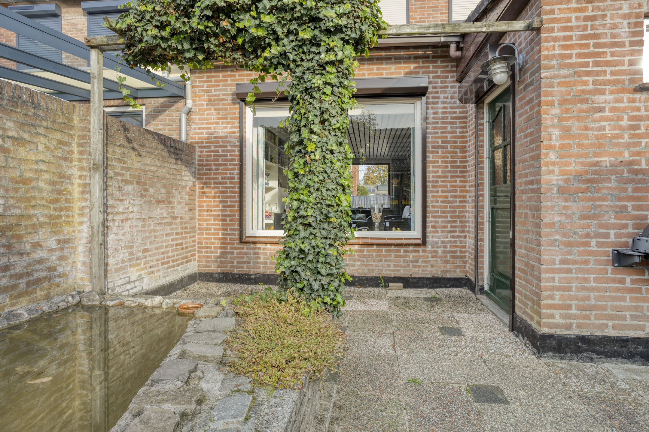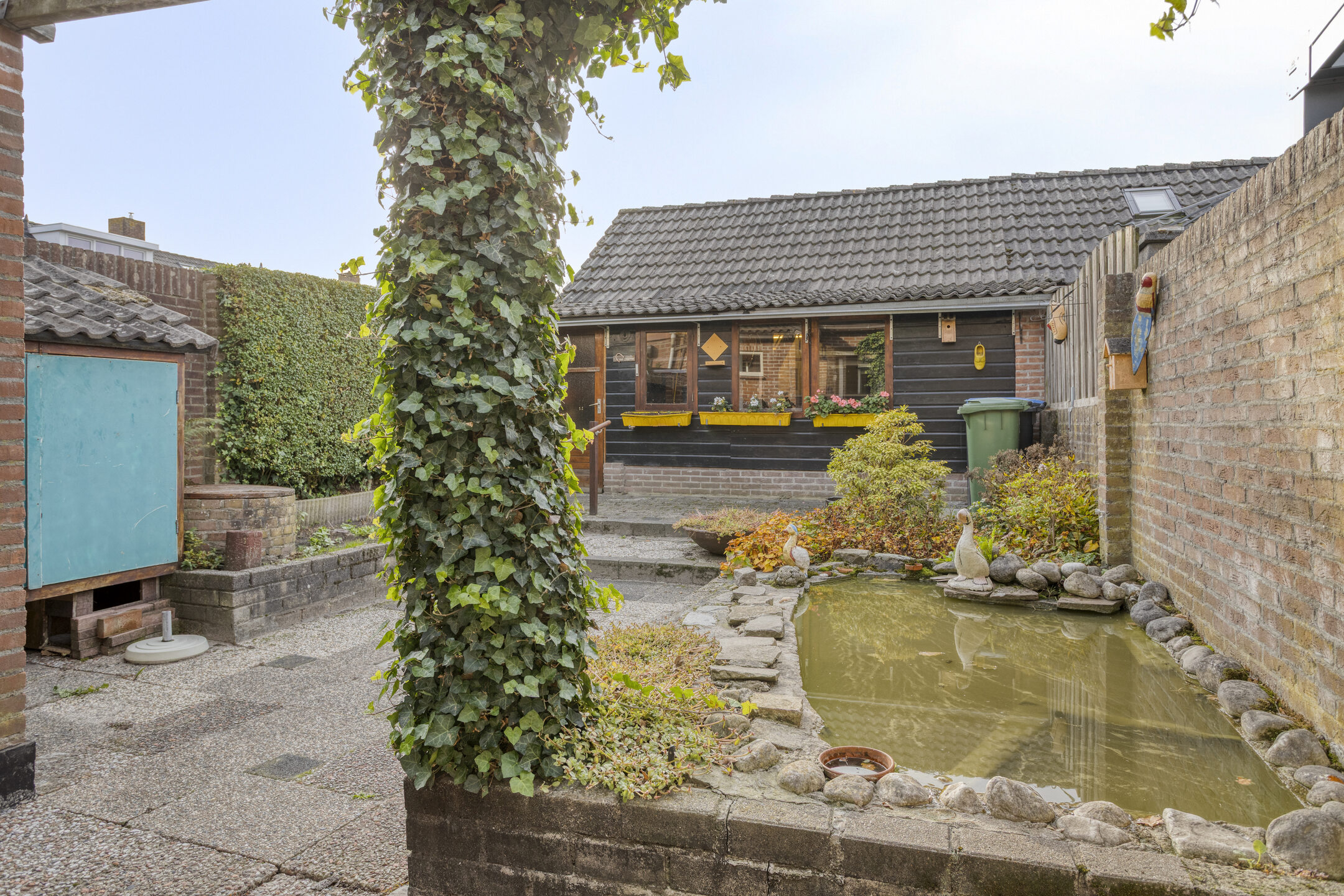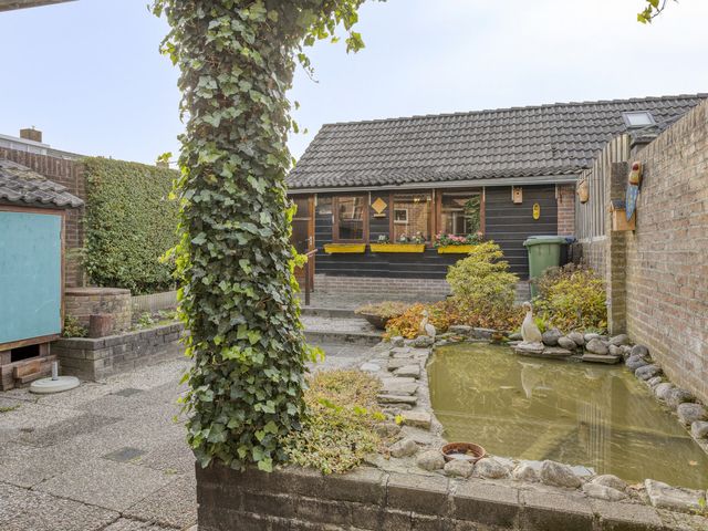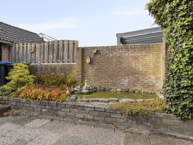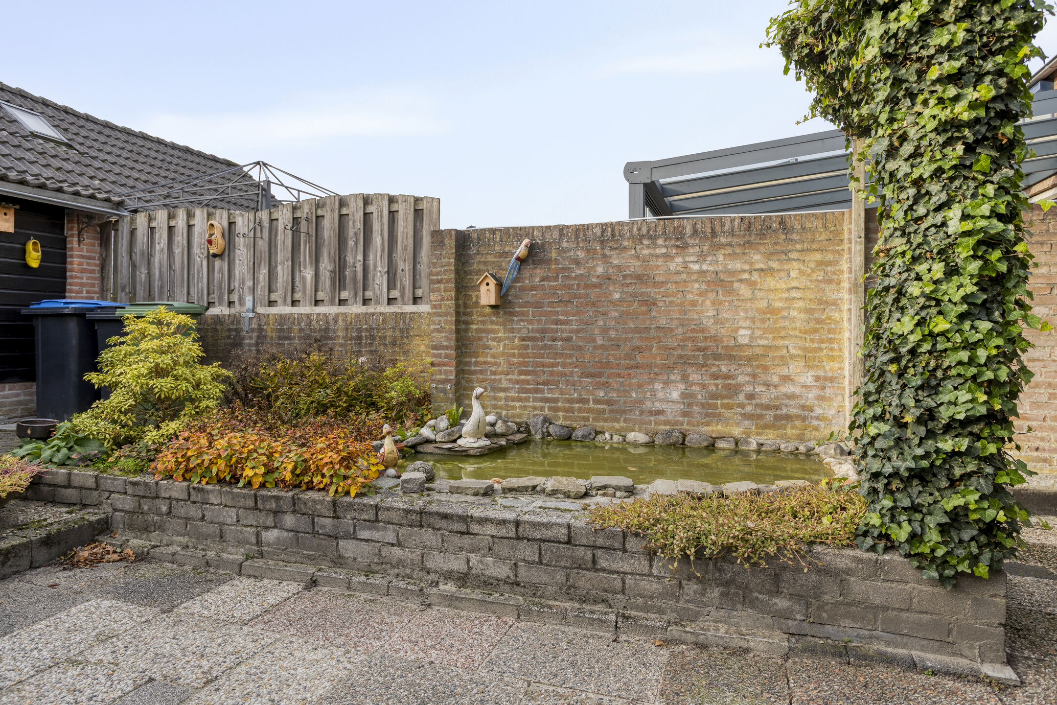 De achtertuin is onderhoudsvriendelijk aangelegd met sierbestrating, verhoogde plantenbakken en een vijver. Er is genoeg ruimte voor een gezellige zithoek of eettafel, zodat je ook buiten heerlijk kunt genieten.
