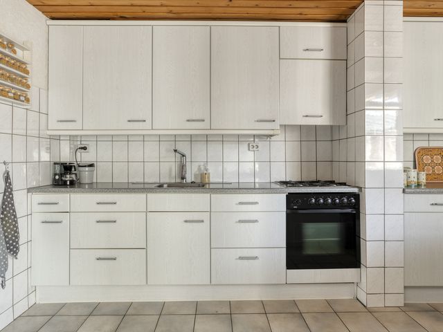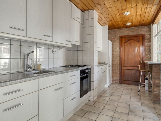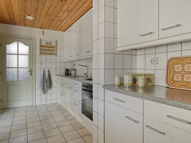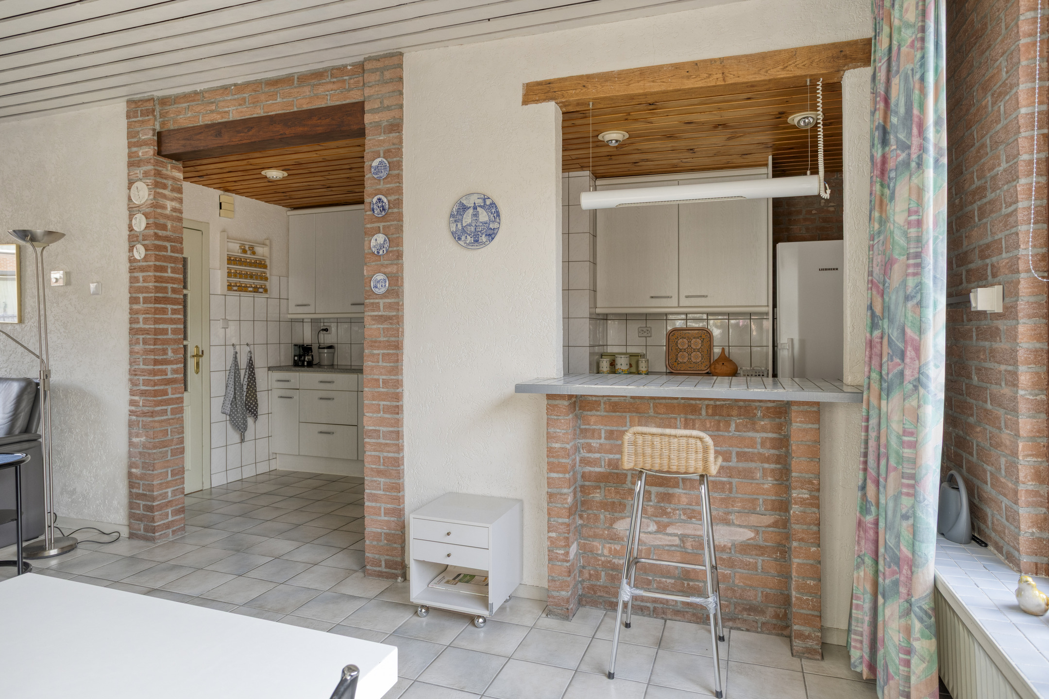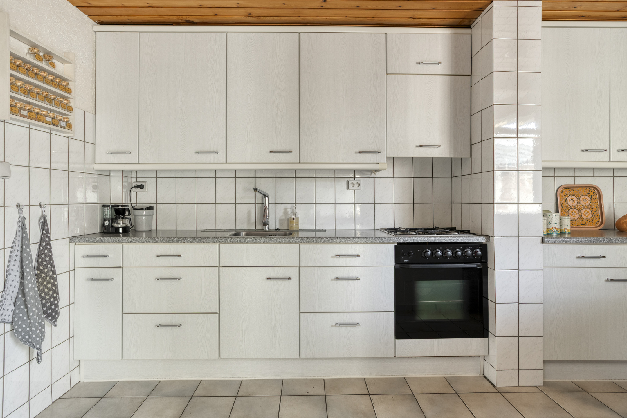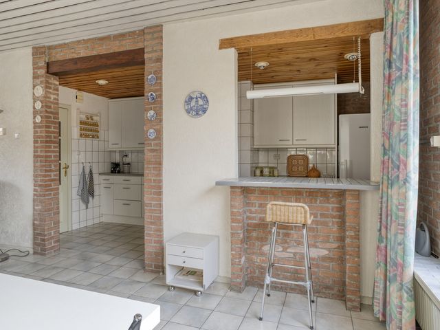 De open keuken is verrassend ruim en biedt volop mogelijkheden om naar eigen smaak te moderniseren. Momenteel is de keuken voorzien van diverse apparatuur en een gezellig barretje met uitzicht op de woonkamer.