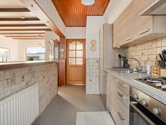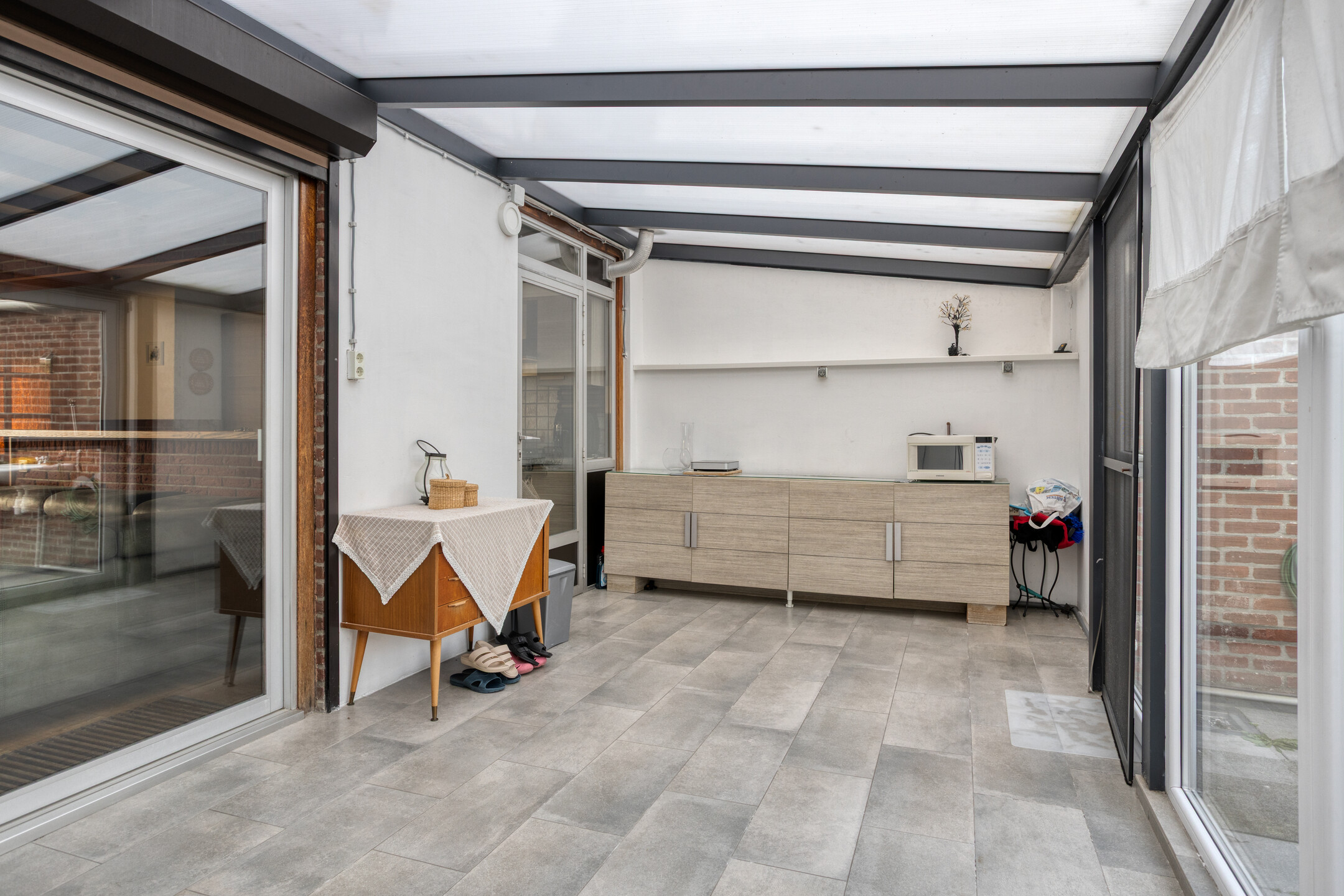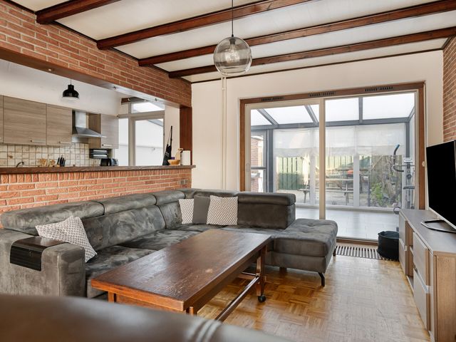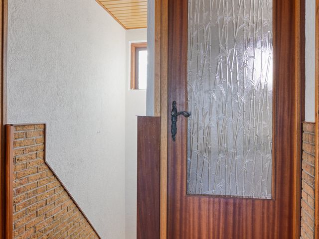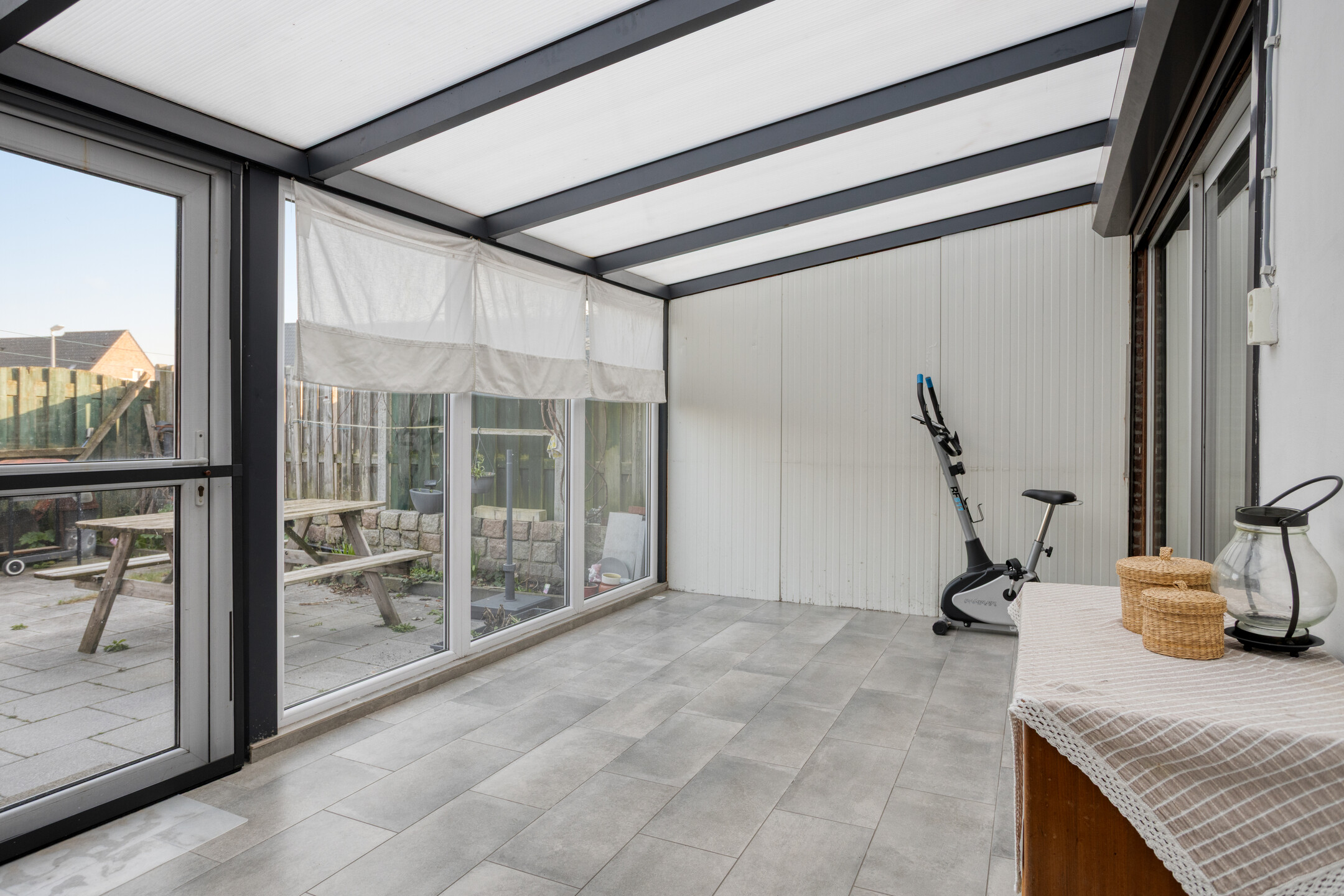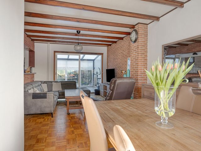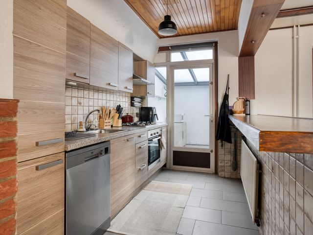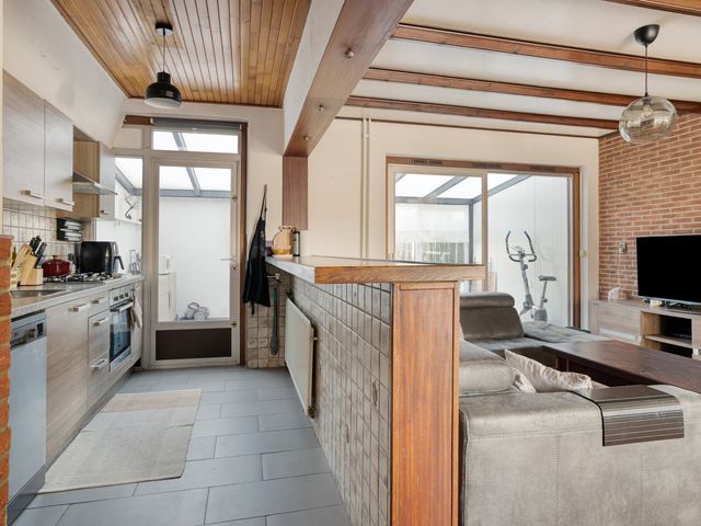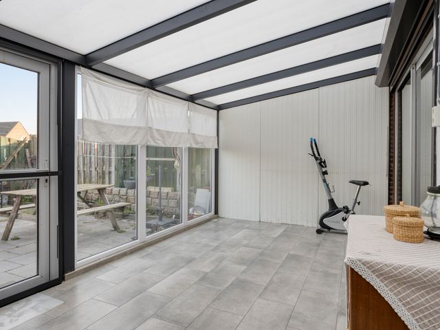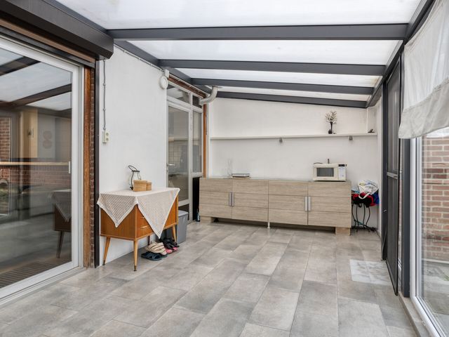 Vanuit de keuken bereik je de aangebouwde serre. Deze ruimte vormt een prettige aanvulling op de woonkamer en kan dankzij de schuifpui gemakkelijk bij de leefruimte worden betrokken. Hierdoor ontstaat extra ruimte waar je bijvoorbeeld een zit- of eethoek kunt creëren. De serre is voorzien van een elektrisch rolluik.