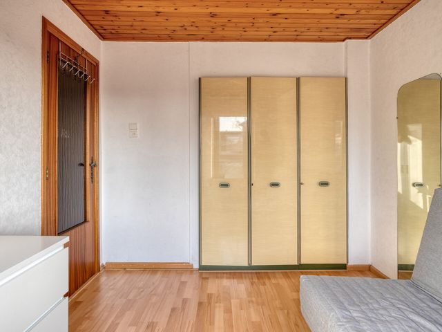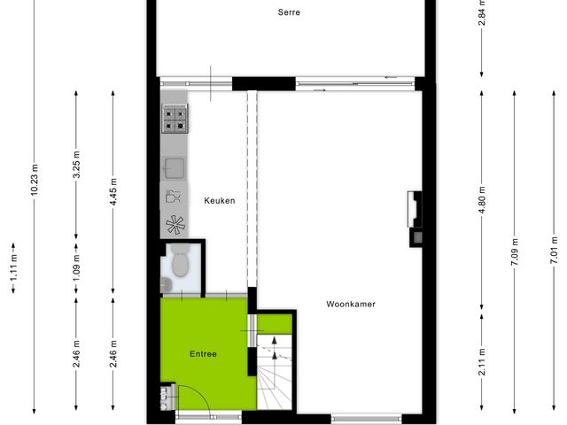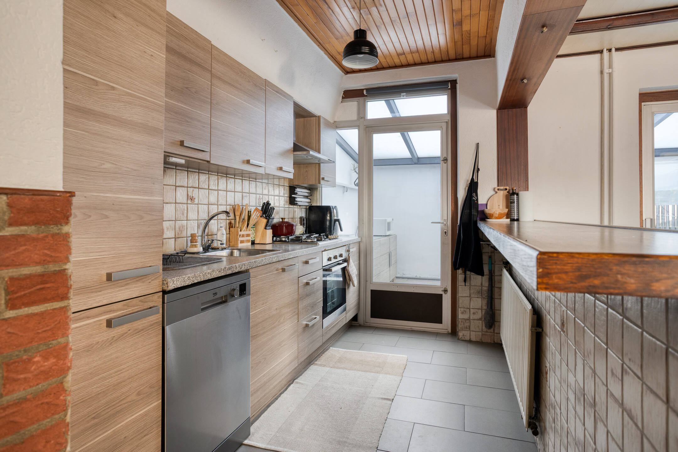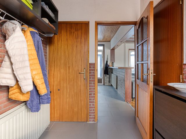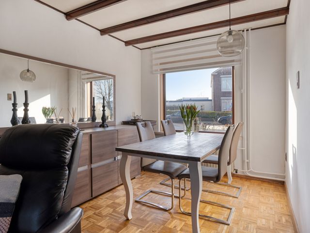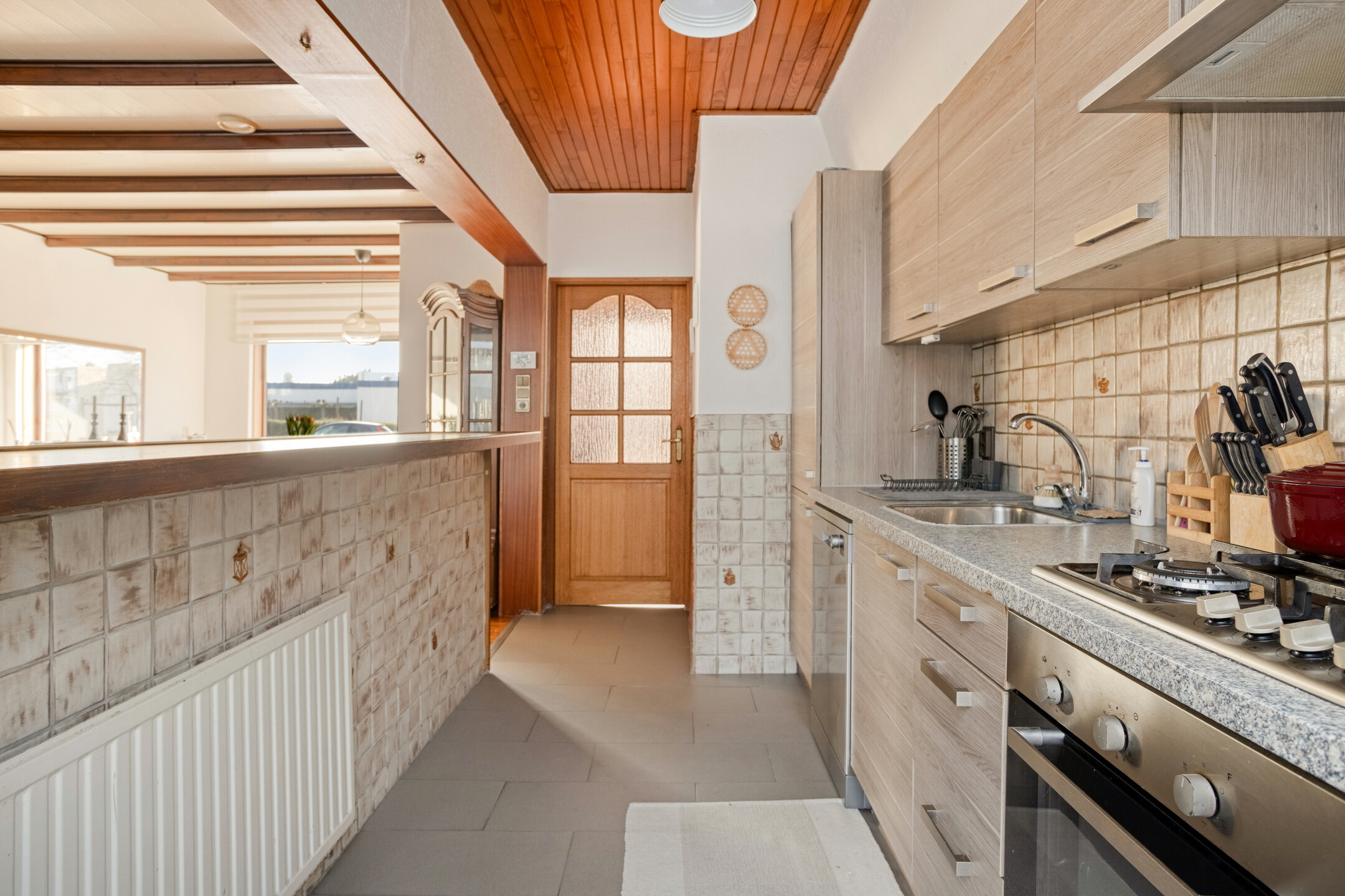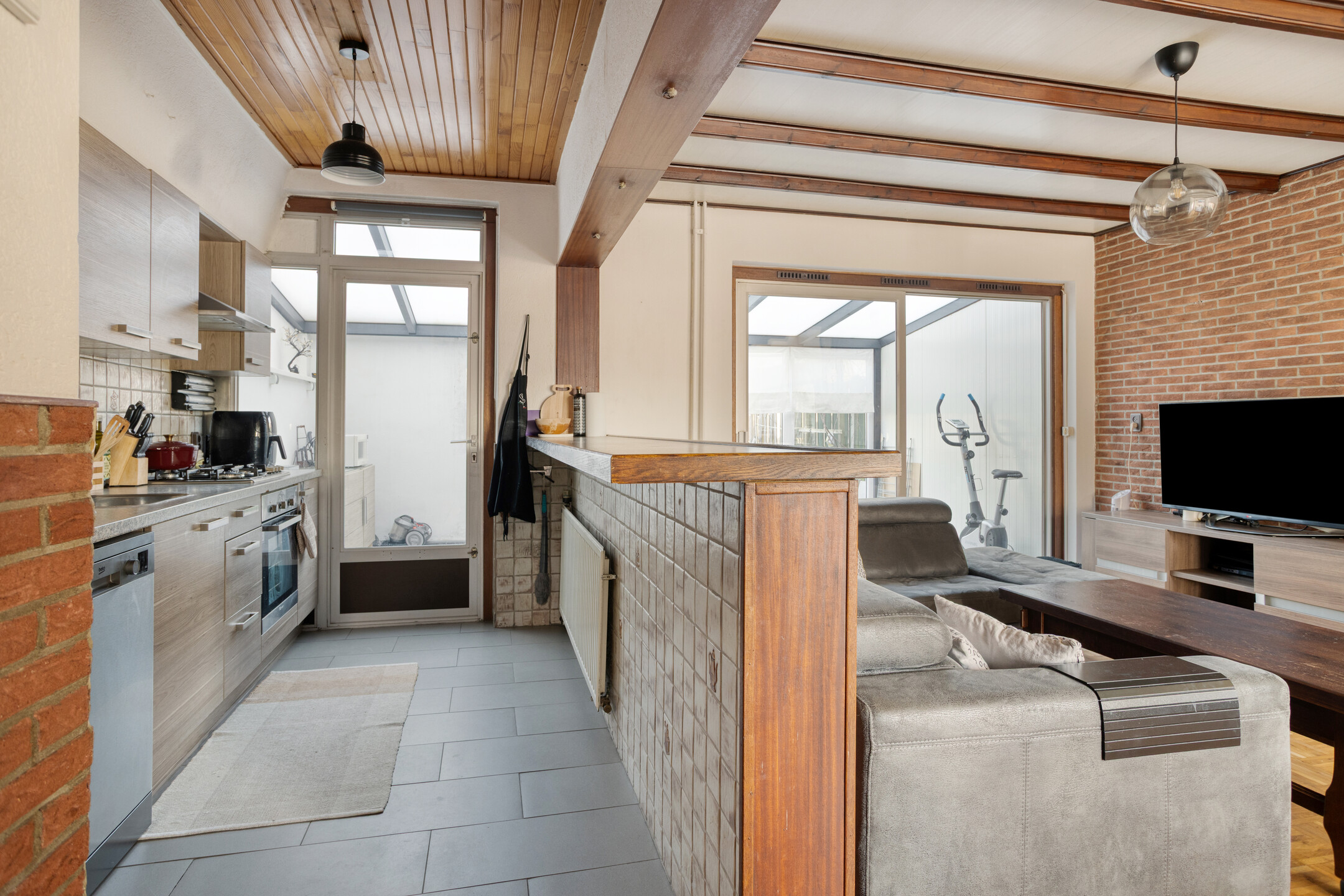 Vanuit de keuken bereik je de aangebouwde serre. Deze ruimte vormt een prettige aanvulling op de woonkamer en kan dankzij de schuifpui gemakkelijk bij de leefruimte worden betrokken. Hierdoor ontstaat extra ruimte waar je bijvoorbeeld een zit- of eethoek kunt creëren. De serre is voorzien van een elektrisch rolluik.
