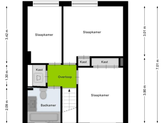 De overloop geeft toegang tot drie slaapkamers, de badkamer en een aparte wasruimte met aansluitingen voor de wasmachine en droger.