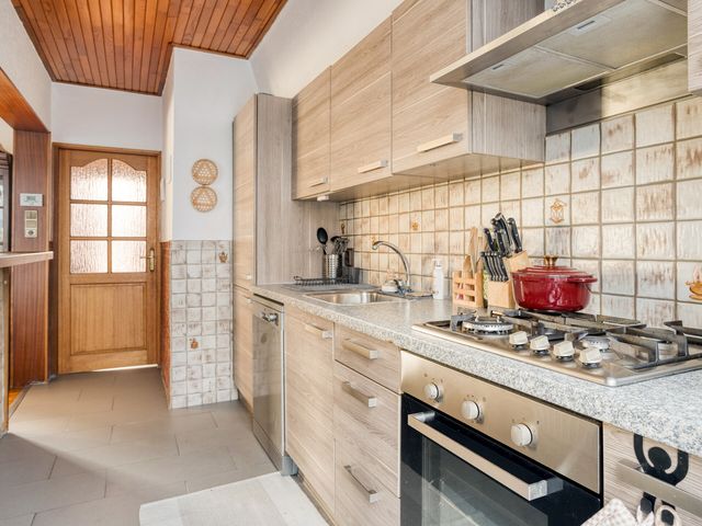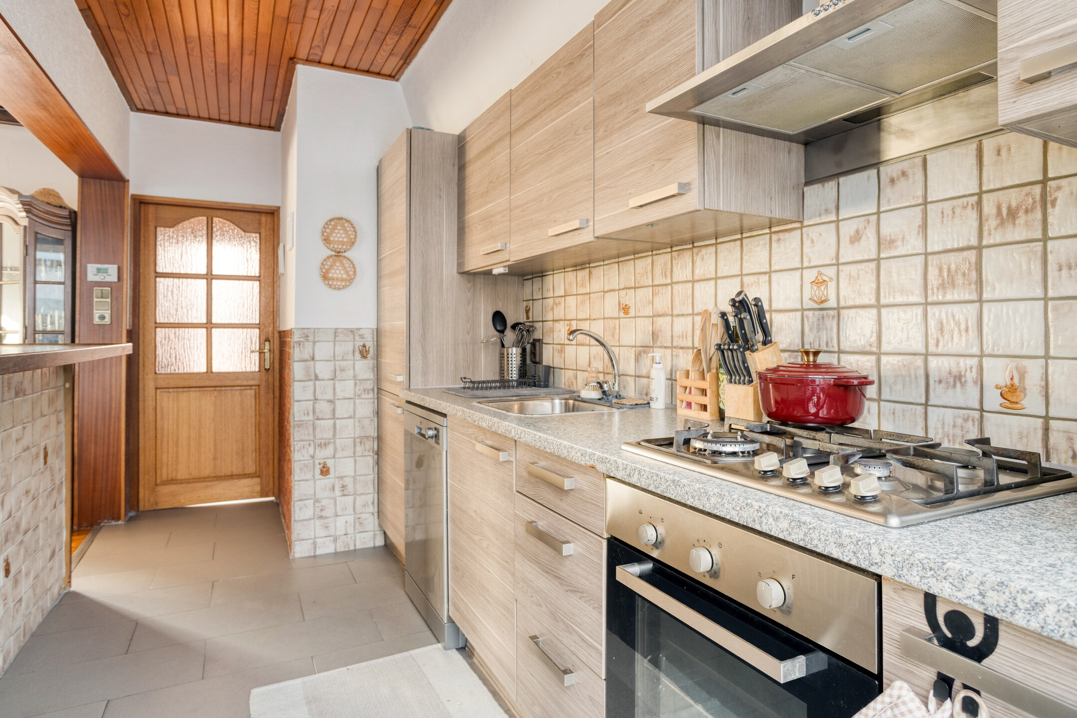 De woonkamer en keuken staan in open verbinding met elkaar. In de woonkamer is ruimte voor zowel een zitgedeelte als een eethoek. De keuken wordt gedeeltelijk gescheiden van de woonkamer door middel van een bar. De keuken is eenvoudig uitgevoerd en biedt mogelijkheden voor modernisering. Momenteel is deze voorzien van een koelkast en vriezer, een spoelbak met kraan, een oven, vaatwasser, gasfornuis en diverse laden en kasten.