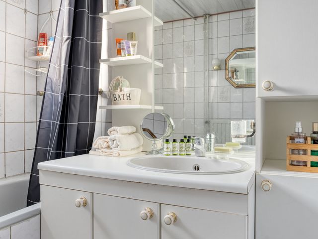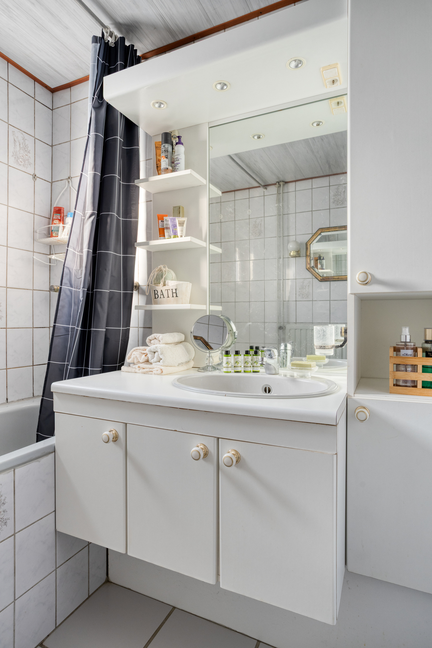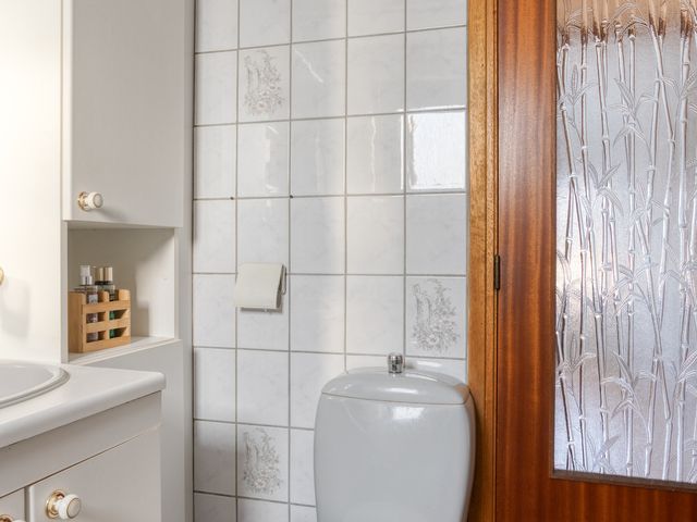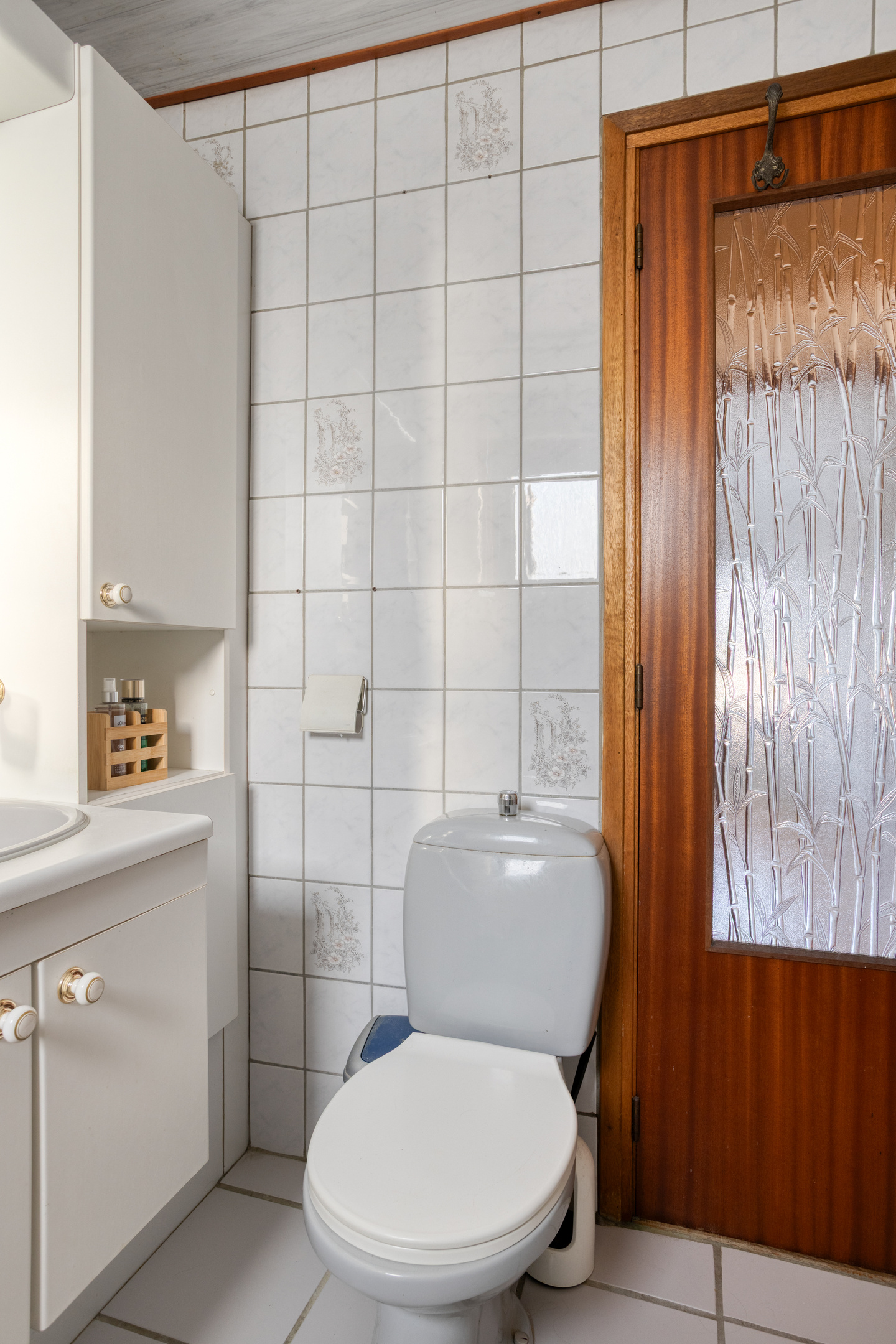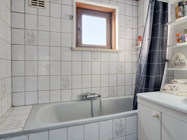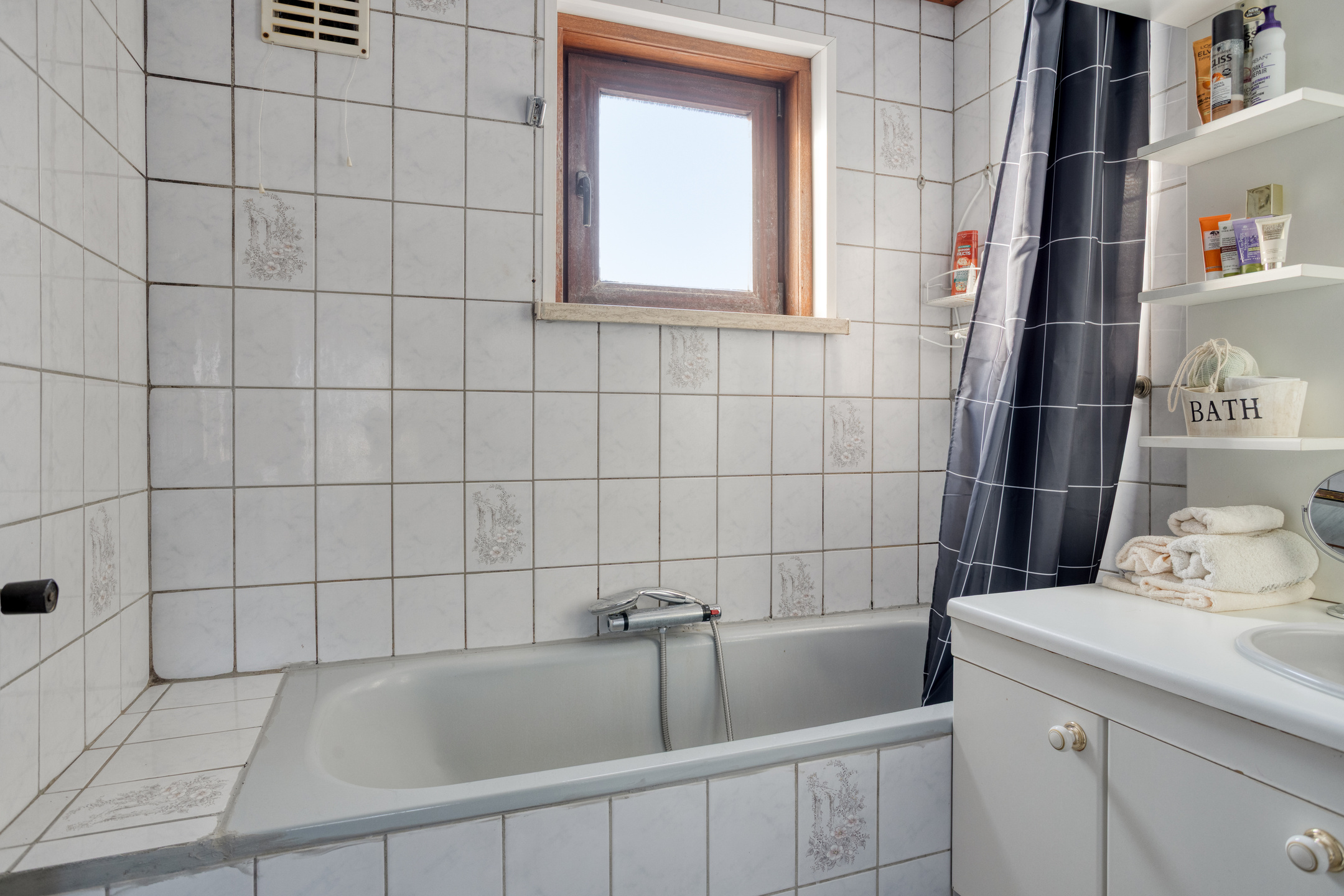 De badkamer is voorzien van een tweede toilet, een douchebad, een wastafel met meubel, een radiator en een raam.
