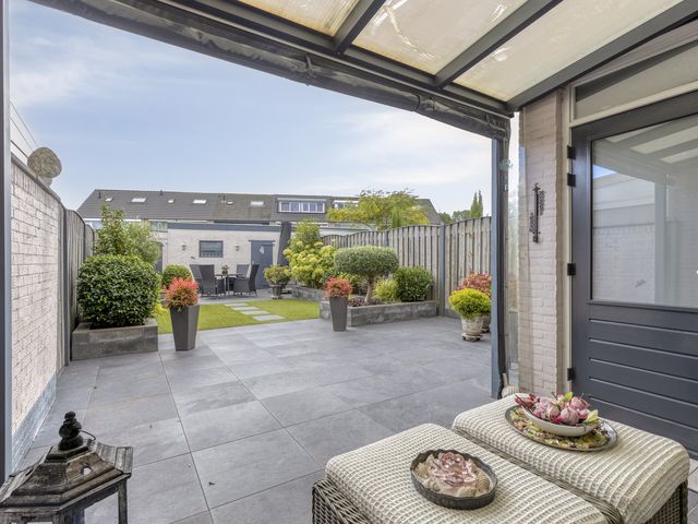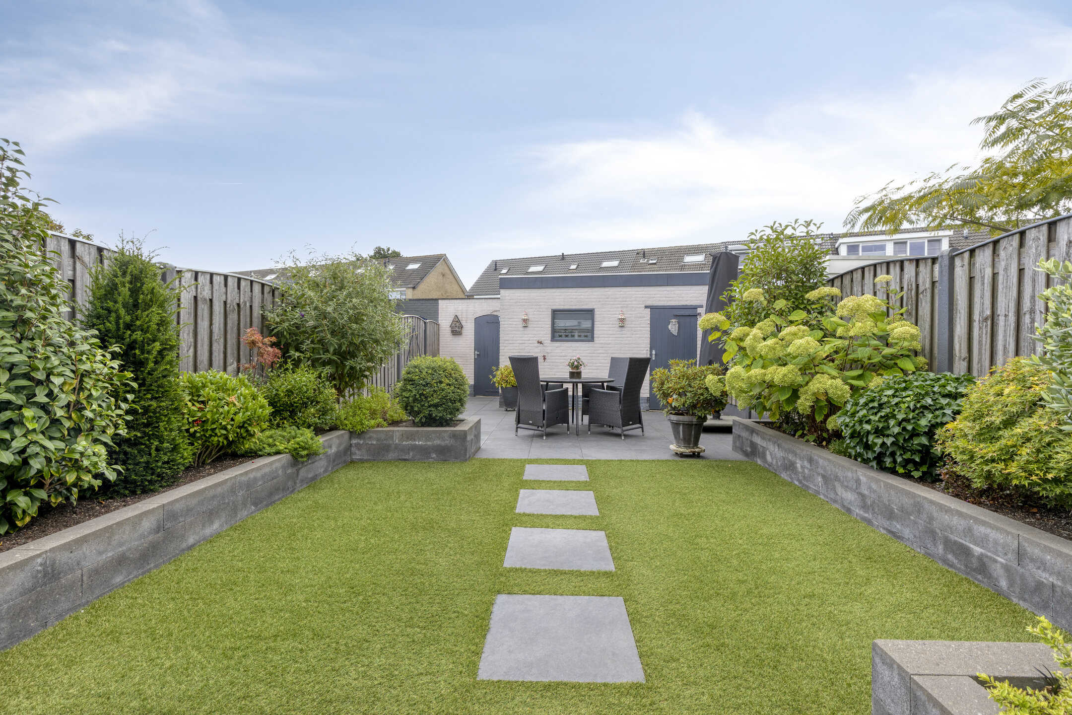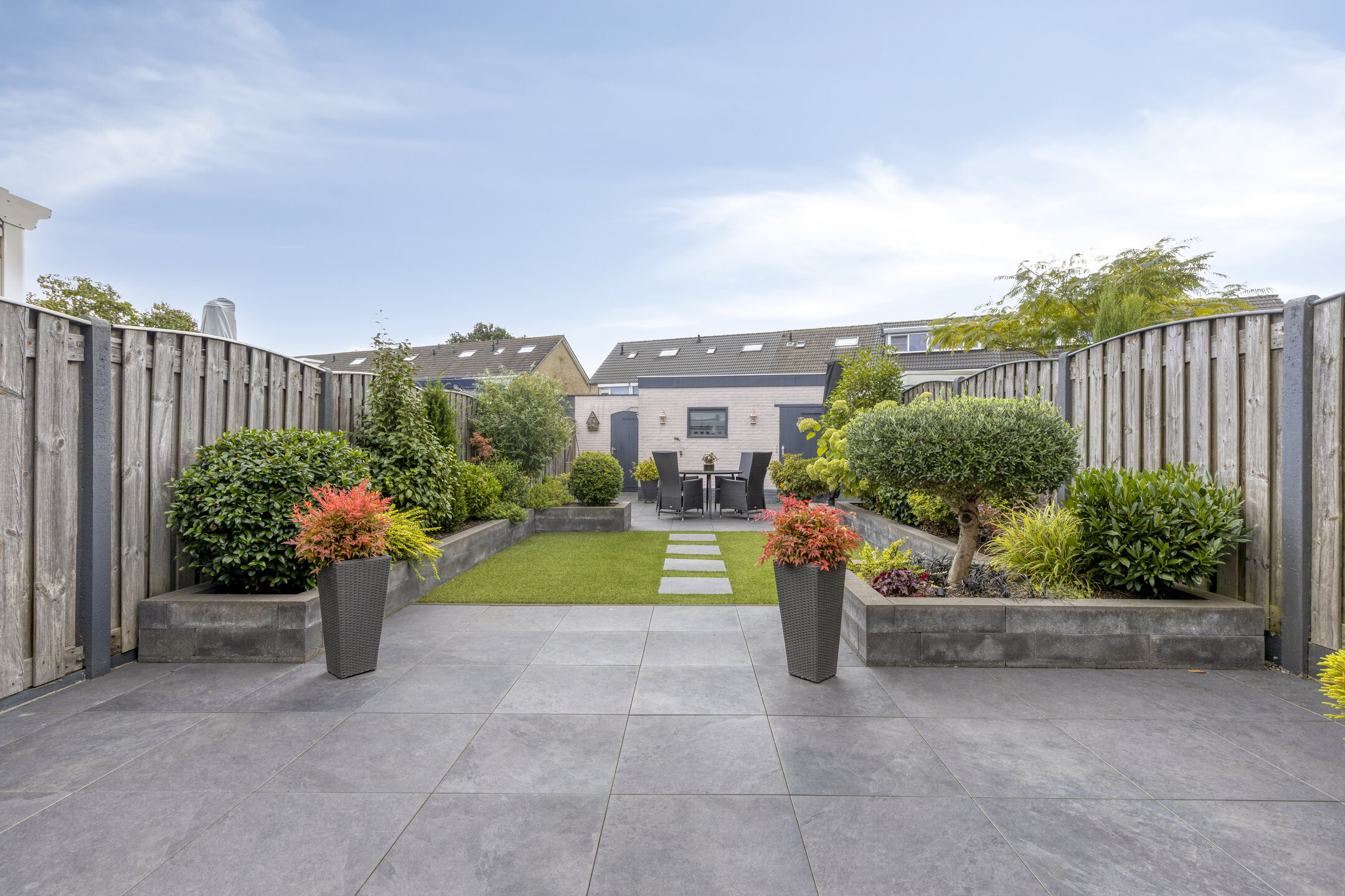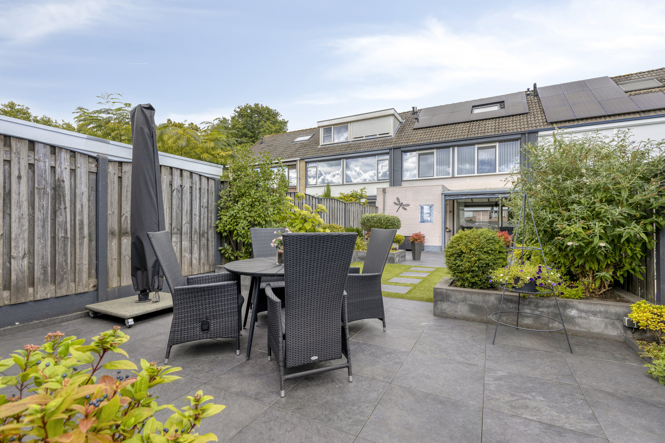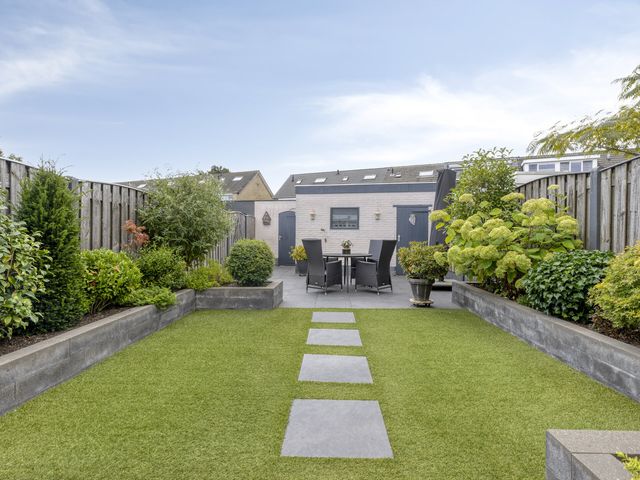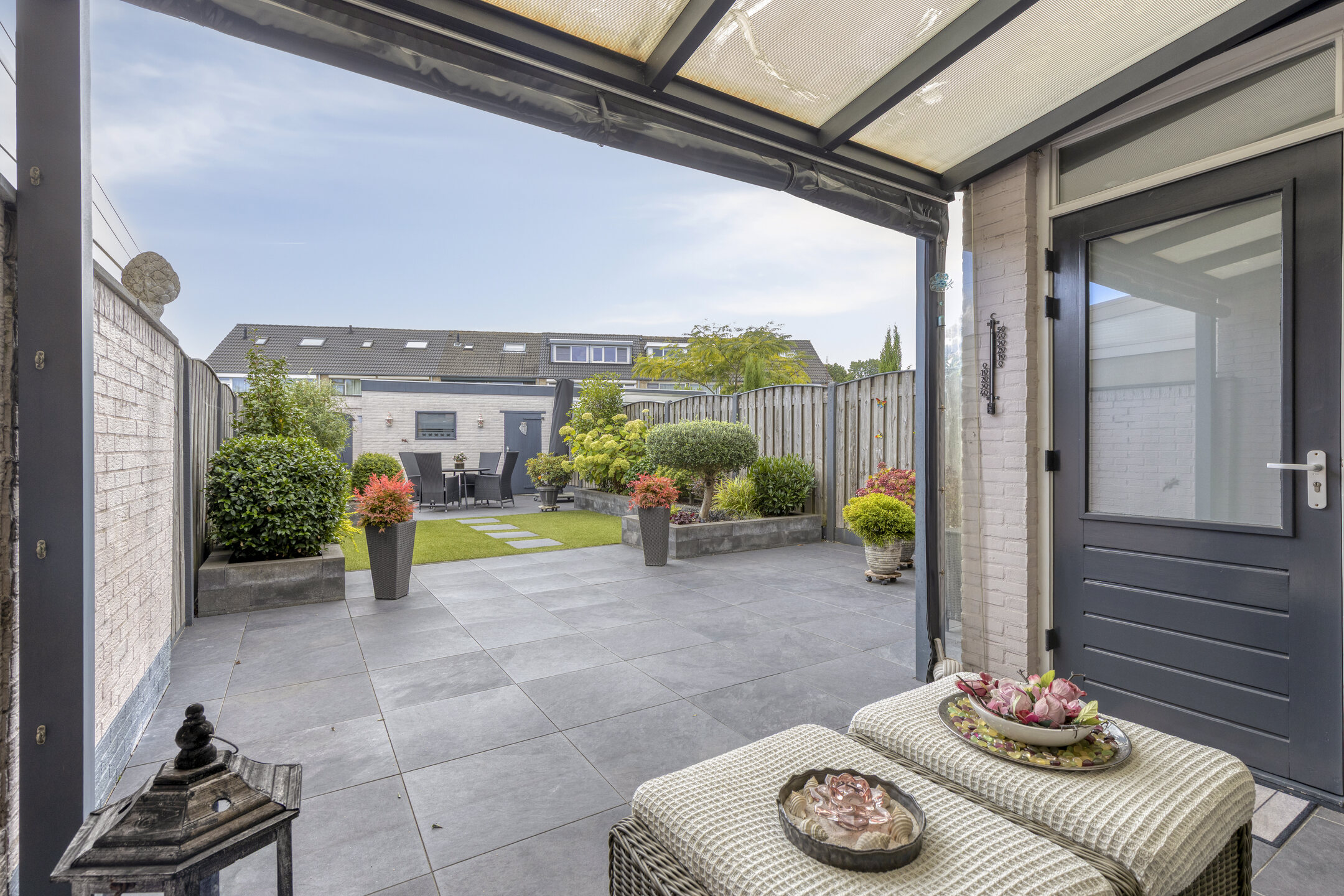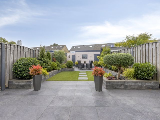 Verderop is de tuin onderhoudsvriendelijk aangelegd met sierbestrating, grondspots, plantenbakken vol groen en een stukje gazon. Achterin vind je een tweede terras, ideaal voor een loungeset of een eettafel in de zon.
