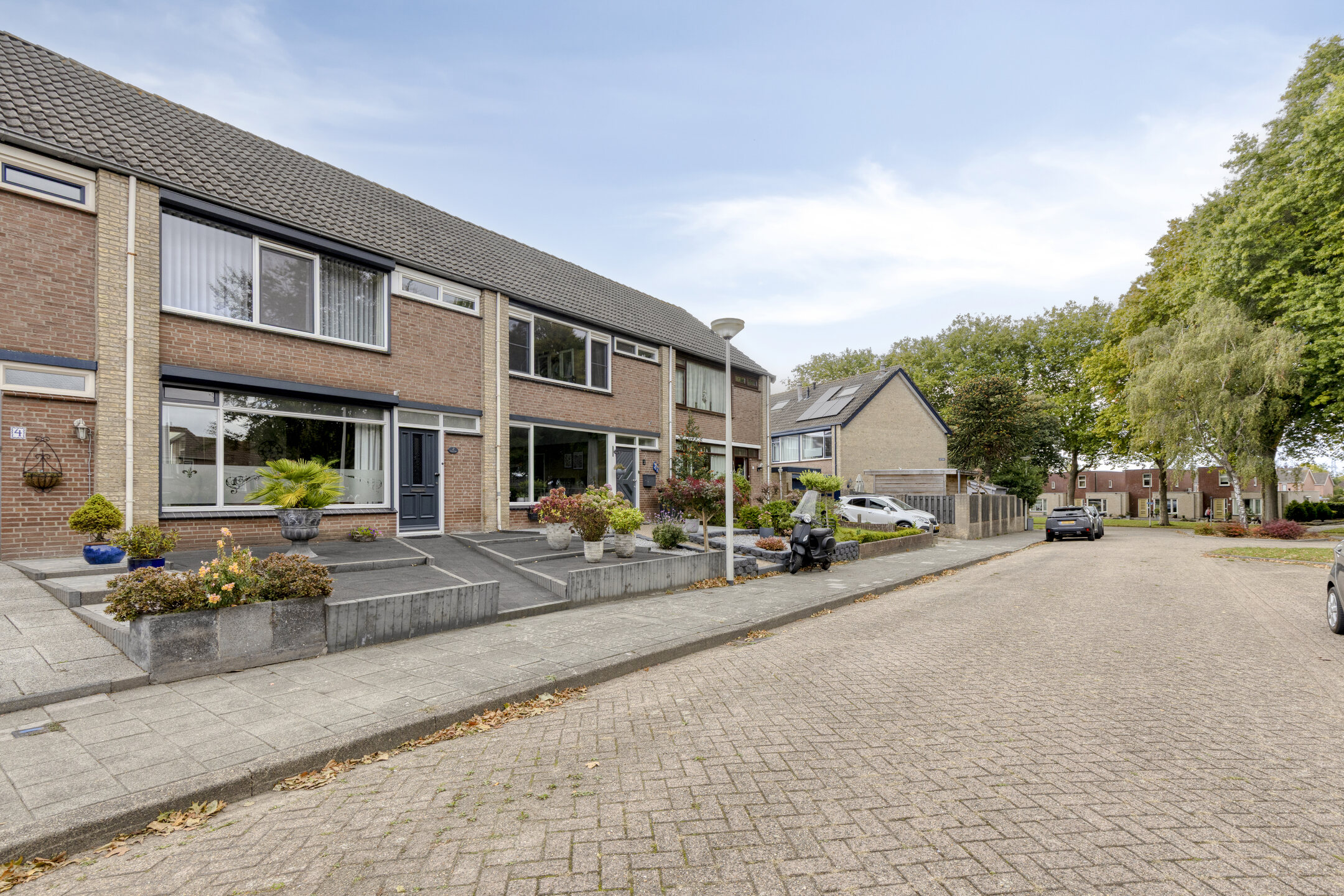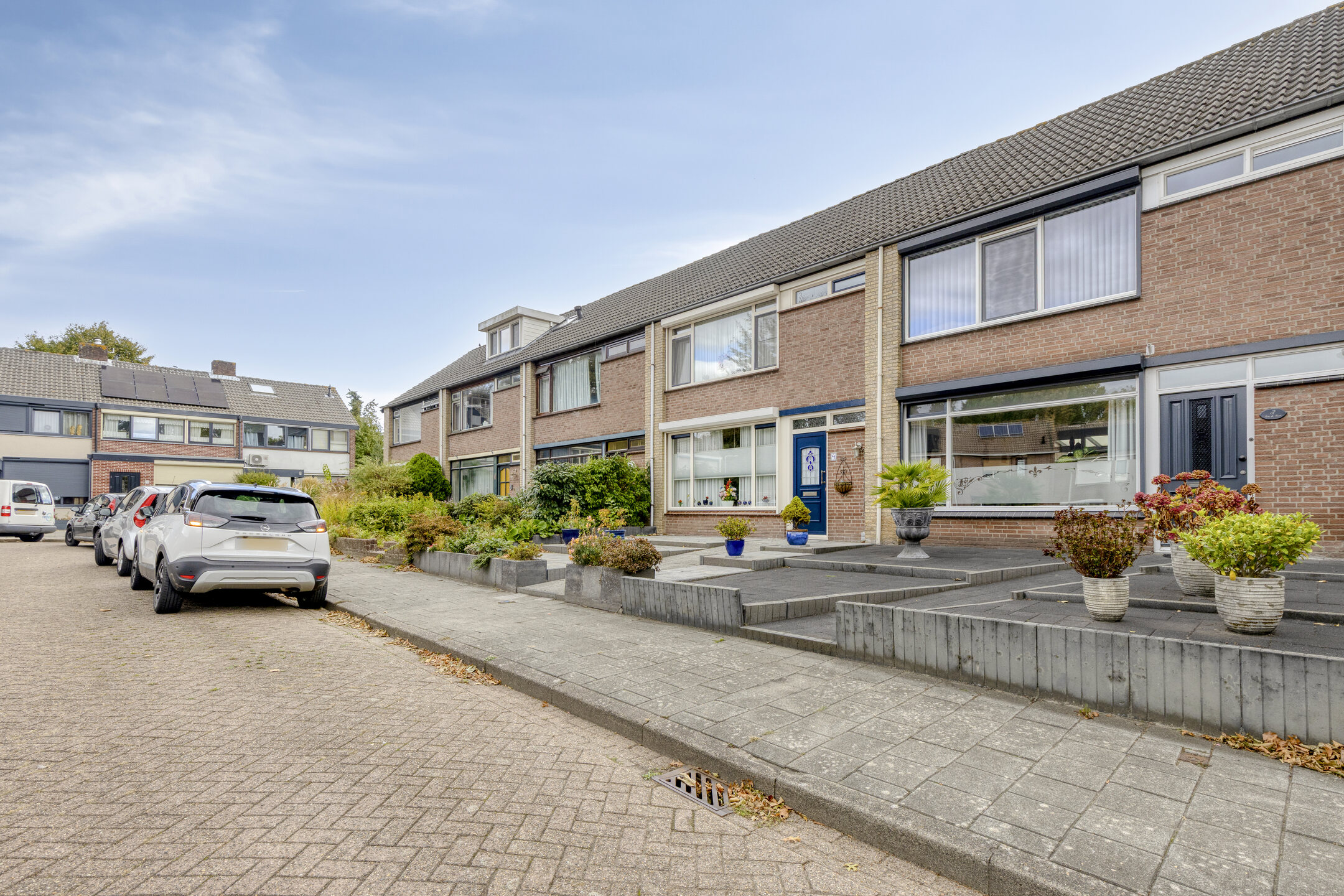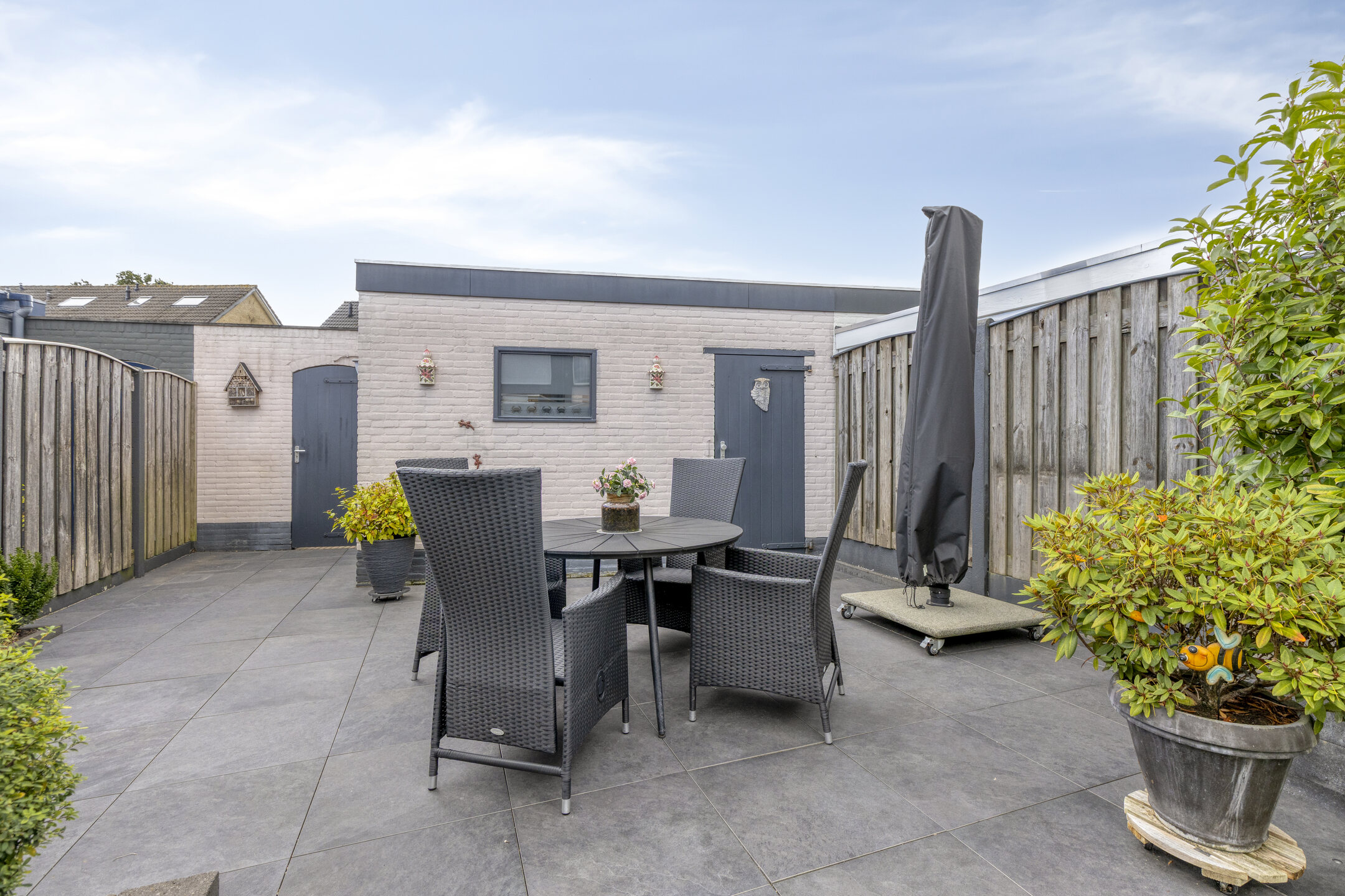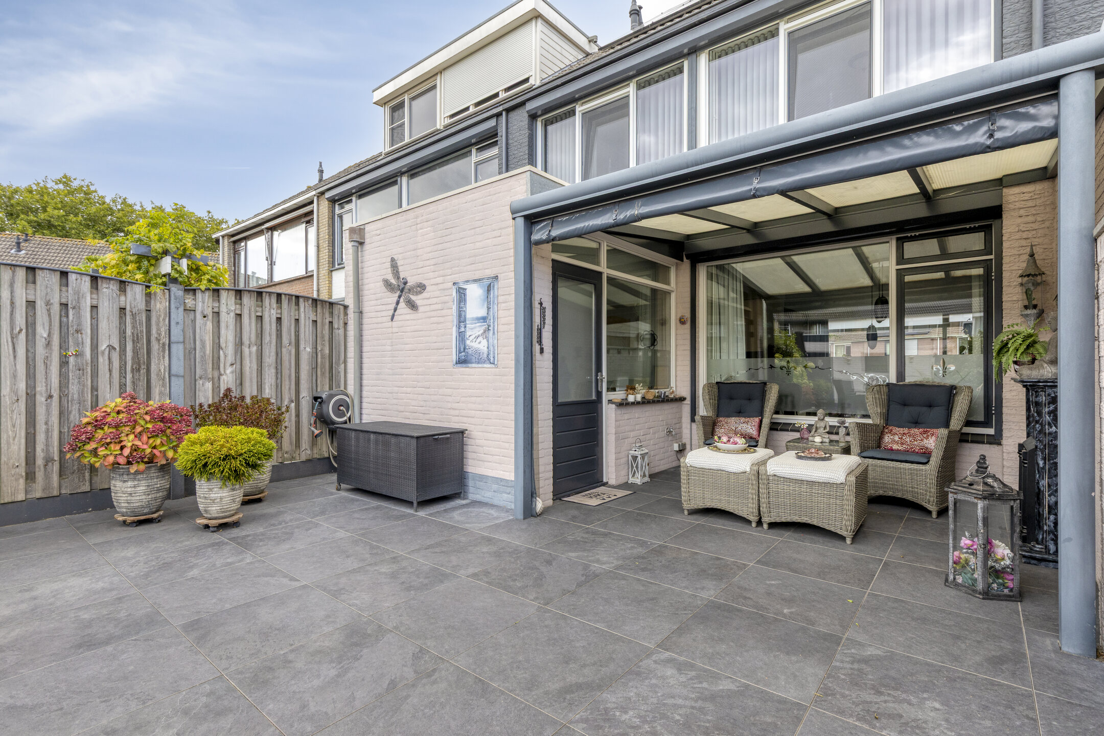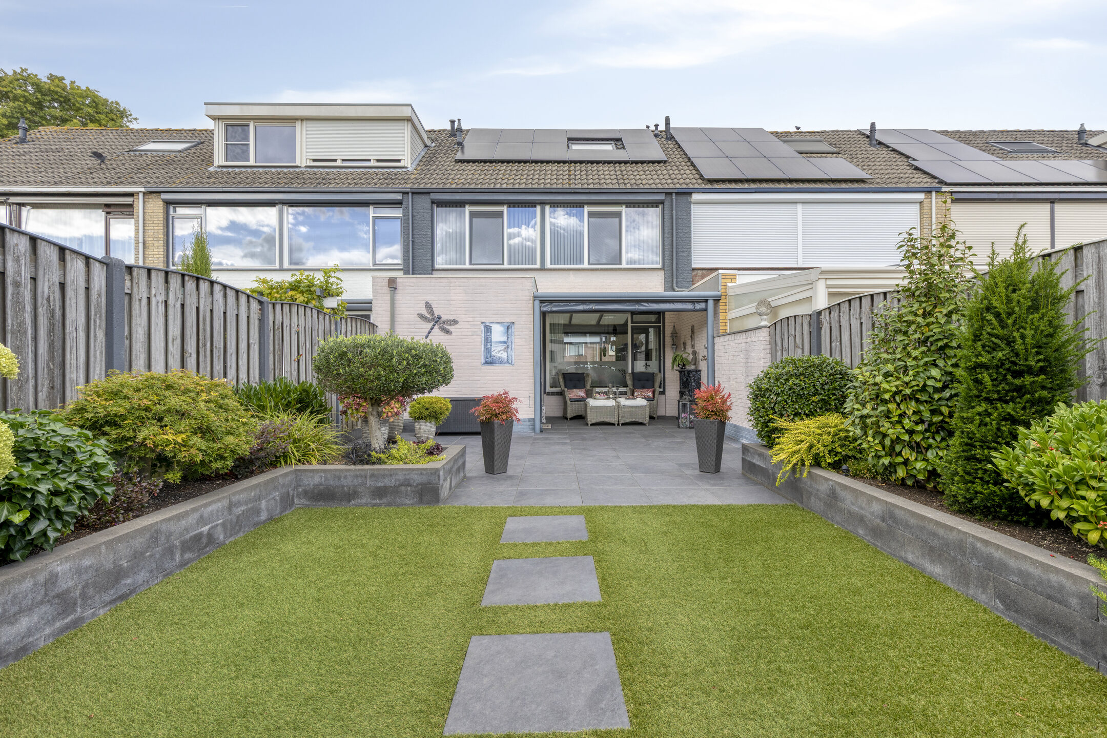 Verderop is de tuin onderhoudsvriendelijk aangelegd met sierbestrating, grondspots, plantenbakken vol groen en een stukje gazon. Achterin vind je een tweede terras, ideaal voor een loungeset of een eettafel in de zon.