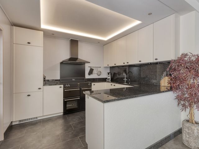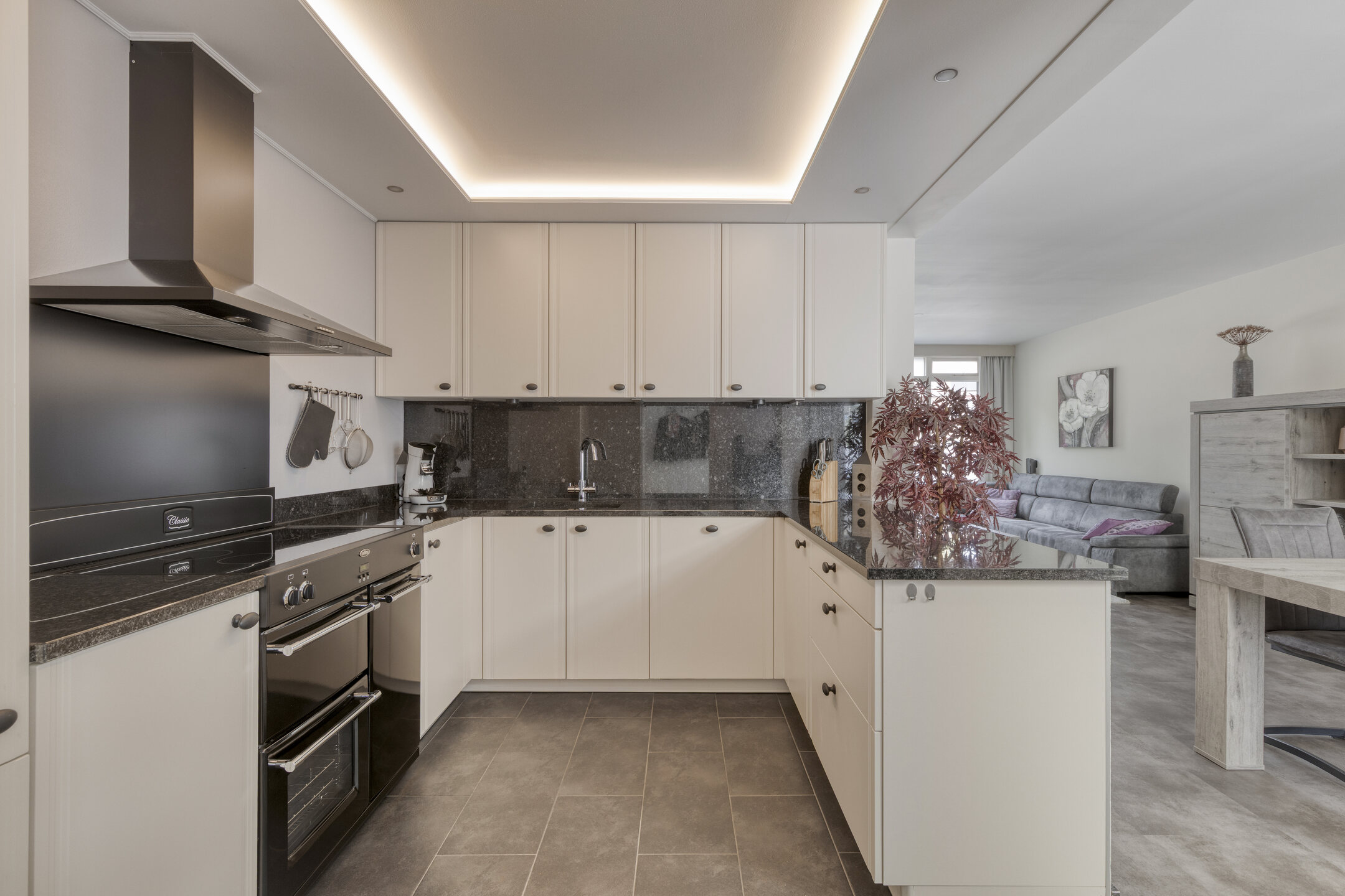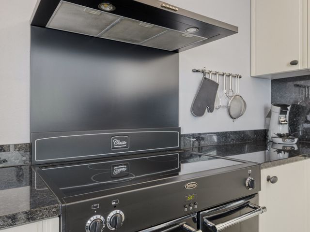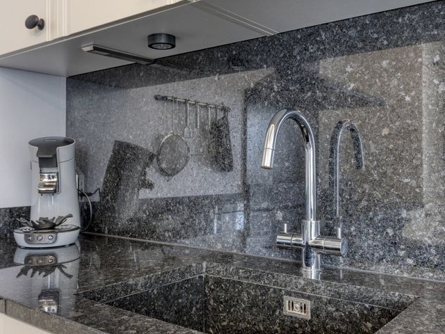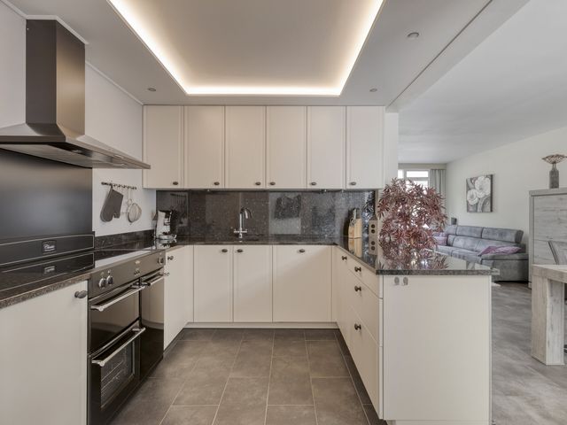 Aansluitend vind je de open keuken, die praktisch is ingericht en voorzien van een koelkast, oven, inductiekookplaat met afzuigkap, een spoelbak met kraan én volop kastruimte. Dankzij de praktische indeling kun je heerlijke gerechten maken en tegelijkertijd genieten van alle gezelligheid.