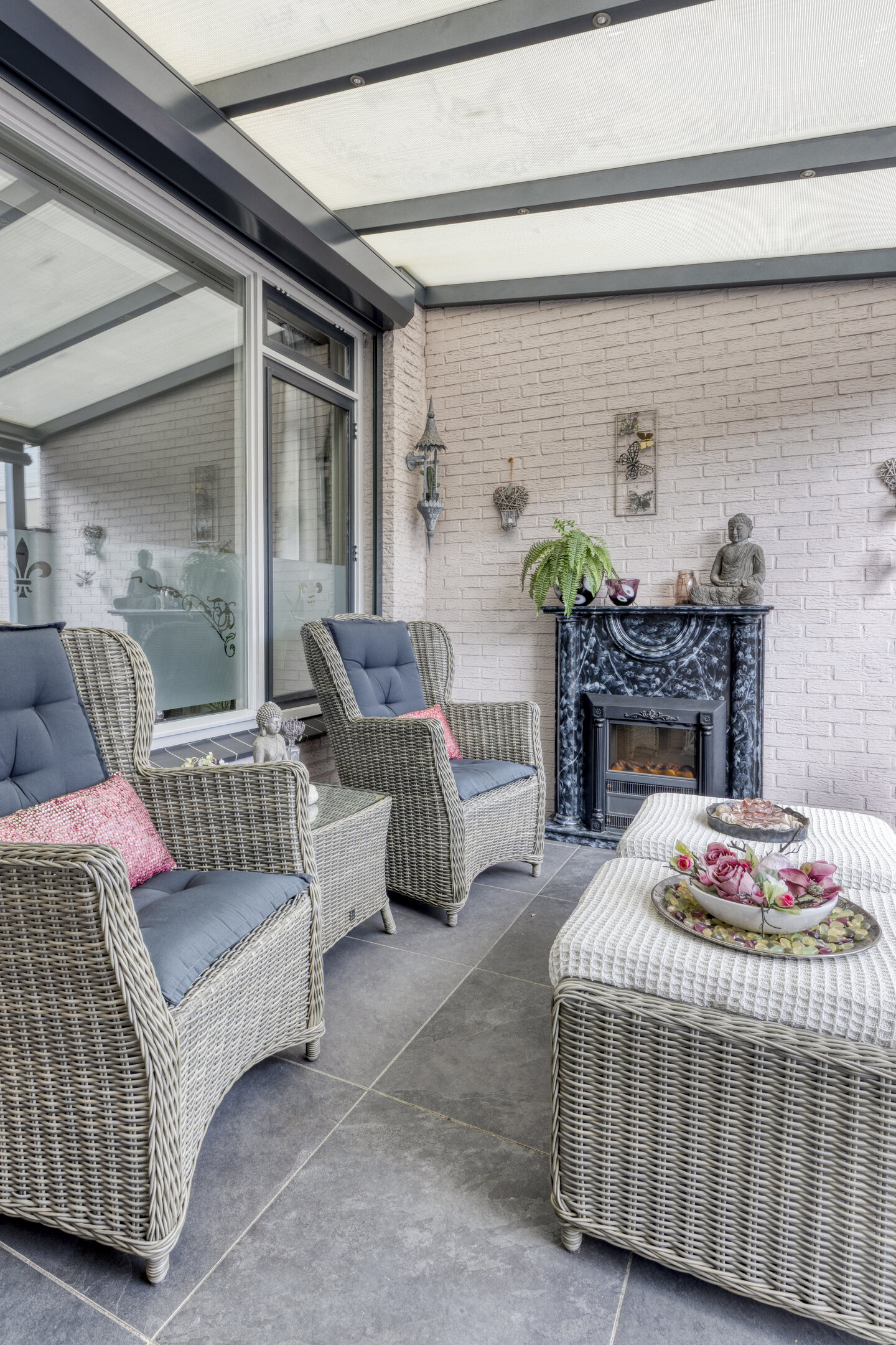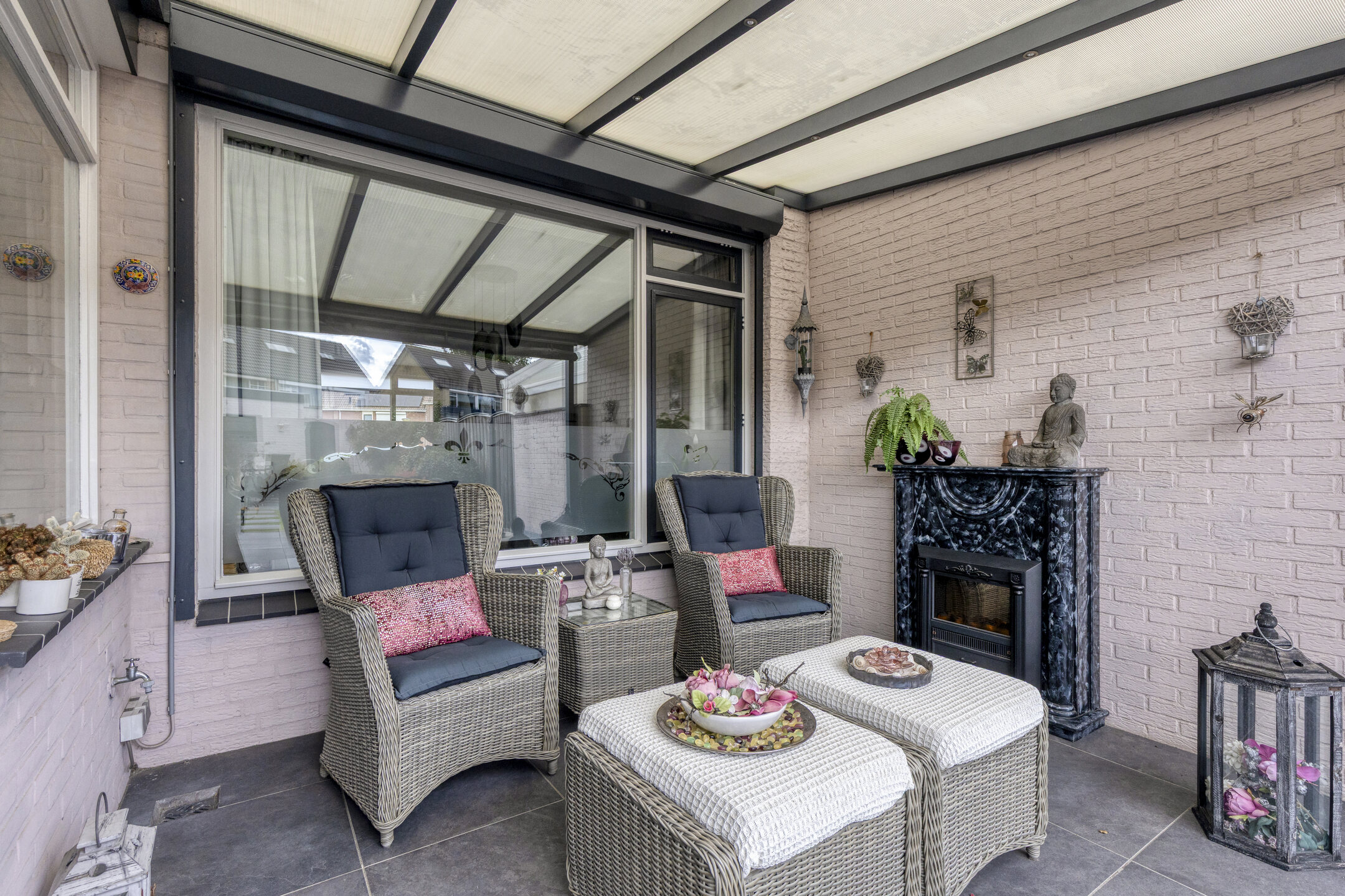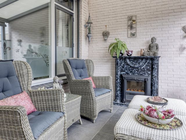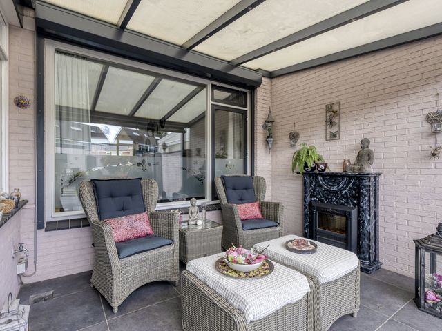Zodra je vanuit de bijkeuken de tuin instapt, kom je eerst onder de gezellige overkapping met open haard. Een sfeervolle plek waar je elk seizoen kunt genieten — van gezellige zomeravonden tot knusse wintermomenten bij het knisperende vuur. Hier wil je niet meer weg!
