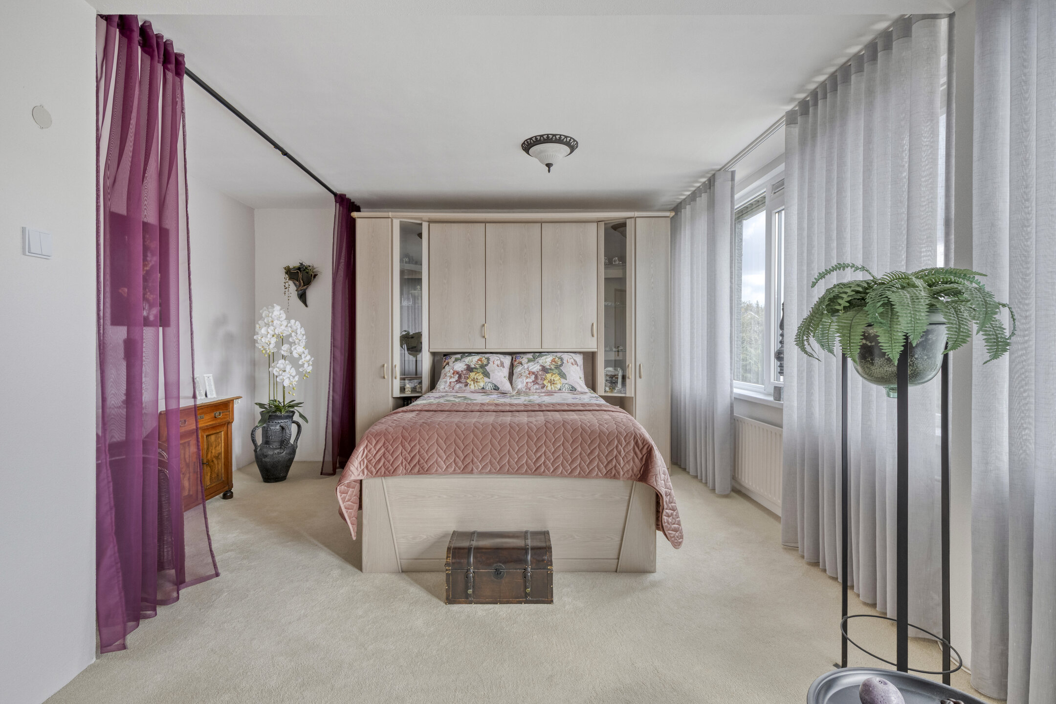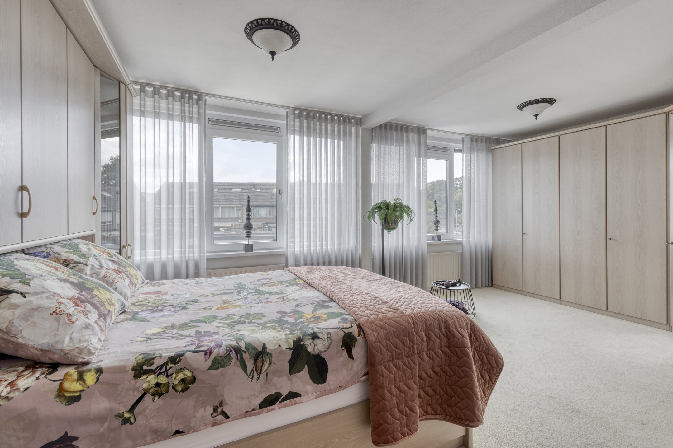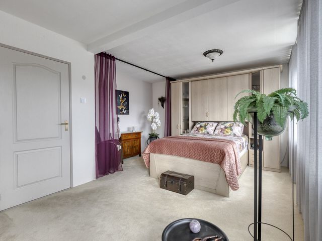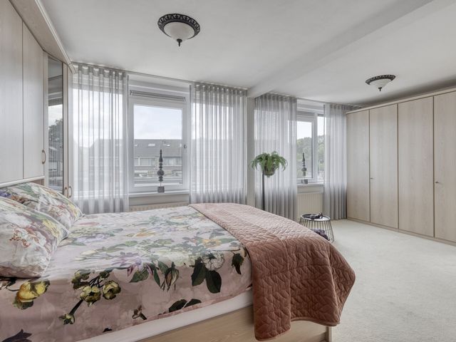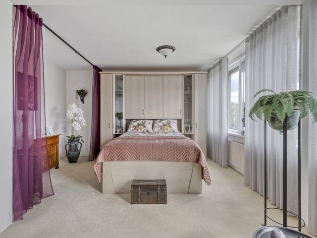 De hoofdslaapkamer is een echte eyecatcher: verrassend groot, met een brede raampartij over de hele breedte van de kamer. Daardoor is het hier altijd licht en luchtig. Er is ruimte genoeg voor een kingsize bed, een grote kledingkast én eventueel een wand voor een walk-in closet — een luxe toevoeging die hier moeiteloos past.