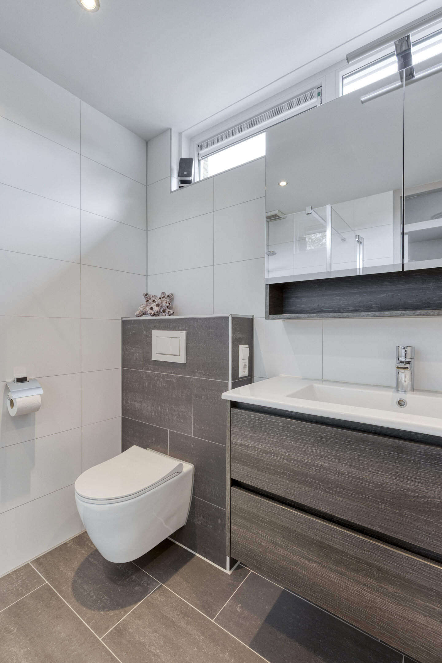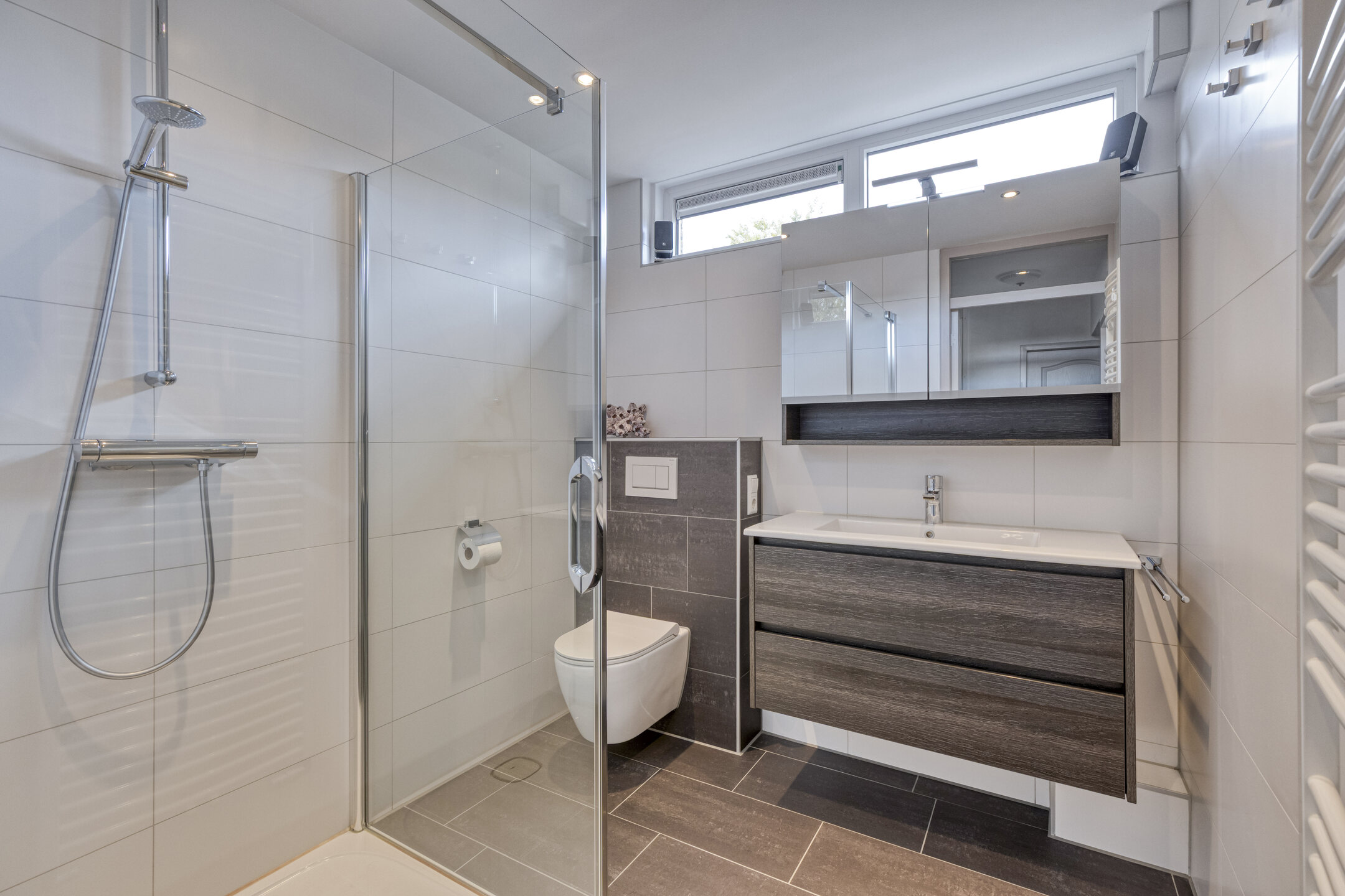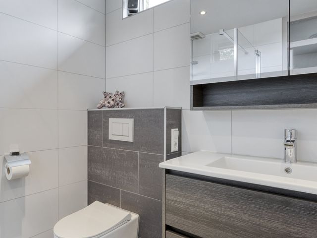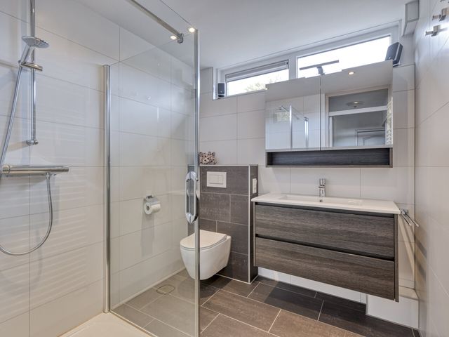 De badkamer (2019 verbouwd) is helemaal van deze tijd. Strak betegeld, fris en voorzien van een plavuizen vloer, een douche met glazen wand, tweede toilet, wastafelmeubel, vloerverwarming en handdoekradiator. De bovenramen zorgen voor natuurlijk licht en ventilatie. Hier start je de dag fris en eindig je hem ontspannen.