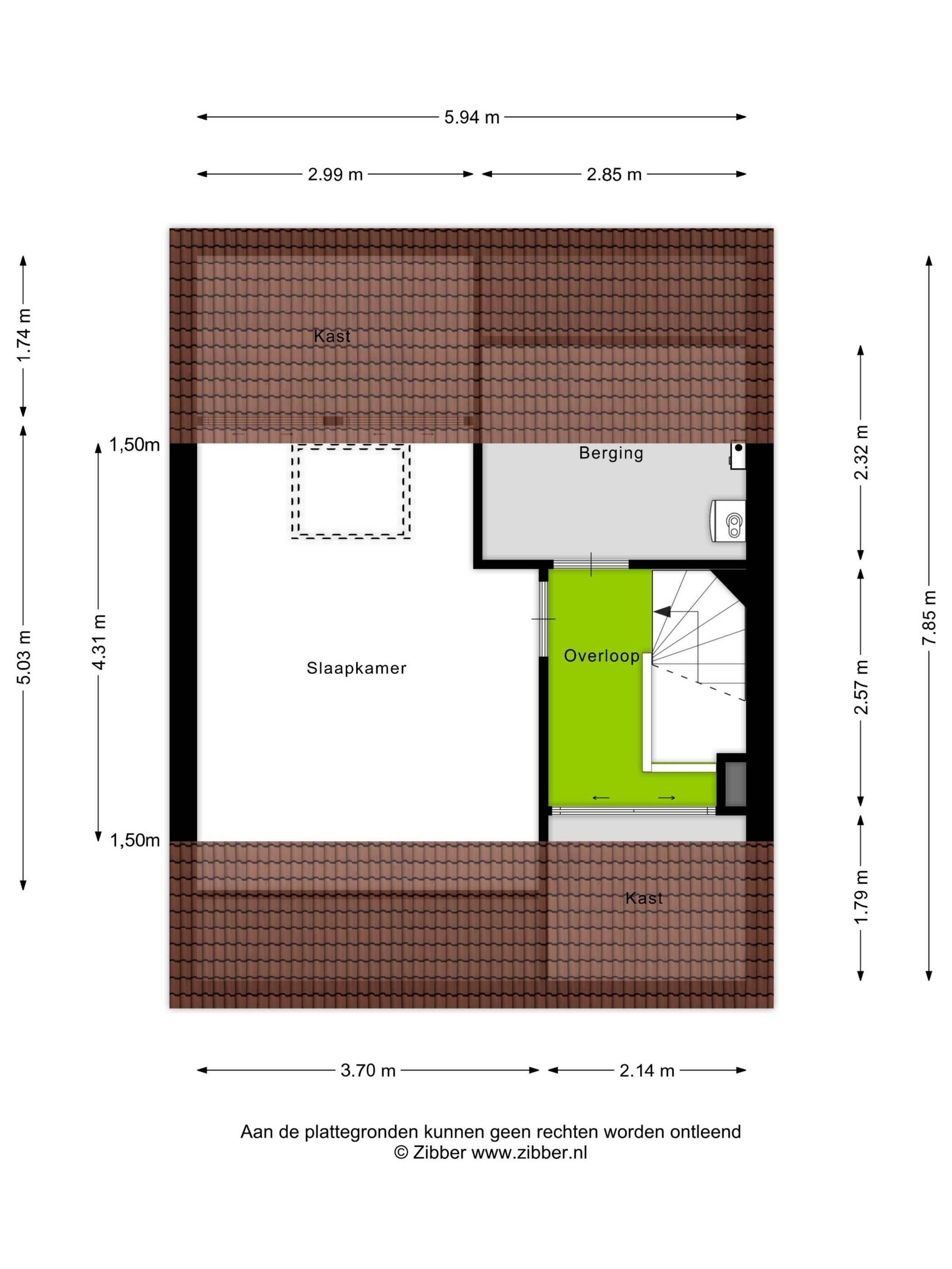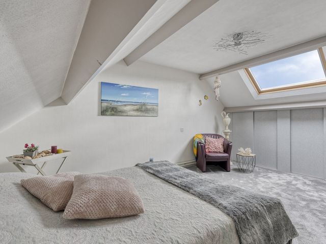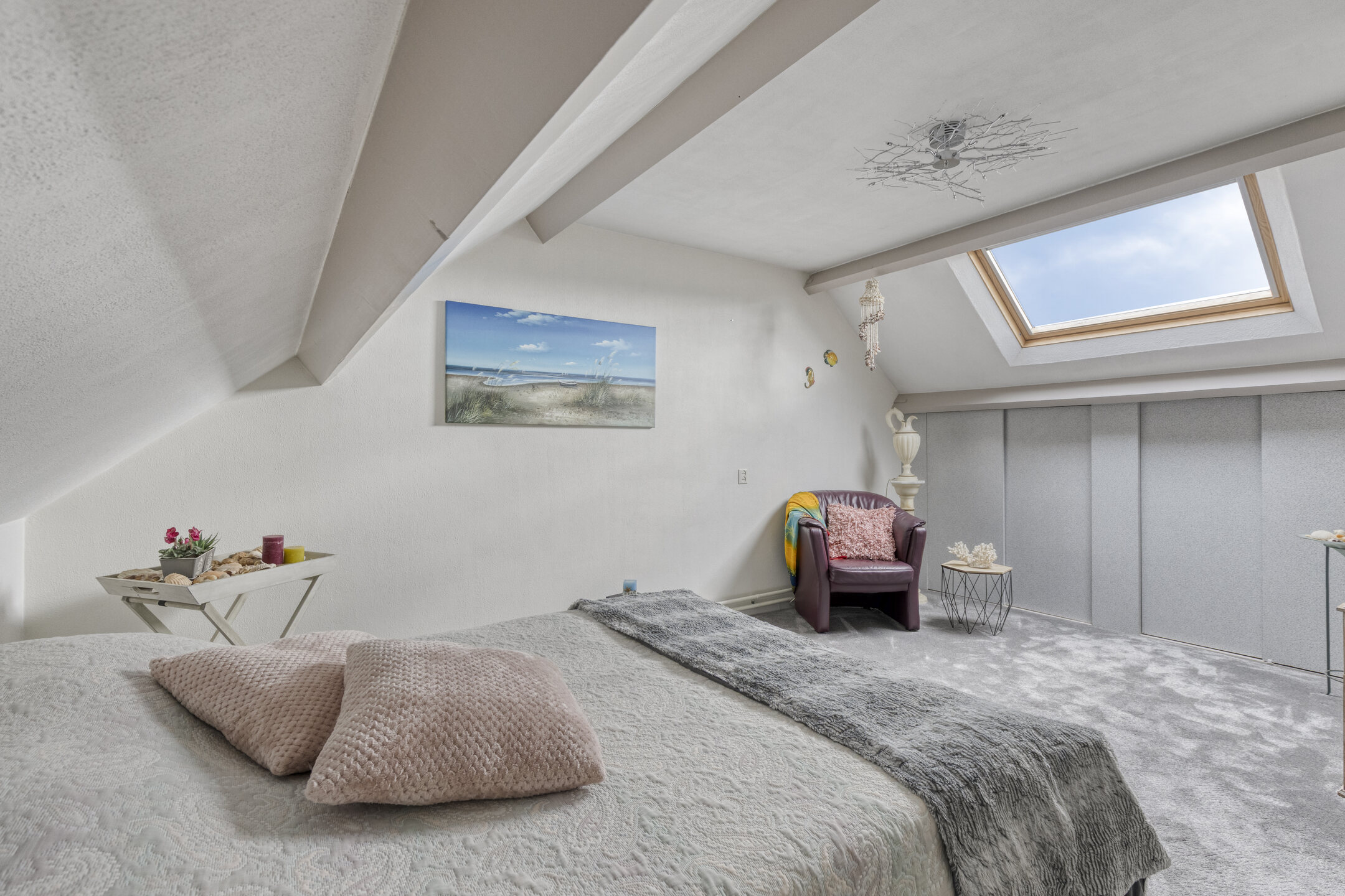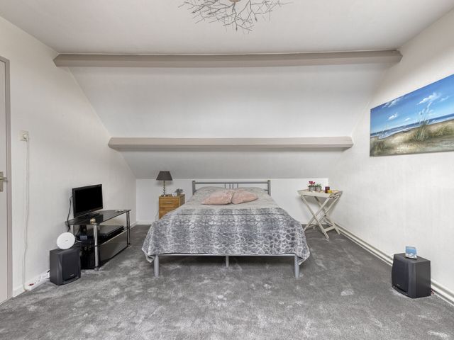 Ook deze kamer is ruim en licht, dankzij het dakraam. Perfect als extra slaapkamer, logeerkamer, hobbyruimte of kantoor aan huis. Achter de knieschotten vind je bovendien extra opbergruimte — praktisch én netjes weggewerkt.