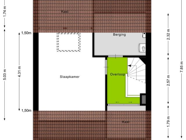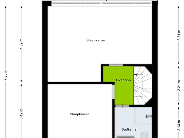 Hier bevindt zich een overloop met een kleine bergruimte én een derde slaapkamer.