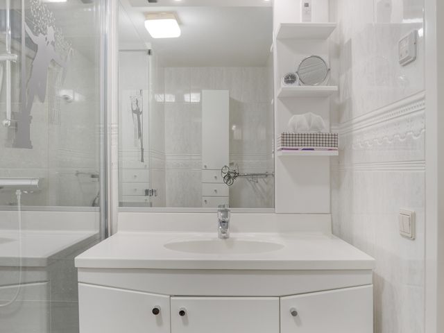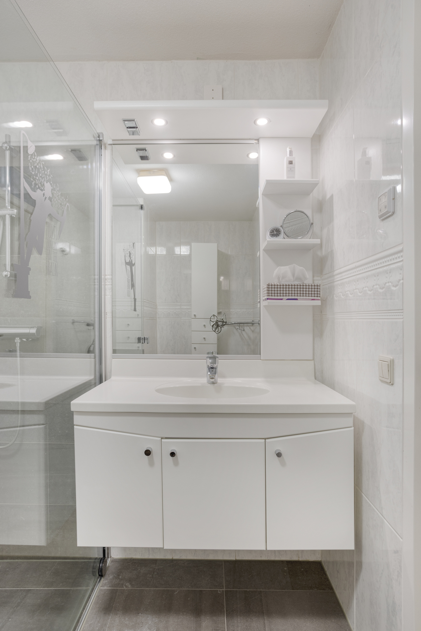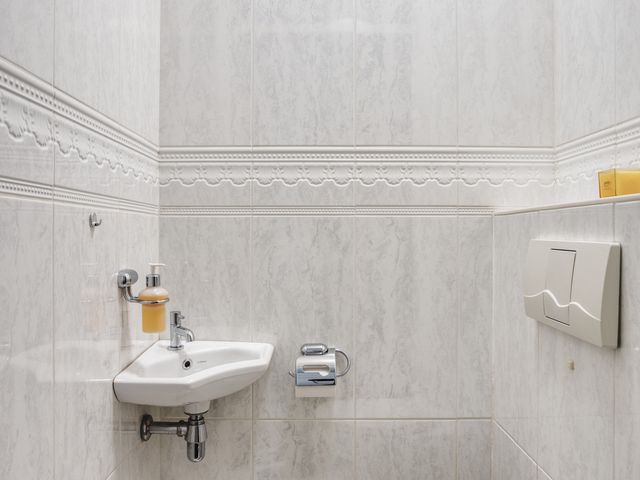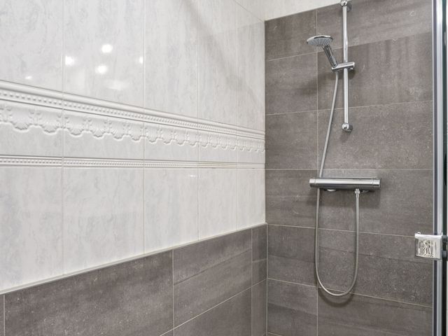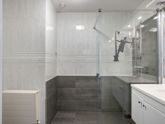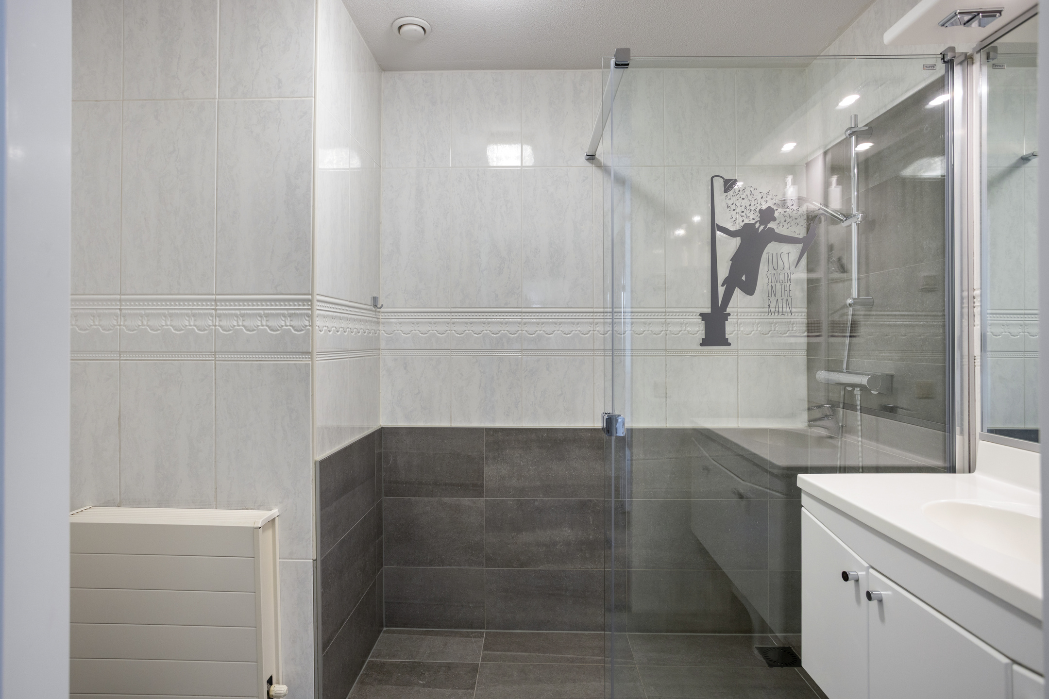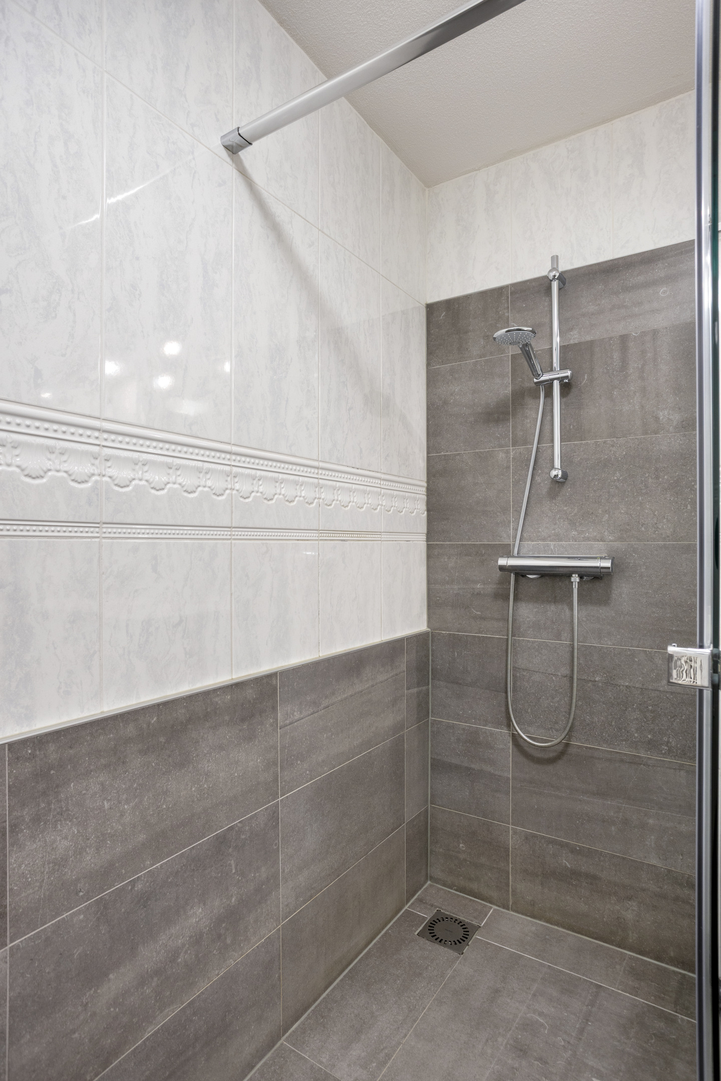 De badkamer is verzorgd en van een goed formaat. Hier vind je een moderne inloopdouche met glazen wand en een wastafel.