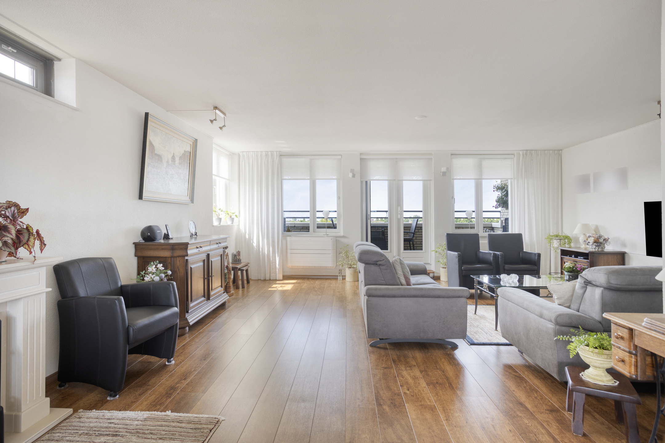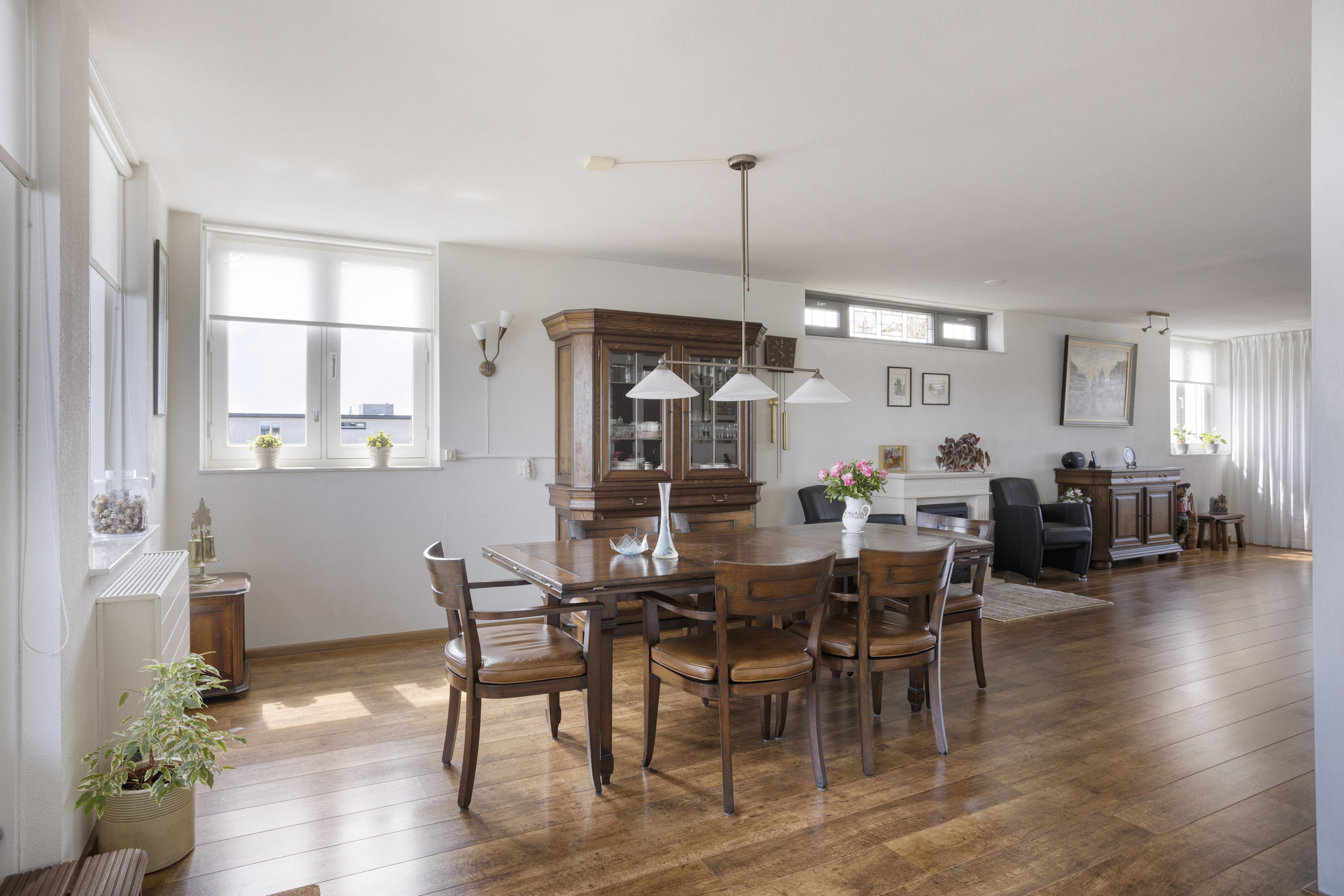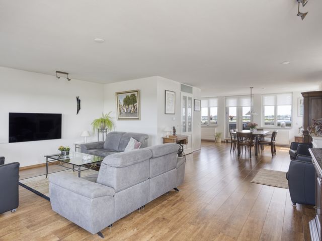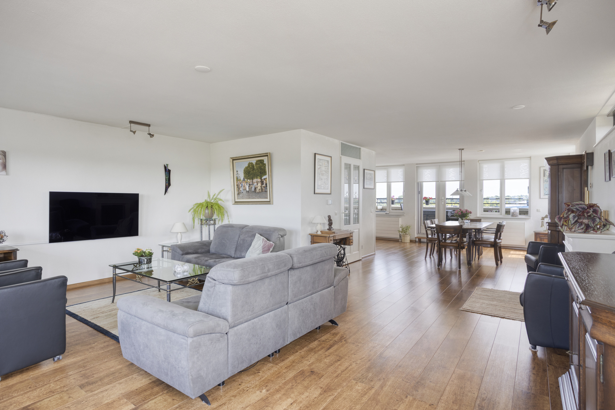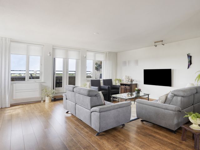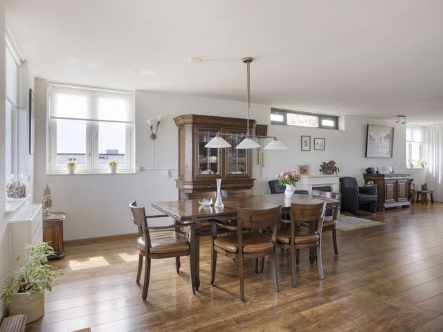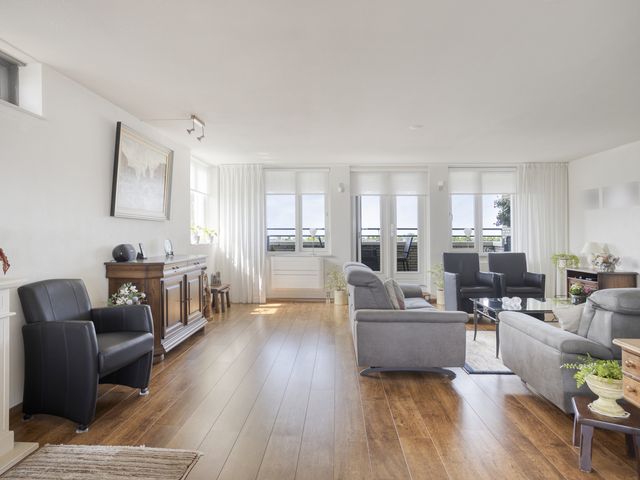 De woonkamer is bijzonder licht dankzij de grote raampartijen en is voorzien van een mooie vloer en een sfeervolle haard, wat zorgt voor een warme en uitnodigende uitstraling. Aansluitend aan de woonkamer bevindt zich een van de twee balkons, een heerlijke plek om in alle rust te genieten van het buitenleven en het weidse uitzicht.