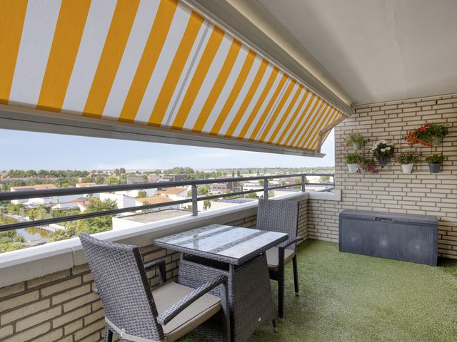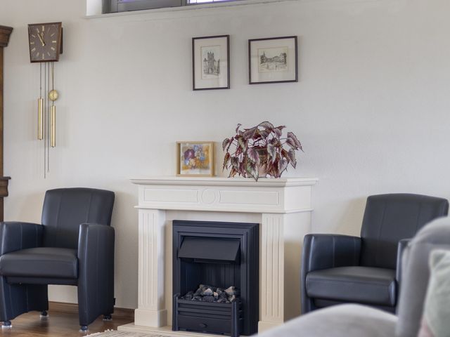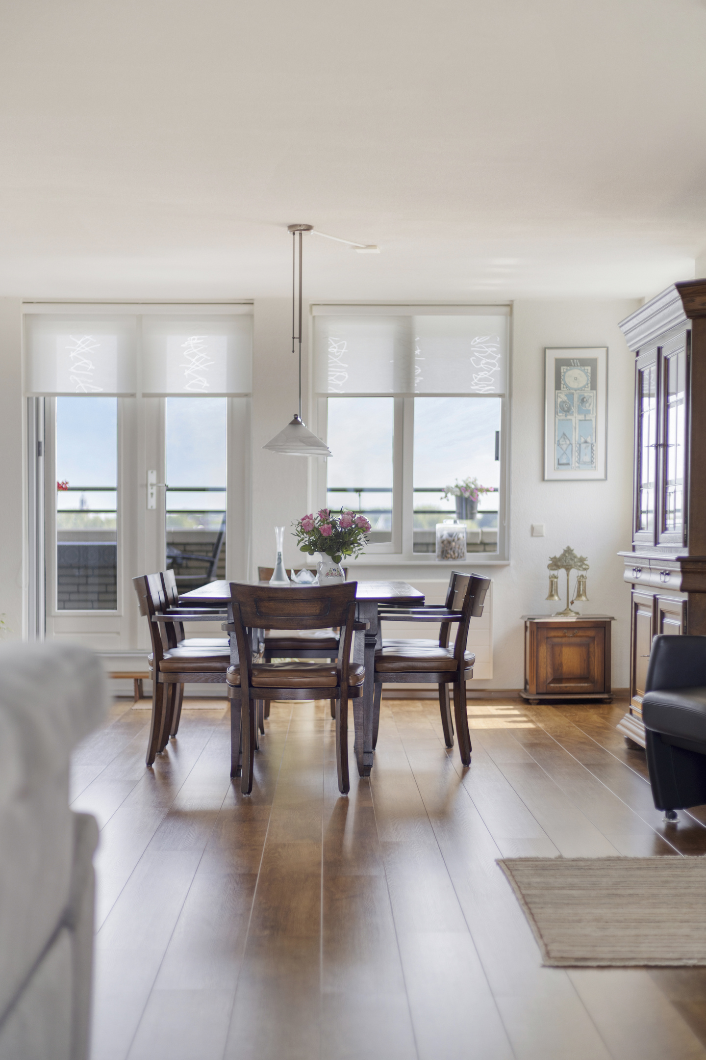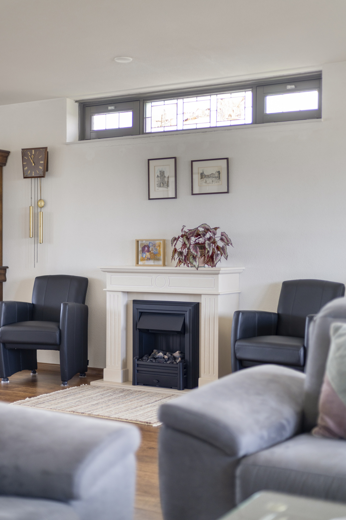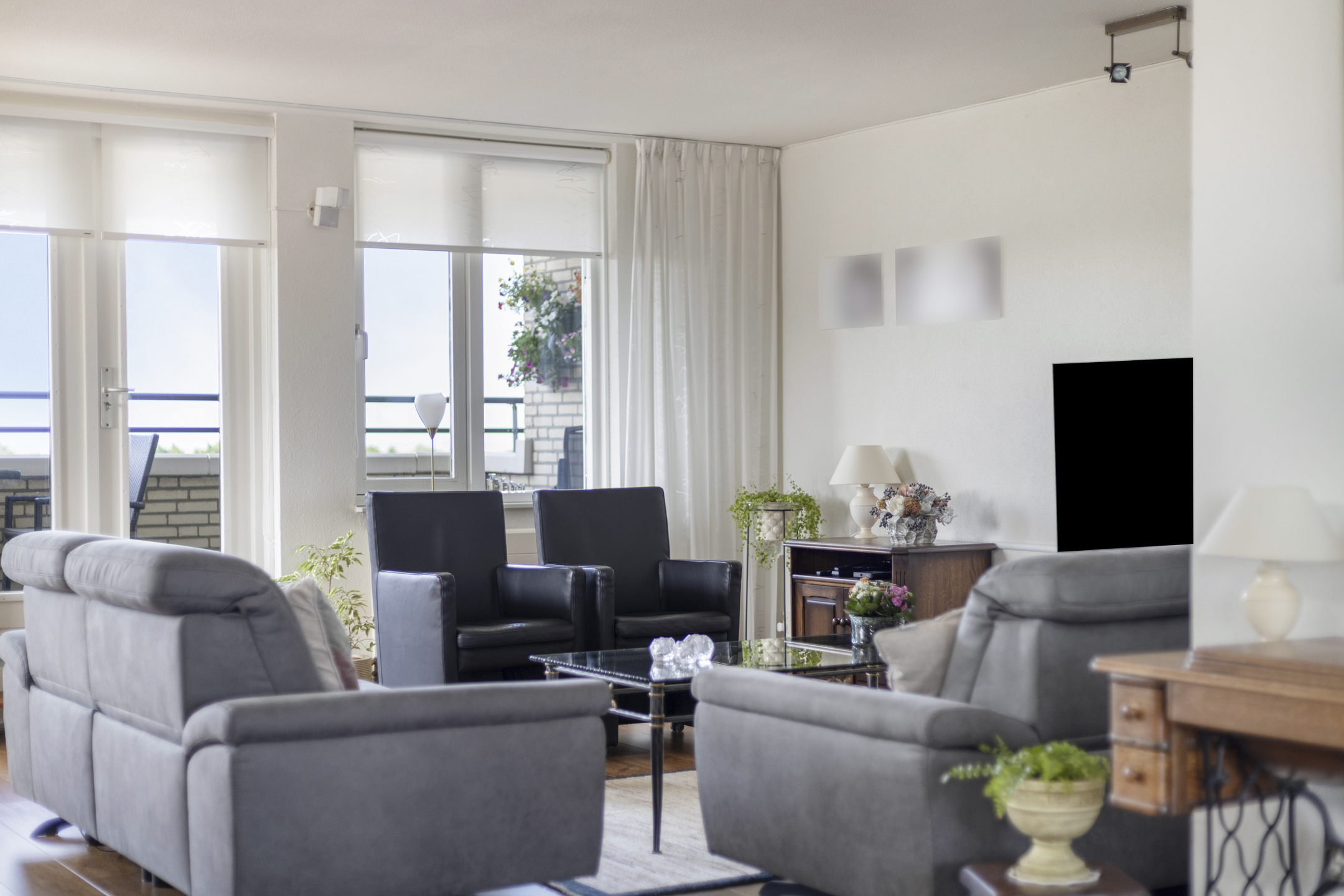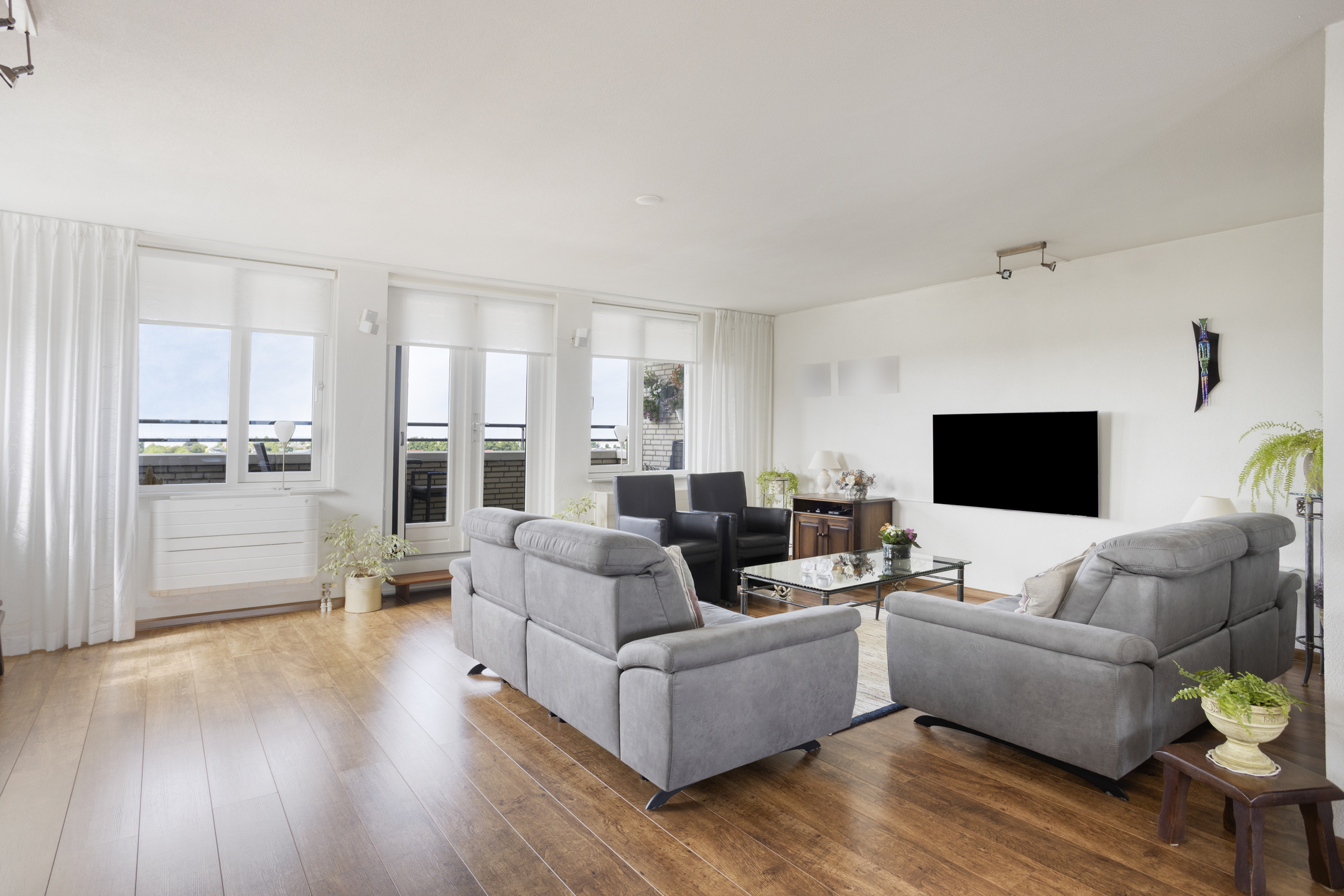 De woonkamer is bijzonder licht dankzij de grote raampartijen en is voorzien van een mooie vloer en een sfeervolle haard, wat zorgt voor een warme en uitnodigende uitstraling. Aansluitend aan de woonkamer bevindt zich een van de twee balkons, een heerlijke plek om in alle rust te genieten van het buitenleven en het weidse uitzicht.