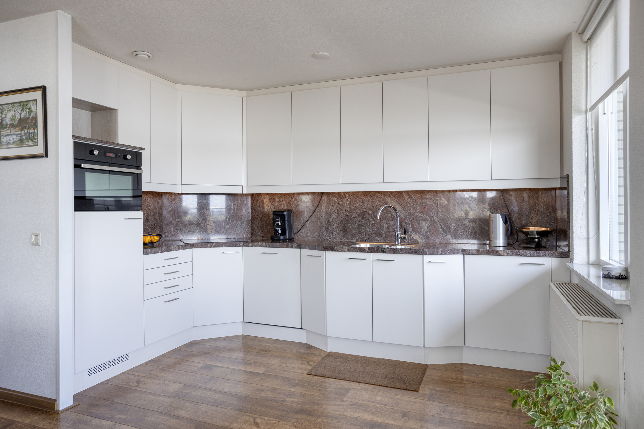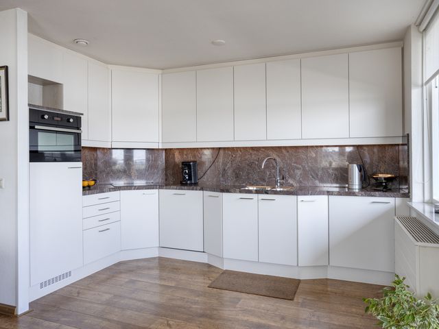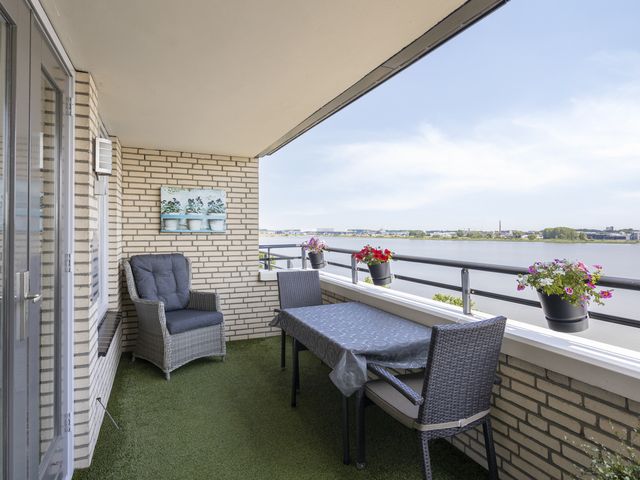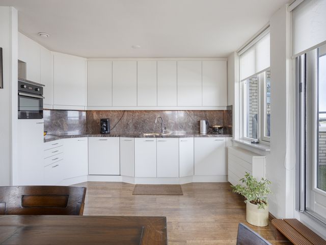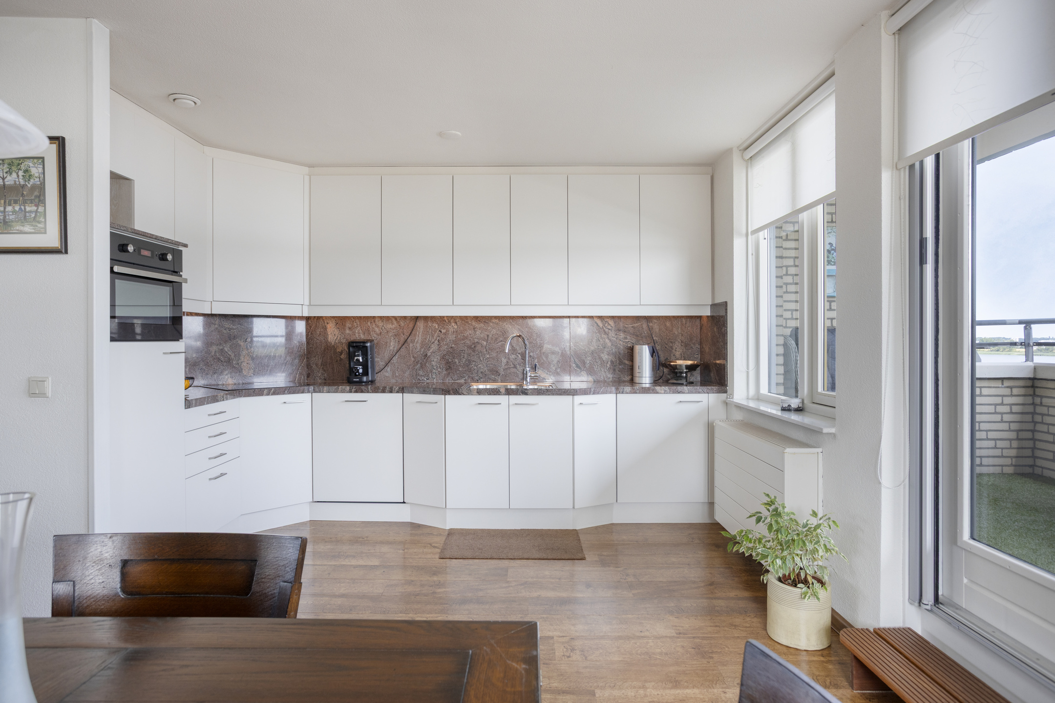 De open keuken grenst aan het eetgedeelte en biedt alle benodigde inbouwapparatuur, zoals een inductiekookplaat, vaatwasser, combi-oven en een ruime hoeveelheid kast- en lade-opbergruimte. Vanuit hier is er toegang tot het tweede balkon, wat zorgt voor een prettige lichtinval en een fijne plek voor bijvoorbeeld een ontbijt in de ochtendzon. Vanuit dit balkon kijkt u weids uit over de Binnenschelde.