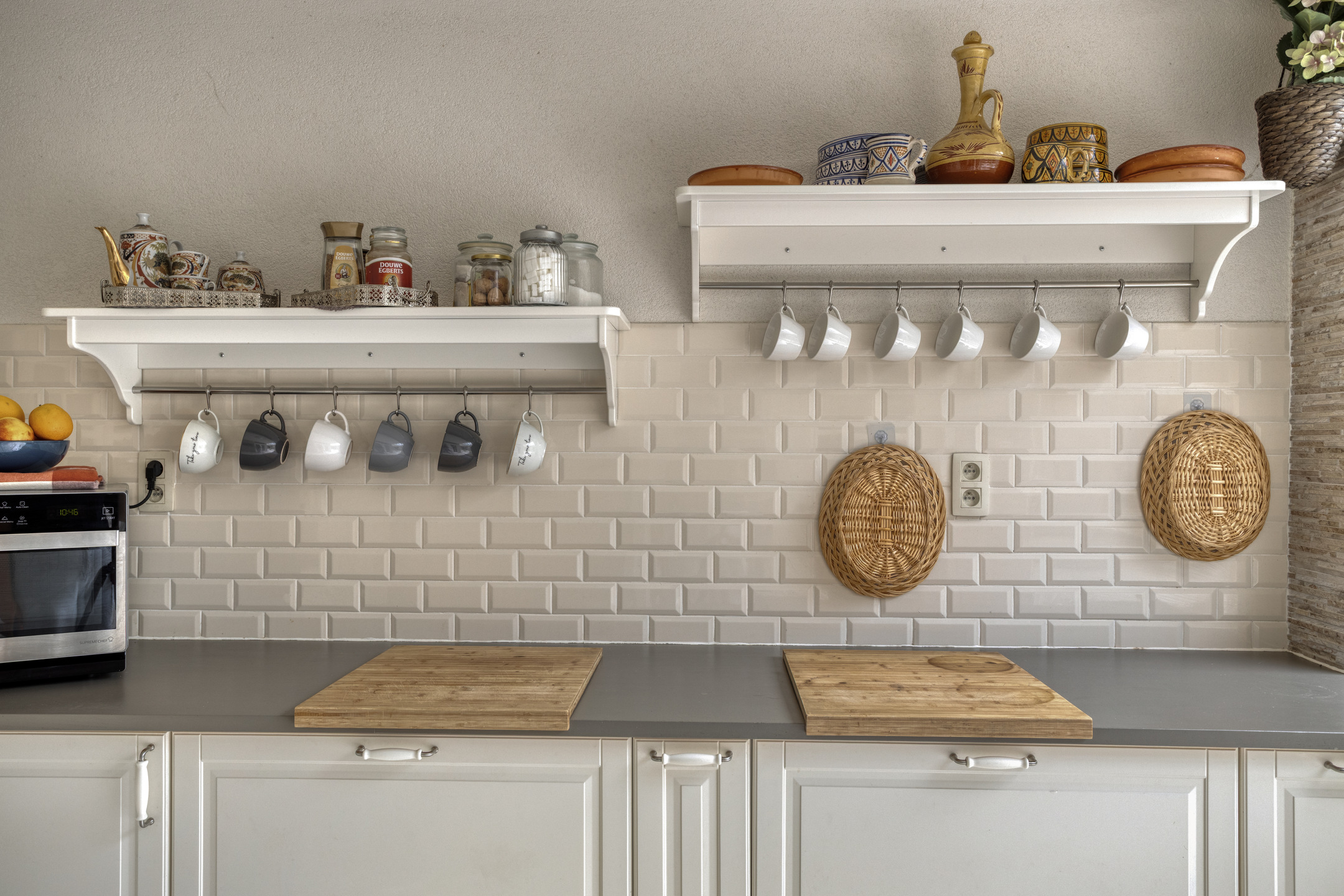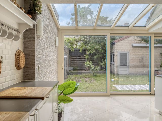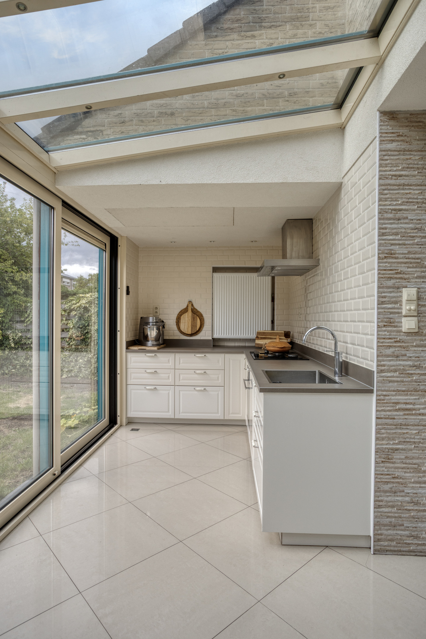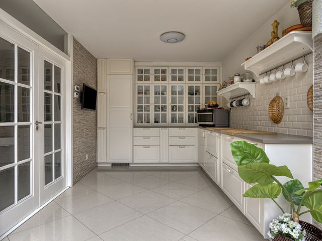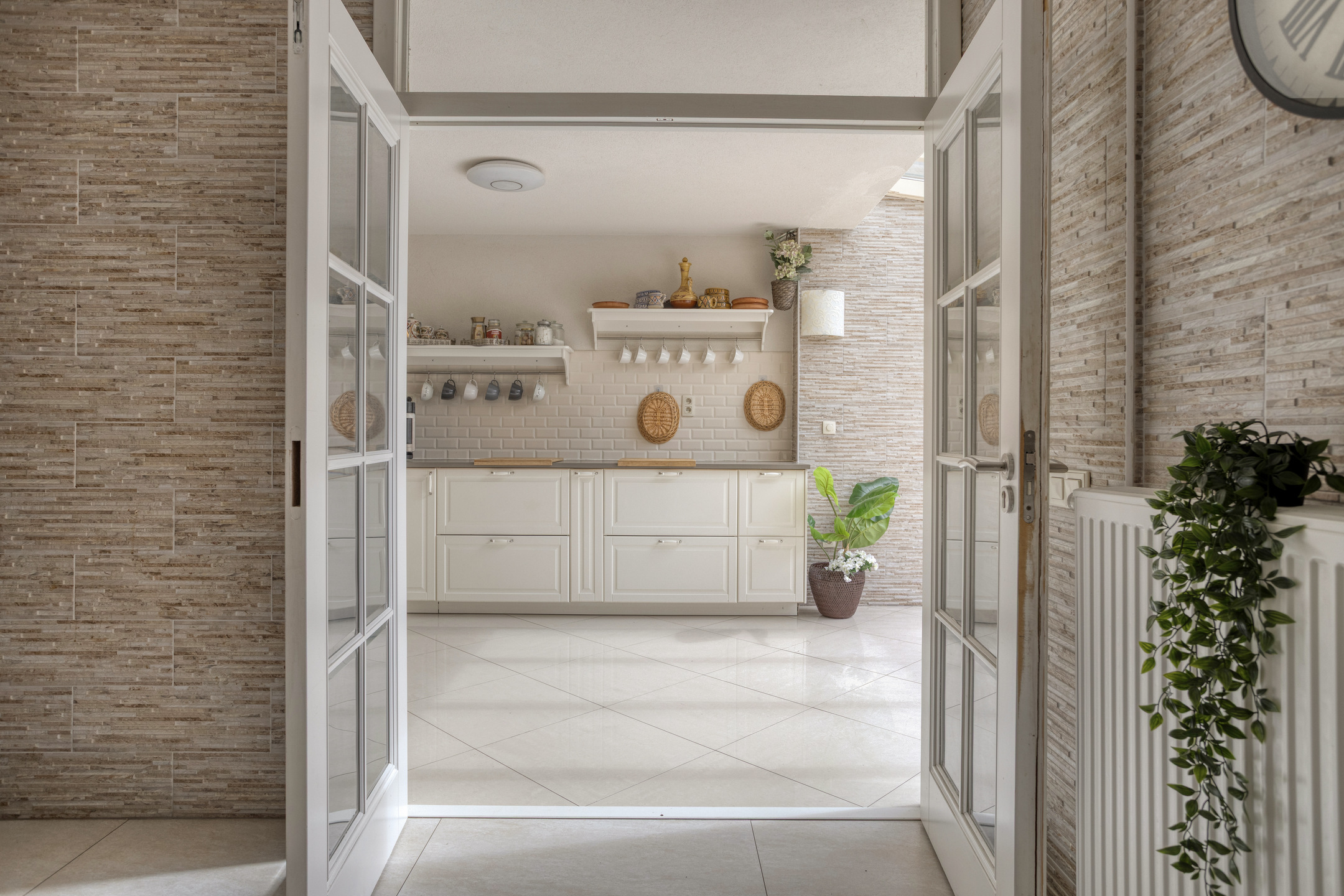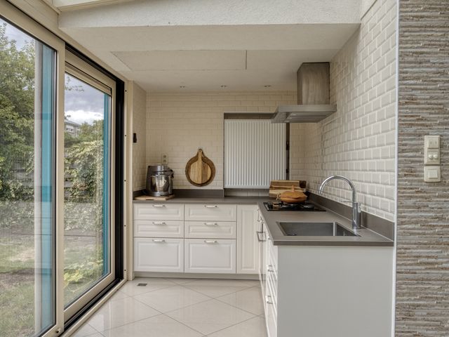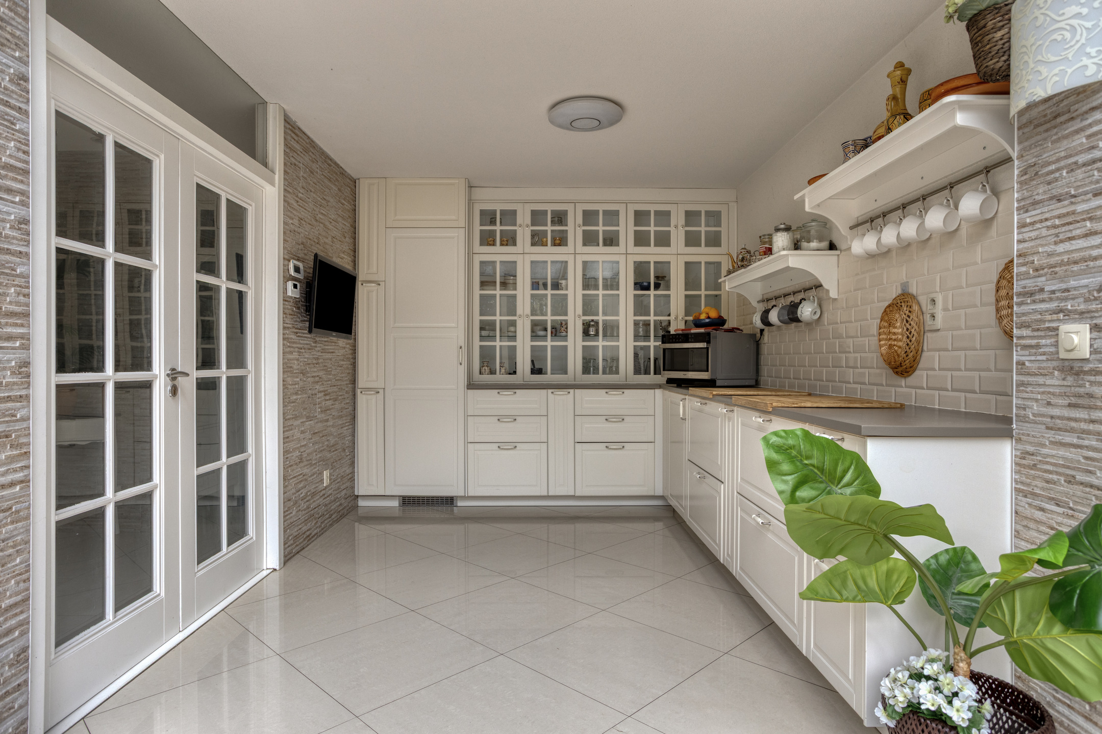 Via dubbele openslaande deuren bereikt u de bijzonder ingedeelde keuken met twee aparte keukenblokken, elk met hun eigen voorzieningen. Zo beschikt het ene blok over veel bergruimte, een vaatwasser en een koelkast, terwijl het andere is ingericht met een kookplaat, afzuigsysteem en spoelbak. Een echte leef-keuken met ruimte en potentie voor gezellige diners of uitgebreide kookavonden.