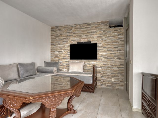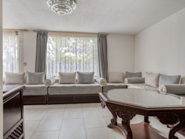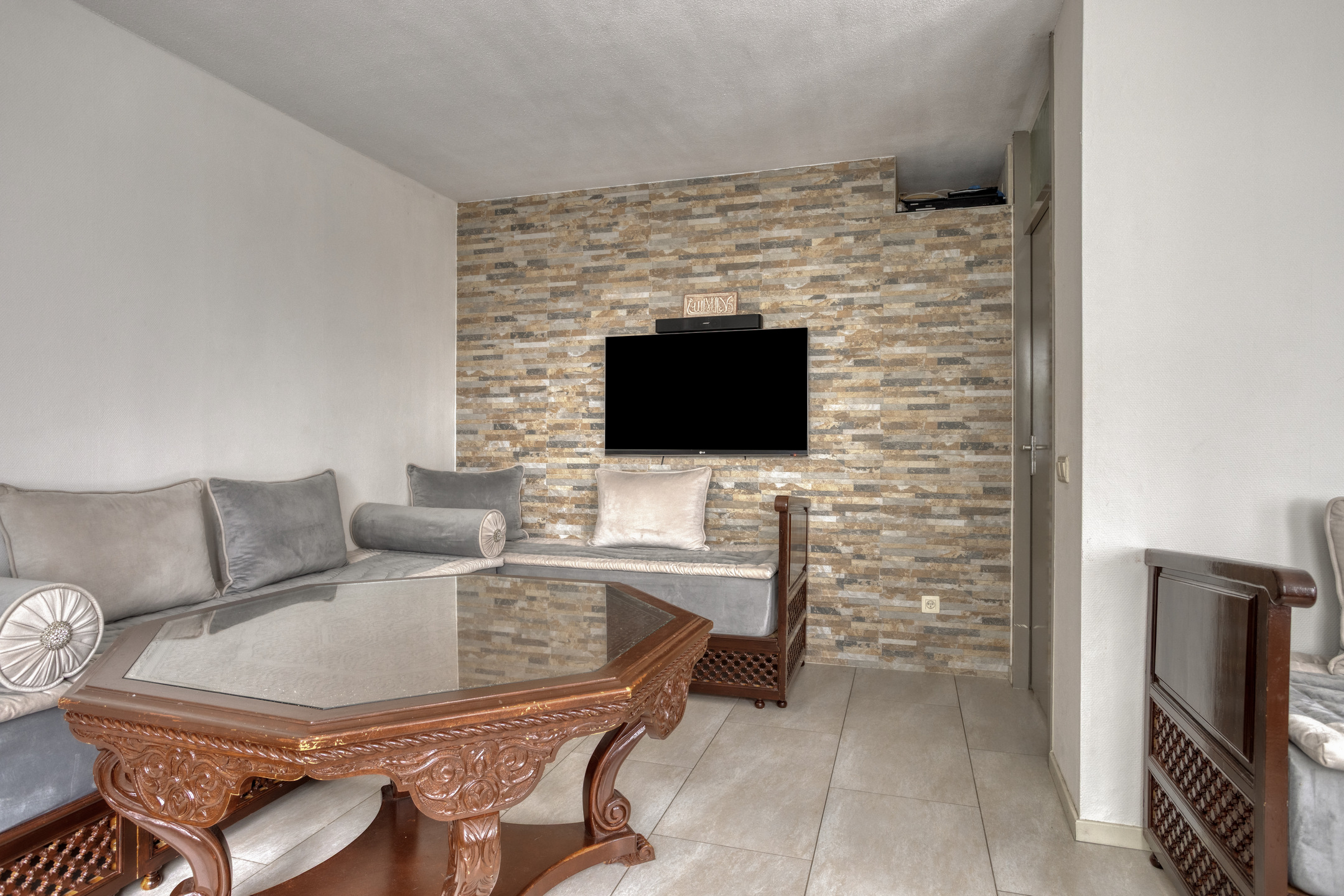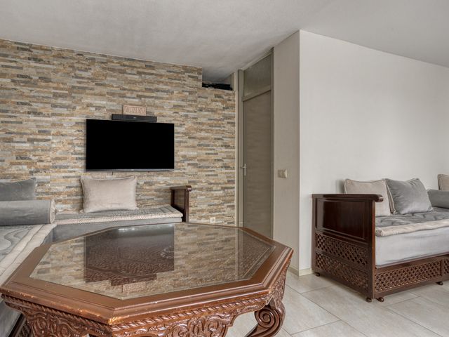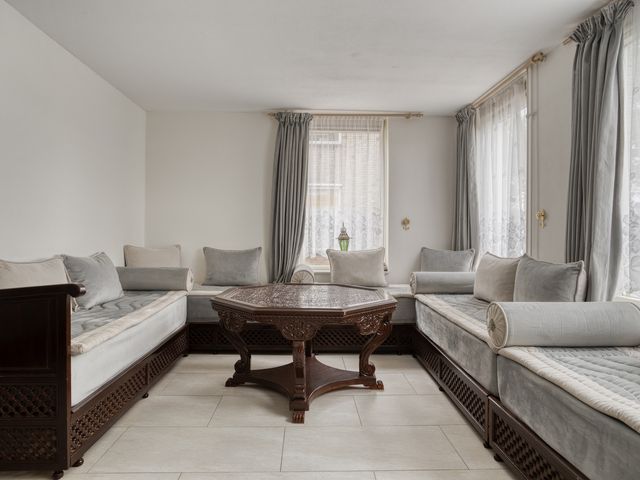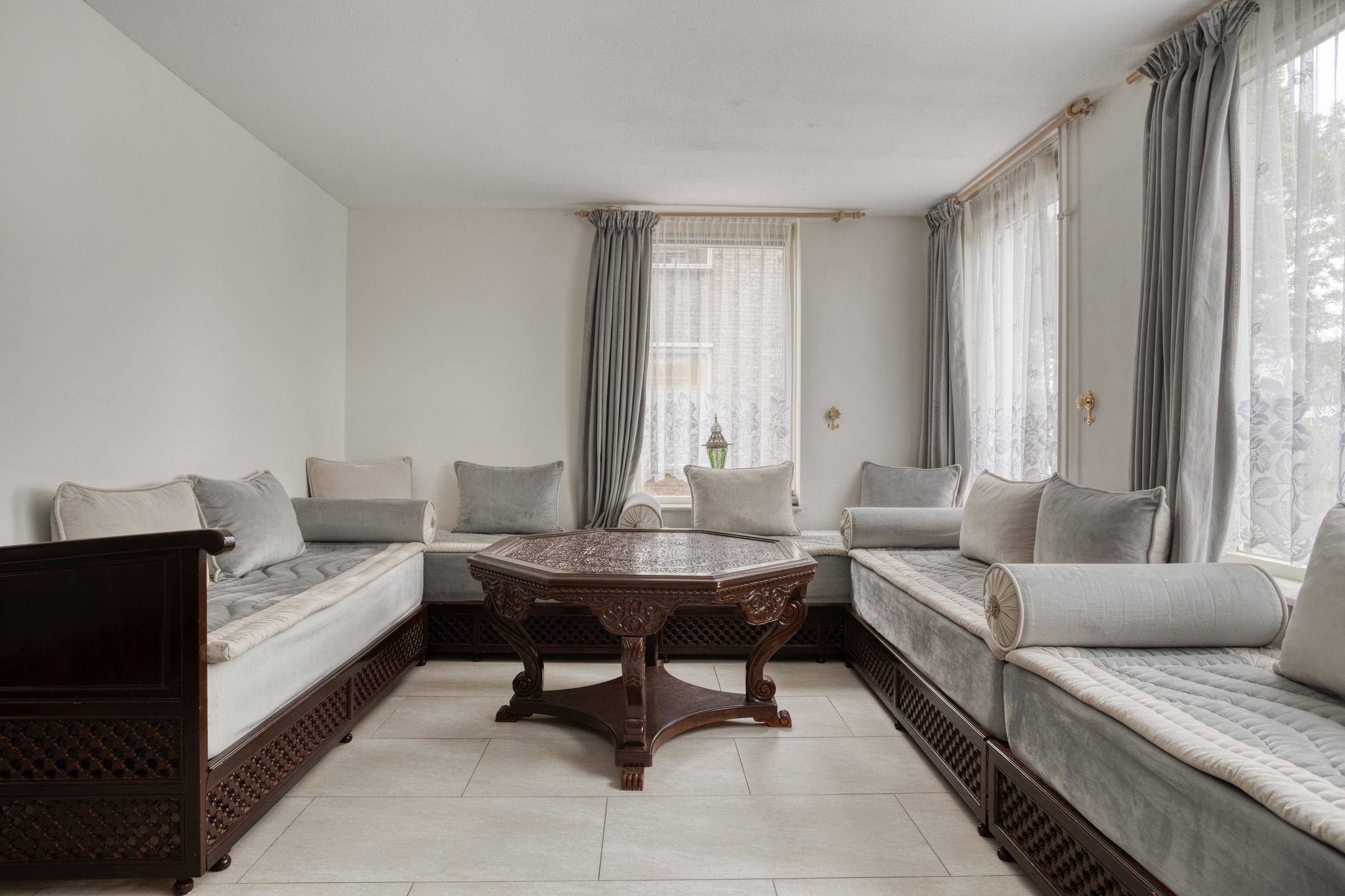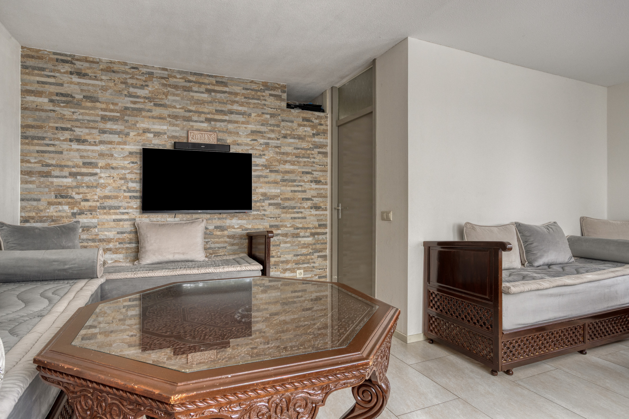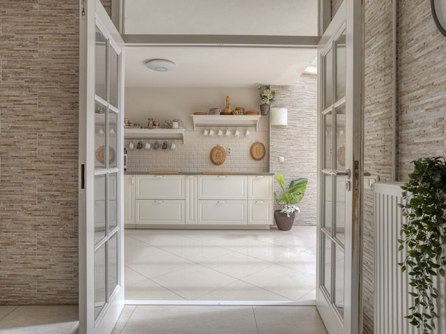 De woonkamer is gelegen aan de voorzijde van de woning en is royaal van formaat en voelt licht en ruimtelijk aan dankzij de grote raampartijen. De combinatie van stenen wanden en lichte plavuizen op de vloer geeft deze ruimte een warme, karaktervolle uitstraling.