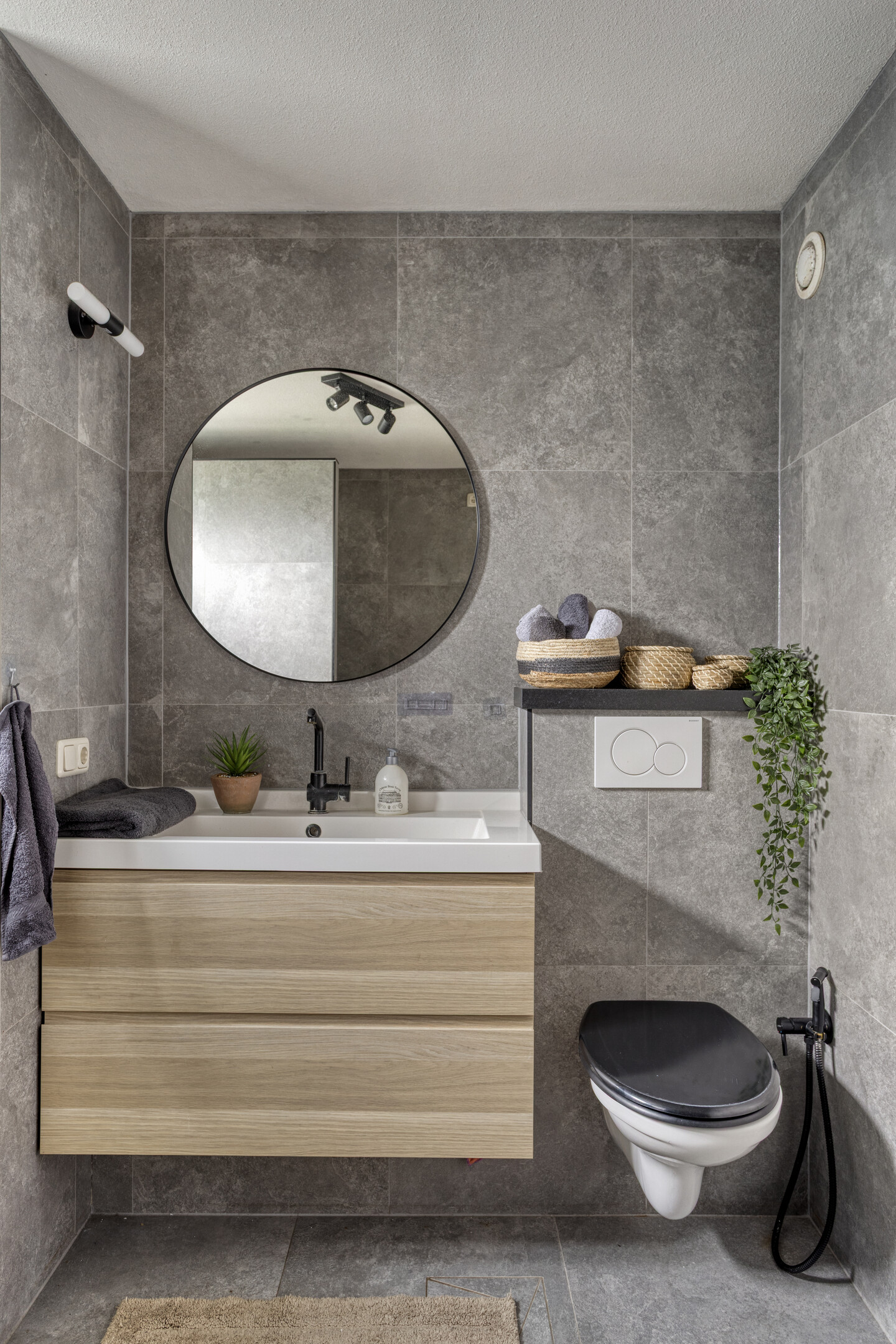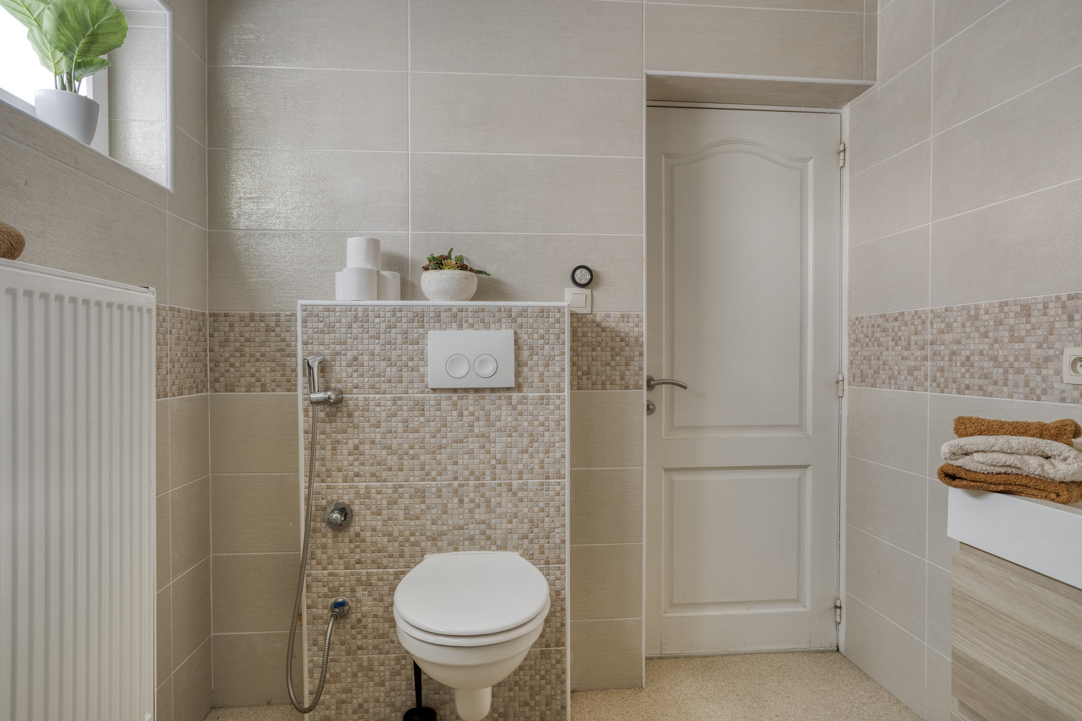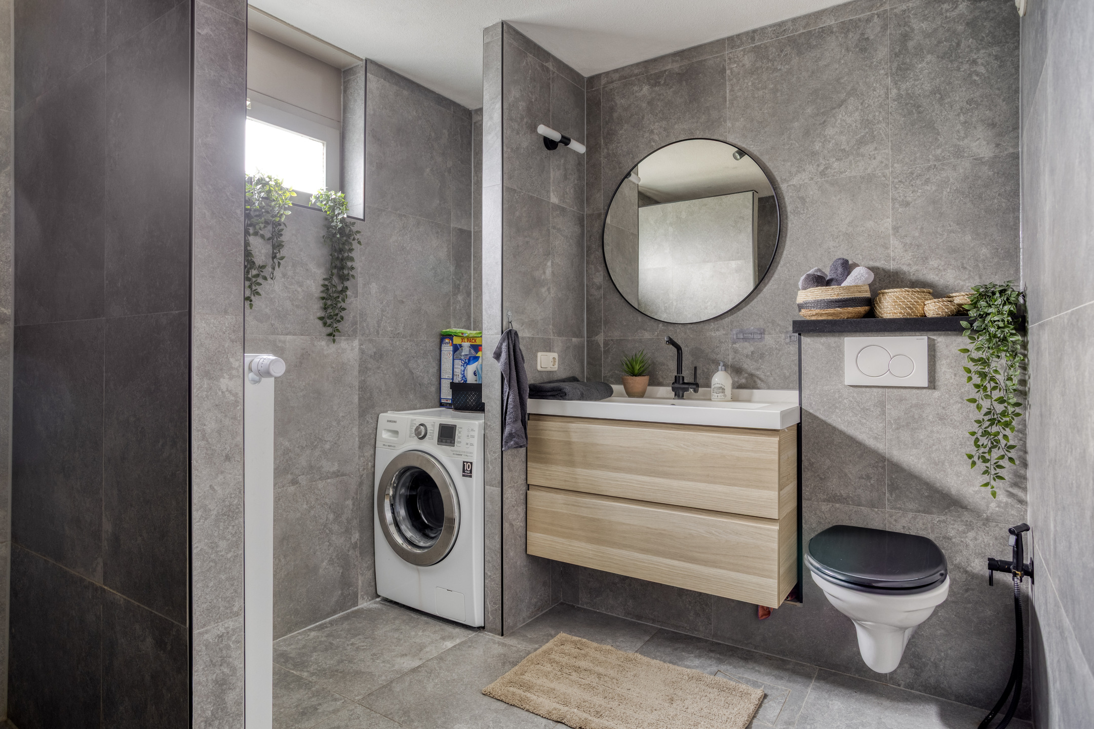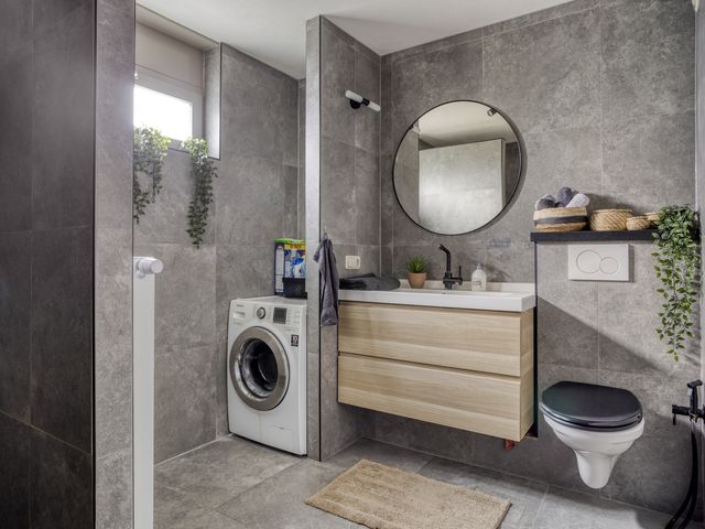 De badkamer (verbouwd in 2023) is praktisch ingericht met een inloopdouche, wastafelmeubel, toilet, designradiator en aansluitingen voor de wasmachine.