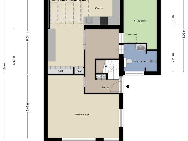 De wand tussen de woonkamer en de keuken kan worden verwijderd waardoor er een grote ruimte ontstaat als leefruimte.