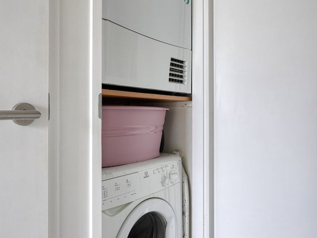Naast de badkamer bevindt zich de separate wasruimte met aansluitingen voor wasmachine en droger. Praktisch uit het zicht, maar direct binnen handbereik.