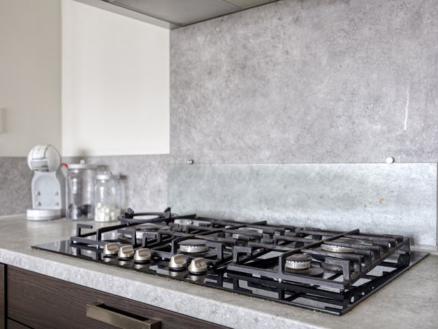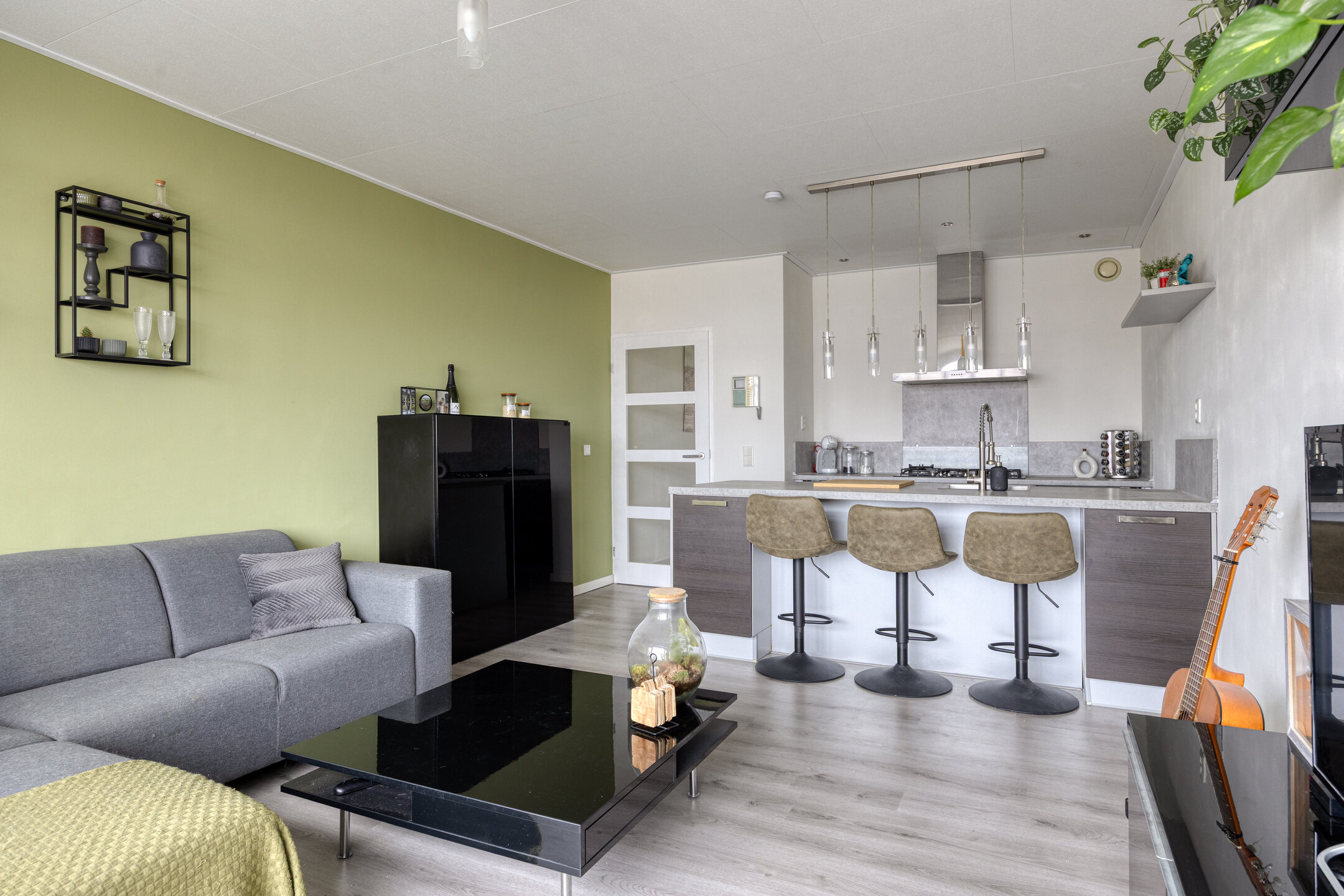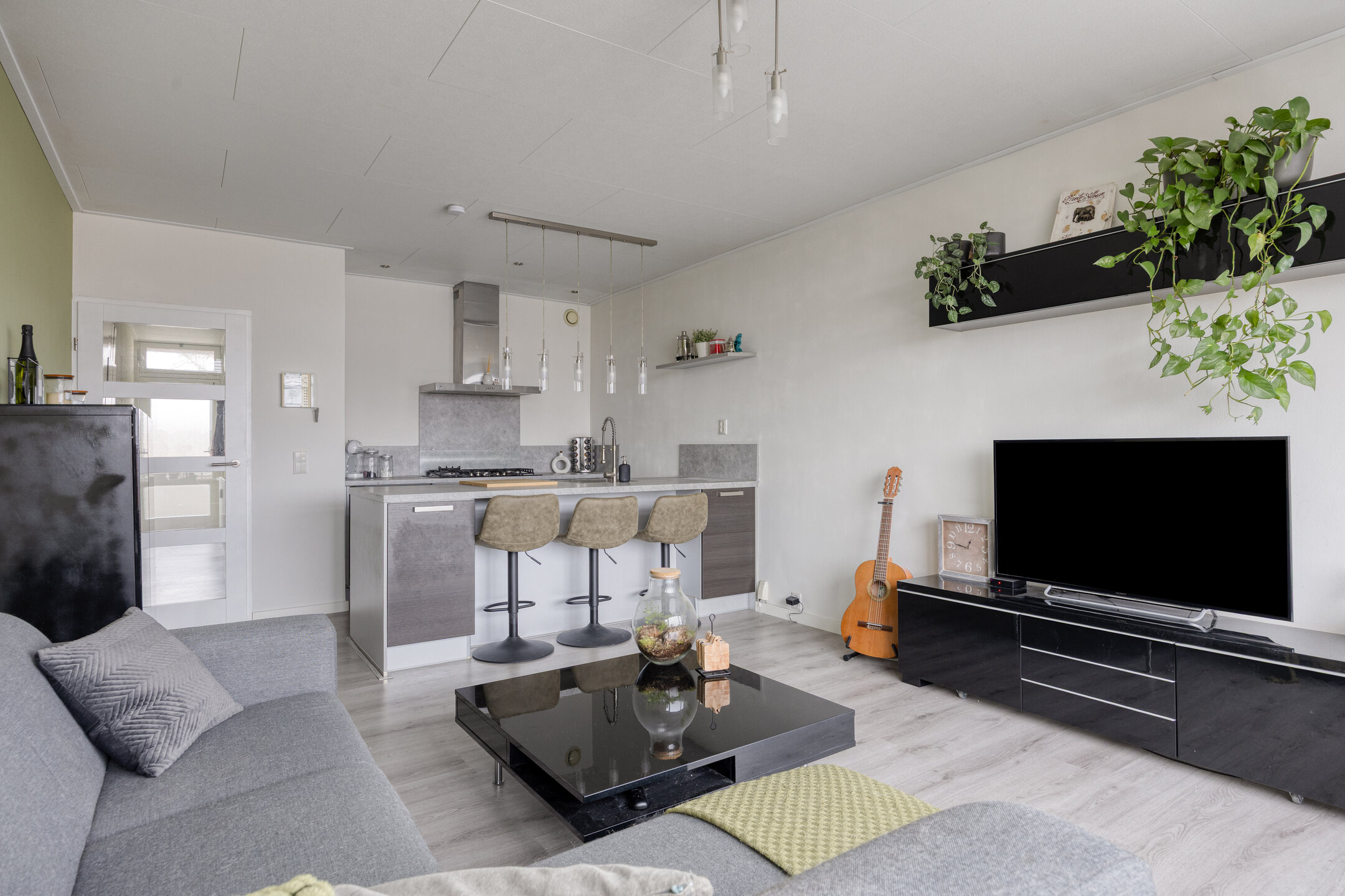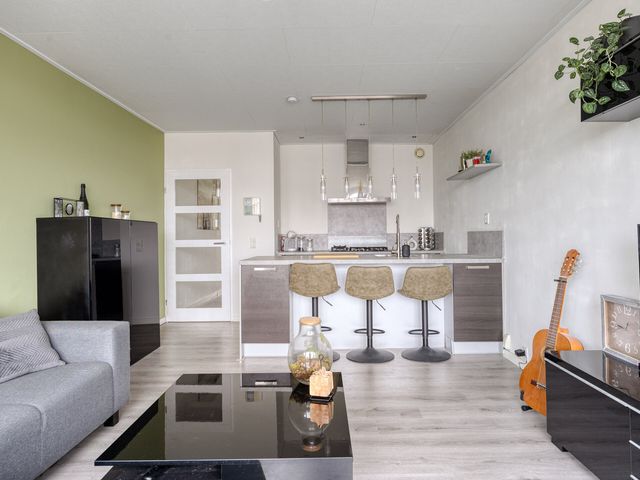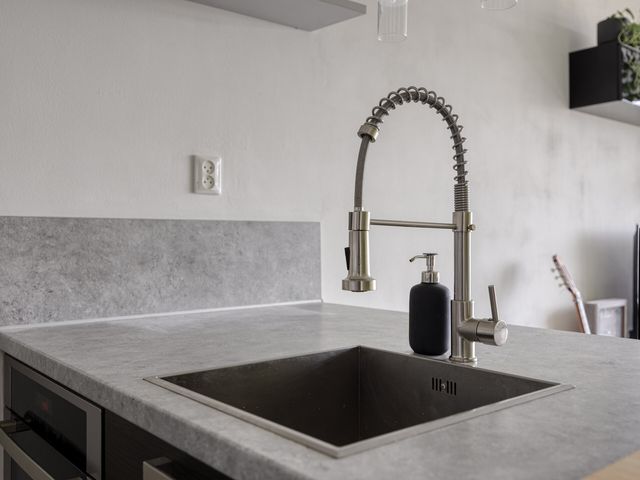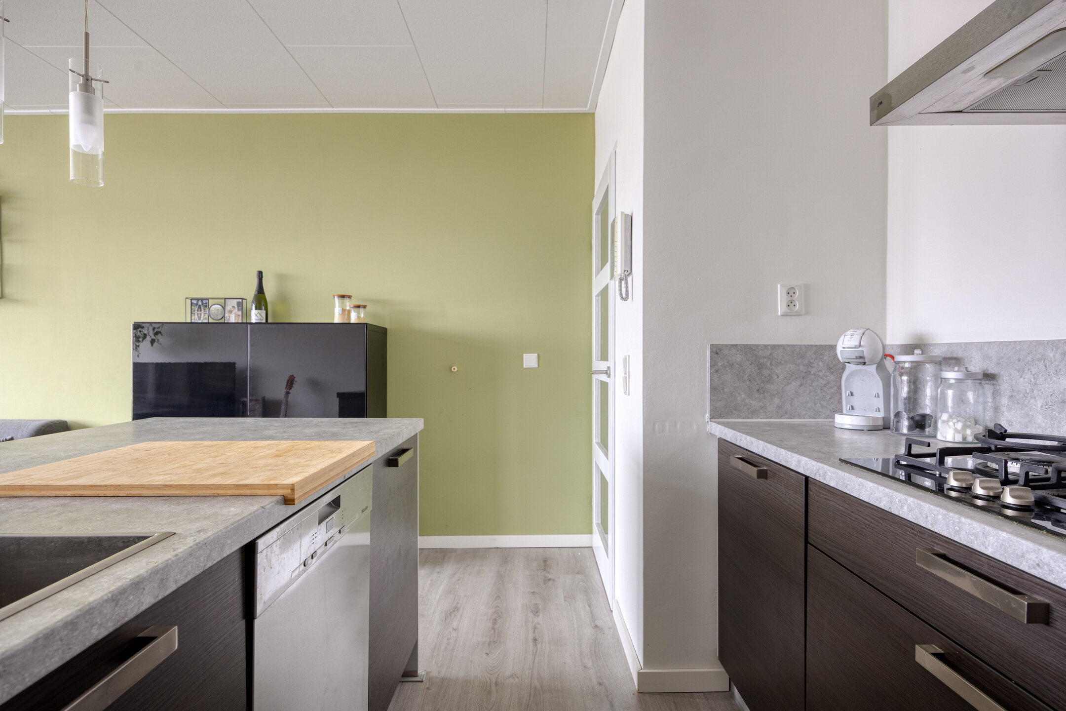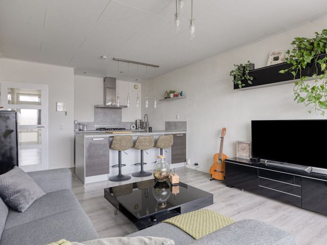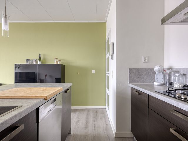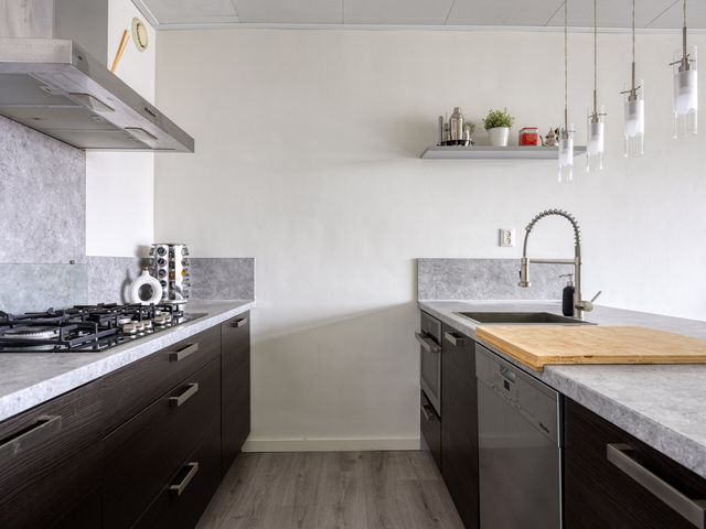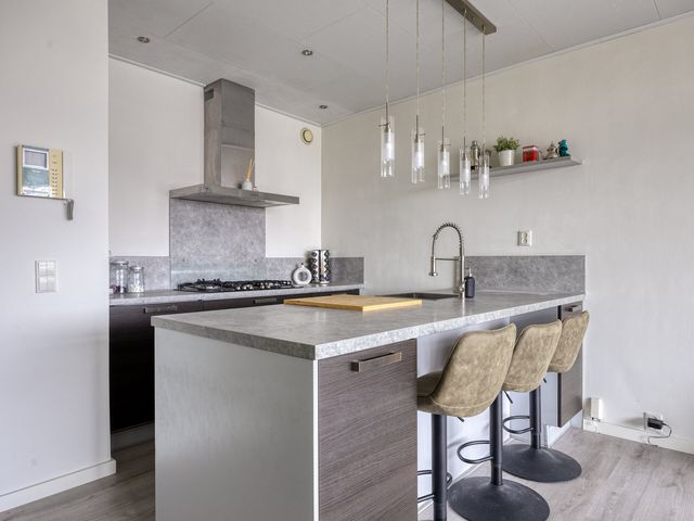 De woonkamer loopt naadloos over in de openkeuken, die direct in het oog springt. Deze parallel opgestelde inbouwkeuken met spoeleiland en baropstelling is uitgerust met een 5-pits gaskookplaat, een koelkast en vriezer, een combi magnetron/oven, een vaatwasser en een afzuigkap. De RVS spoelbak en het kunststof werkblad maken het geheel compleet. Het is een ideale plek voor kookliefhebbers én voor lange, gezellige avonden met vrienden of familie.