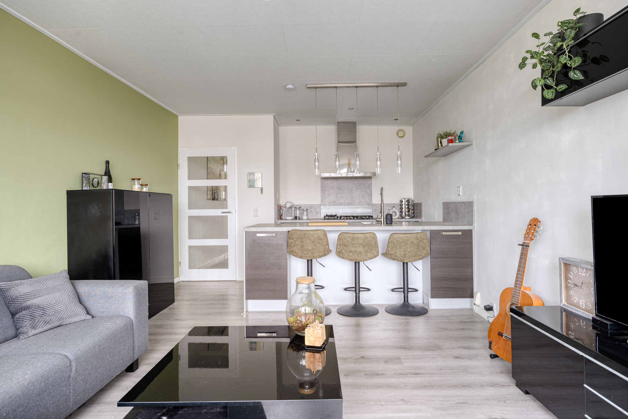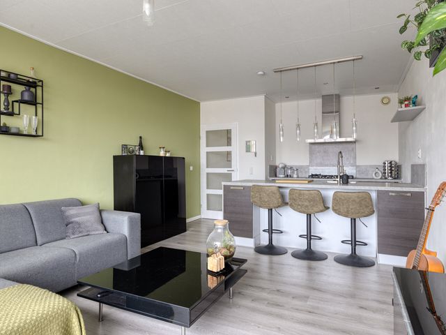 De woonkamer is gelegen aan de achterzijde van het appartement en profiteert van een brede raampartij over de volledige breedte, waardoor het daglicht rijkelijk naar binnen stroomt. Vanuit de woonkamer stap je zo het zonnige balkon op, een heerlijke plek om te ontspannen.