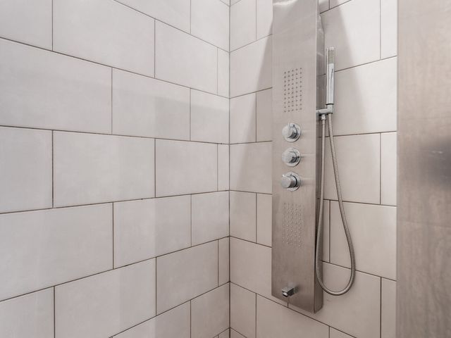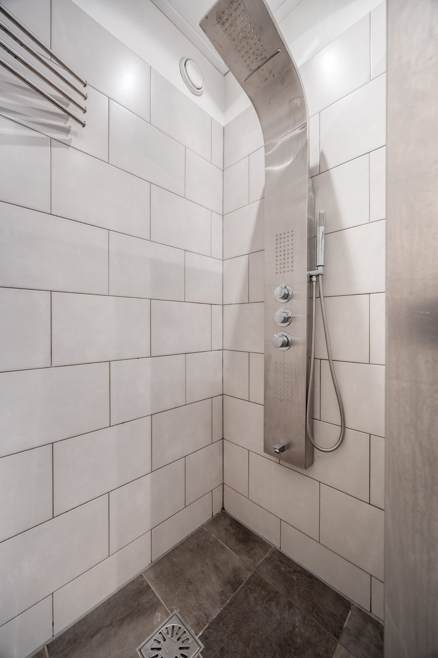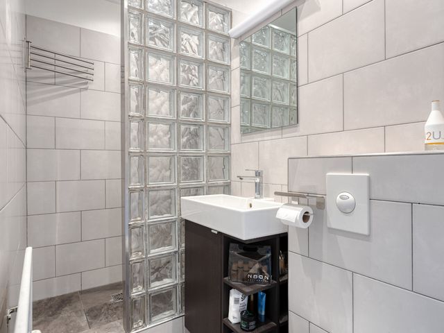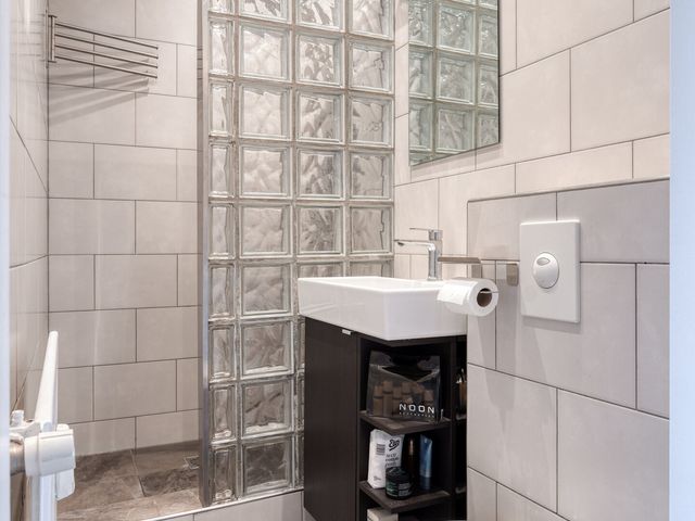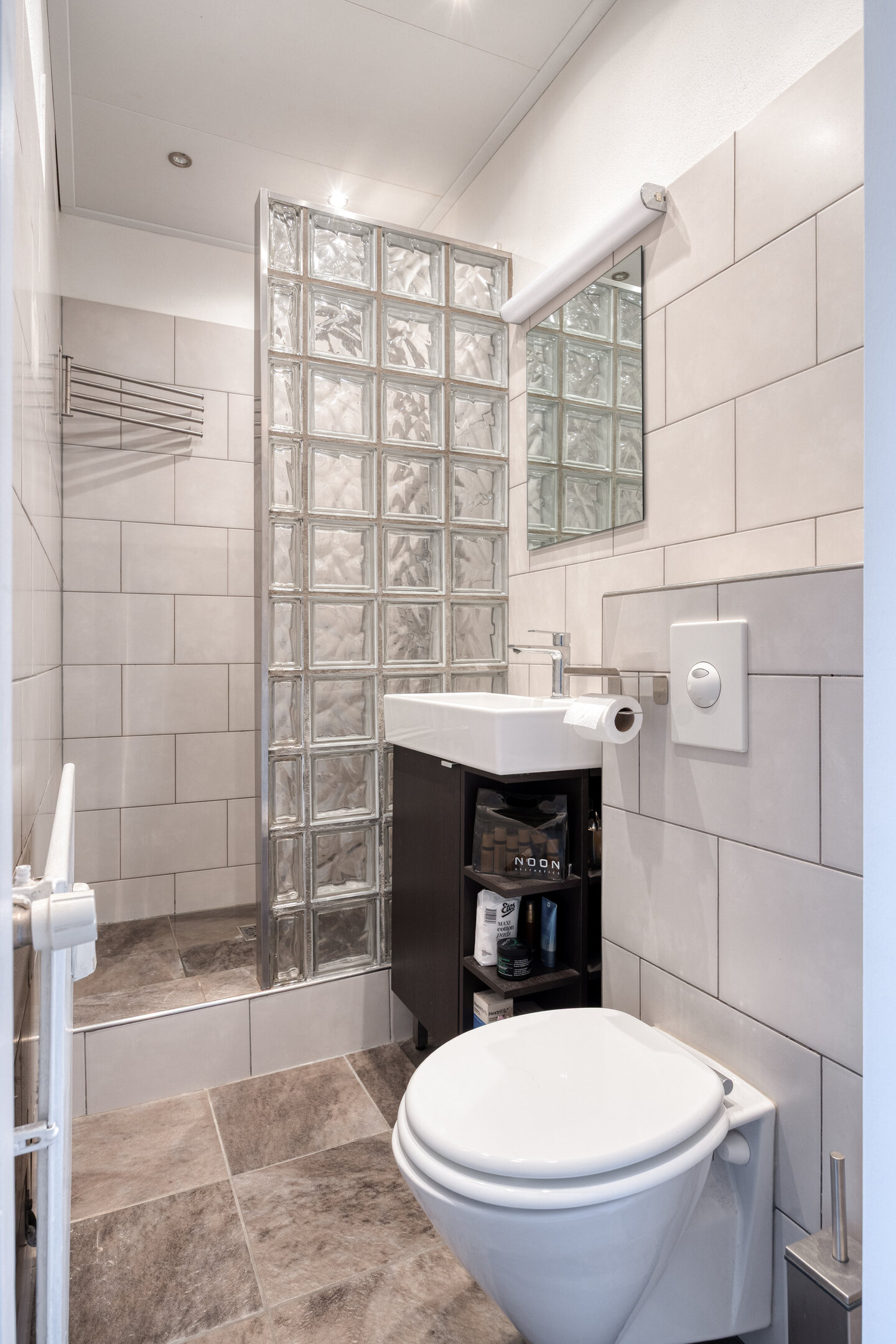 De badkamer is stijlvol afgewerkt en volledig ingericht. Deze ruimte beschikt over een inloopdouche met regendouche, een toilet en een wastafelmeubel.