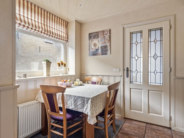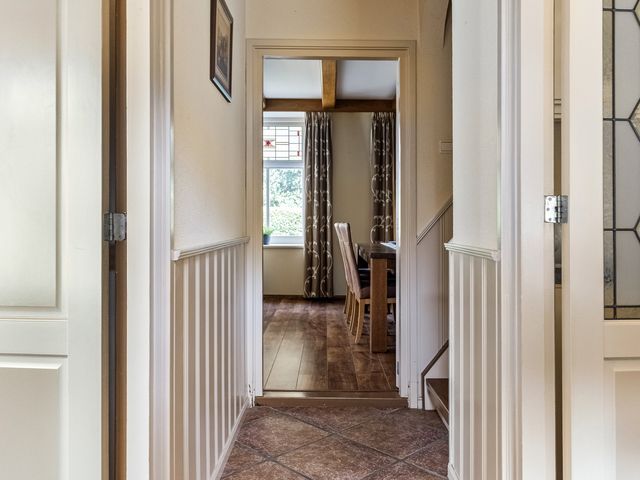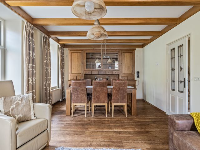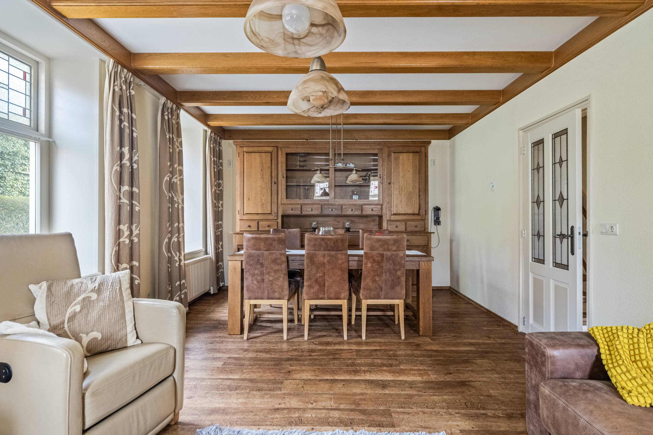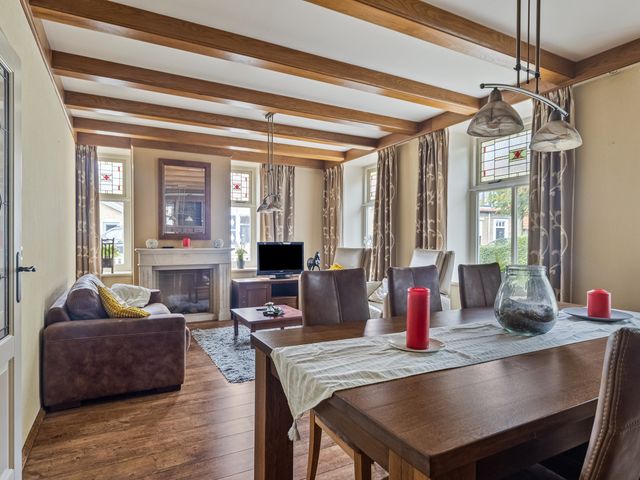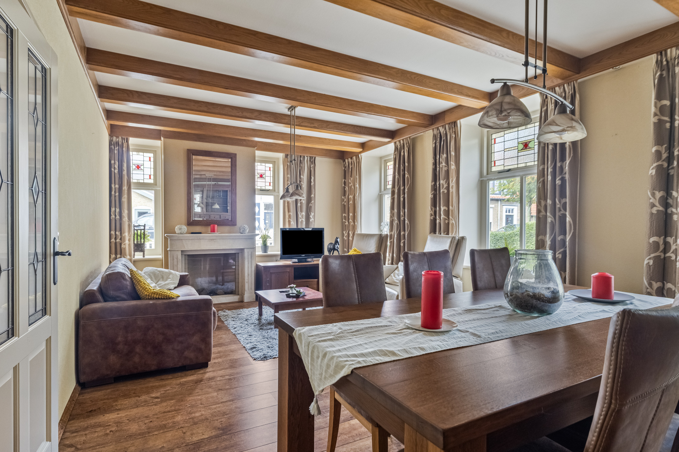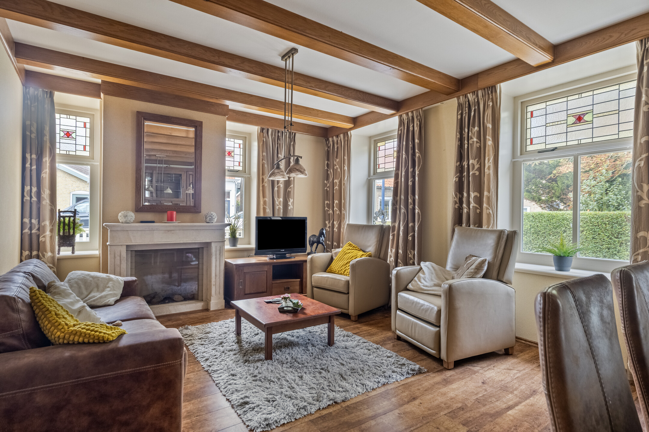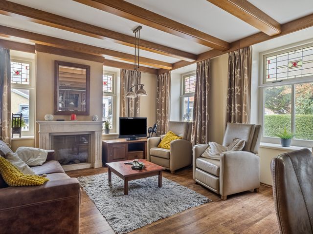 We starten in de woonkamer welke gelegen is aan de voorzijde van de woning, deze ruimte ademt pure gezelligheid en heeft een échte boerderij-uitstraling. De balkenplafonds, de karakteristieke glas-in-loodramen en de sfeervolle schouw met gashaard geven deze ruimte een warme, knusse sfeer. Het is de perfecte plek om na een lange dag te ontspannen, samen te genieten bij het haardvuur of om een gezellige avond met vrienden te beleven.