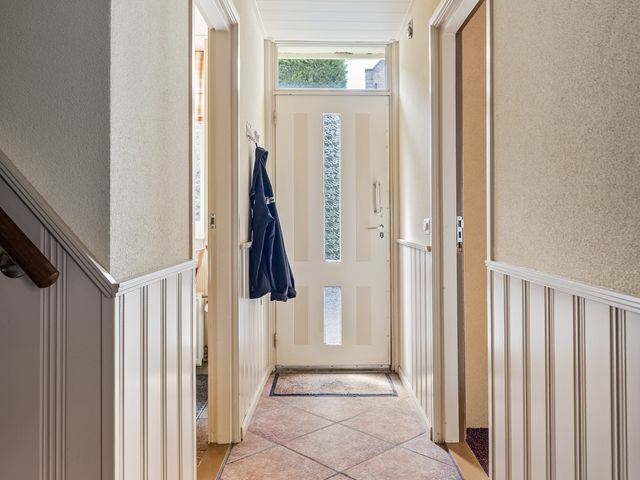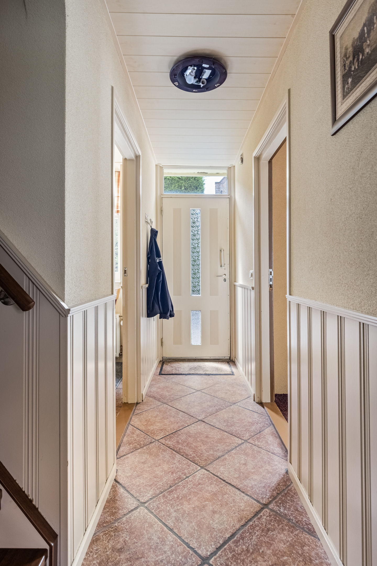 Binnenkomen voelt als thuiskomen. De entree van de woning vinden we aan de zijkant, de hal geeft toegang tot de woonkamer, woonkeuken, slaapkamer/kantoor op de begane grond en de trap naar de eerste verdieping.