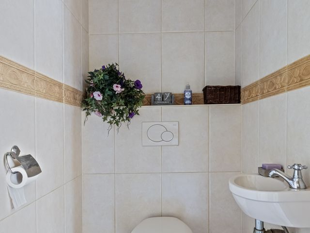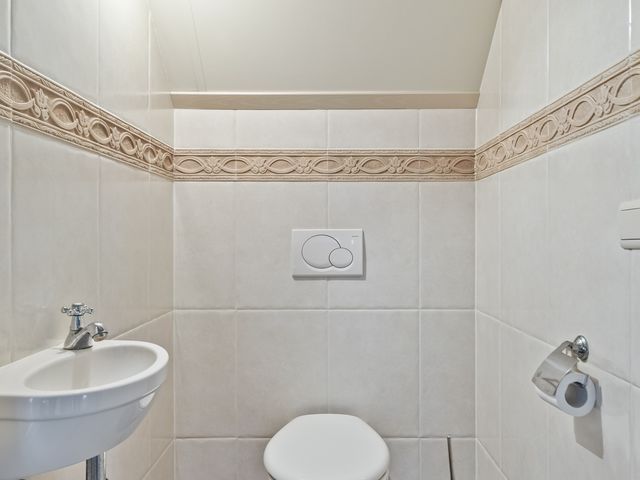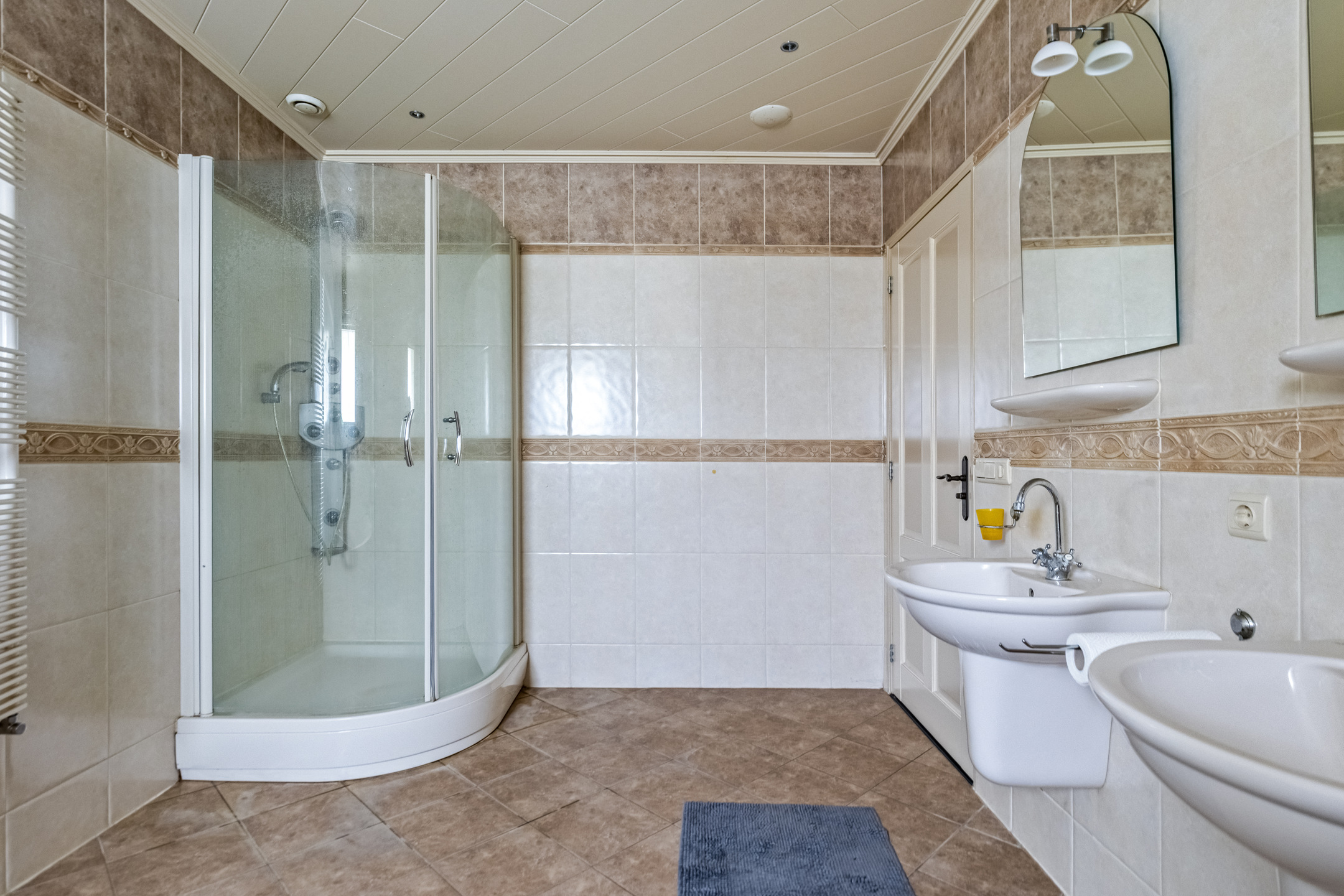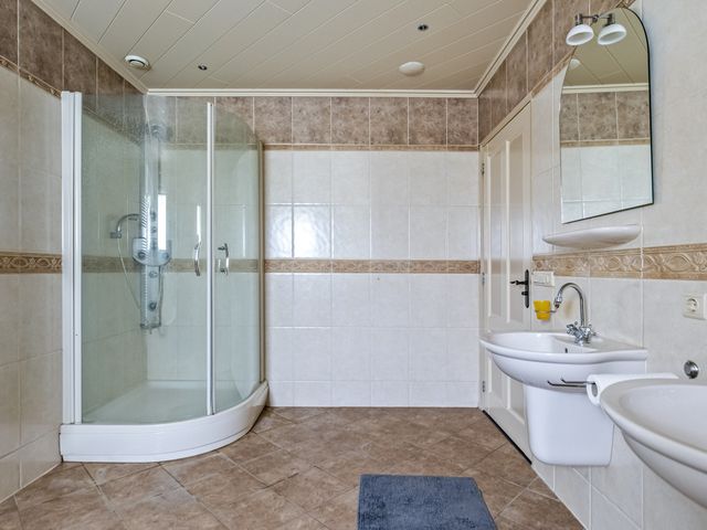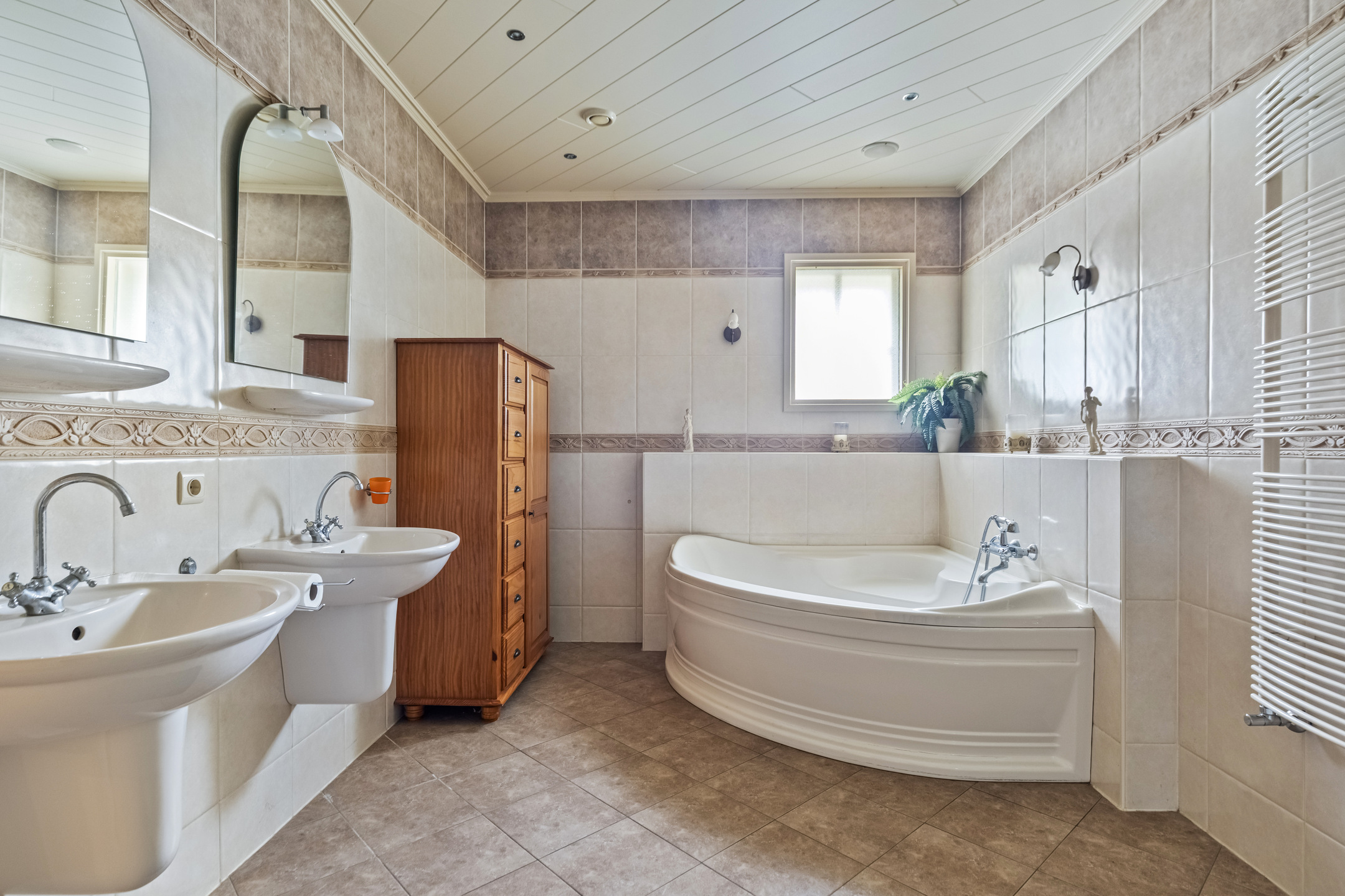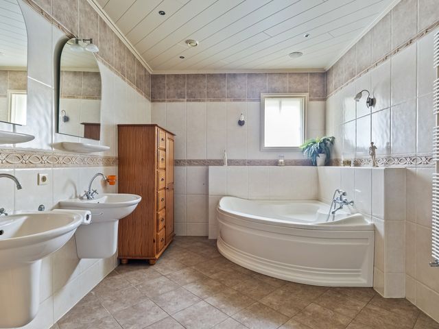 De badkamer is volledig betegeld en compleet uitgerust met een ligbad, douchecabine, dubbele wastafel en designradiator. Het bad heeft de voorbereidingen mee gekregen voor een jacuzzi. Tevens zijn er voorbereidingen genomen voor een sauna.
