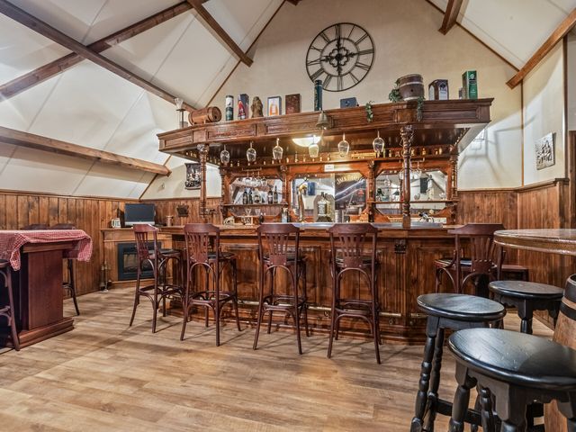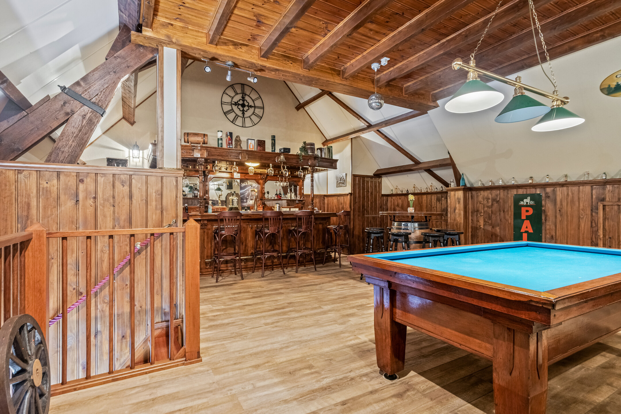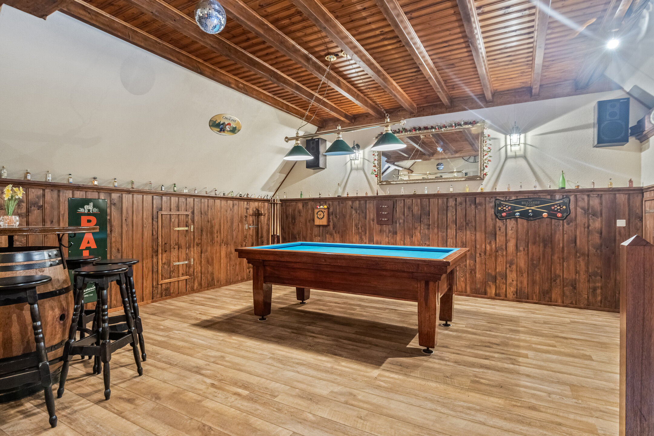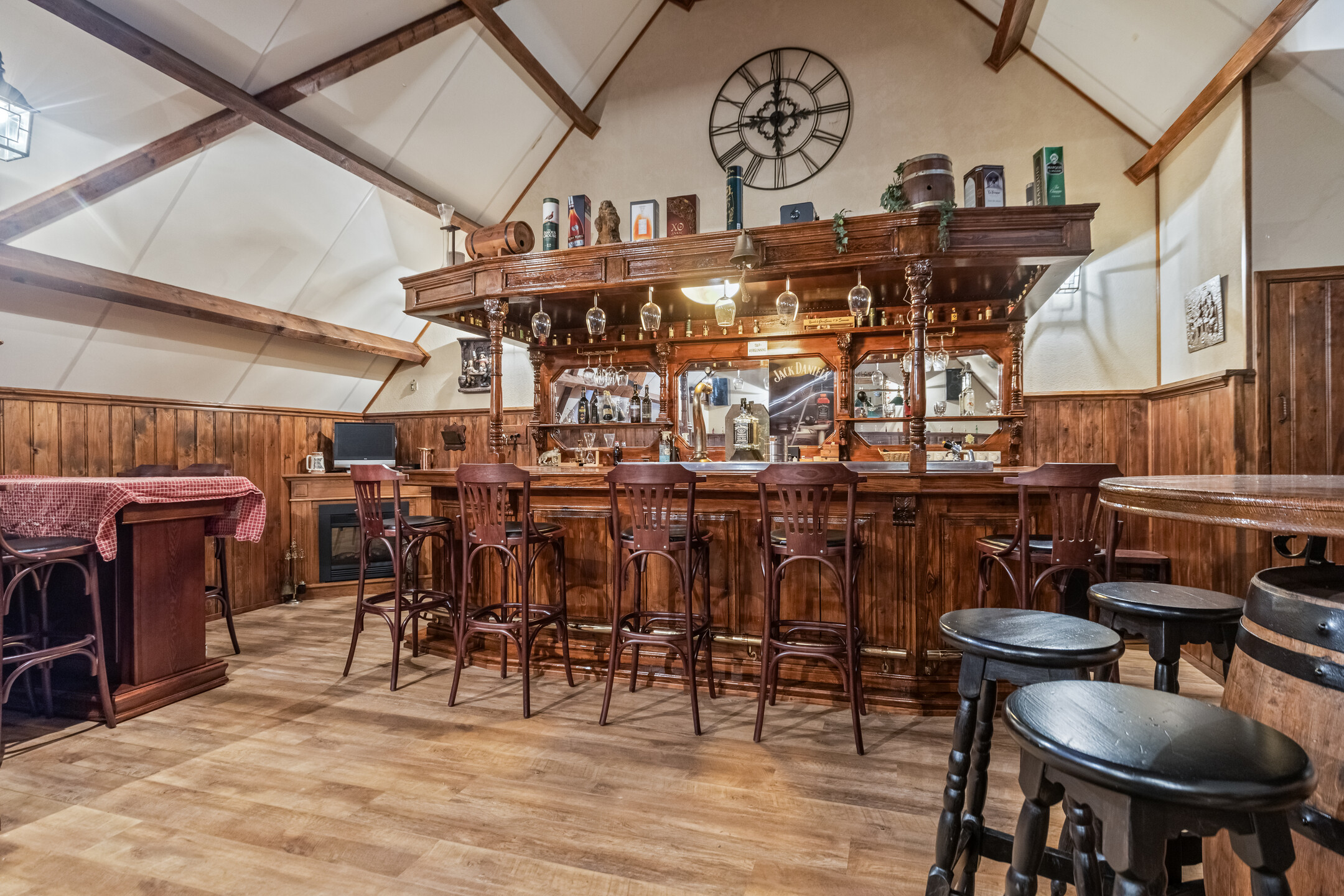 Terug naar de begane grond en het tweede gedeelte van de woning komen we terug in de tussenruimte die de twee gedeeltes van de woning scheidt. Een vaste trap leidt ons hier naar de eerste verdieping waar ons een hele gave ruimte wacht.... De perfecte ruimte voor het geven van feestjes en gezellige borrelavonden met een eigen bar met tap! Vooral de bar maakt de ruimte extra speciaal het prachtige maatwerk uit Egypte is een echte eyecatcher.
